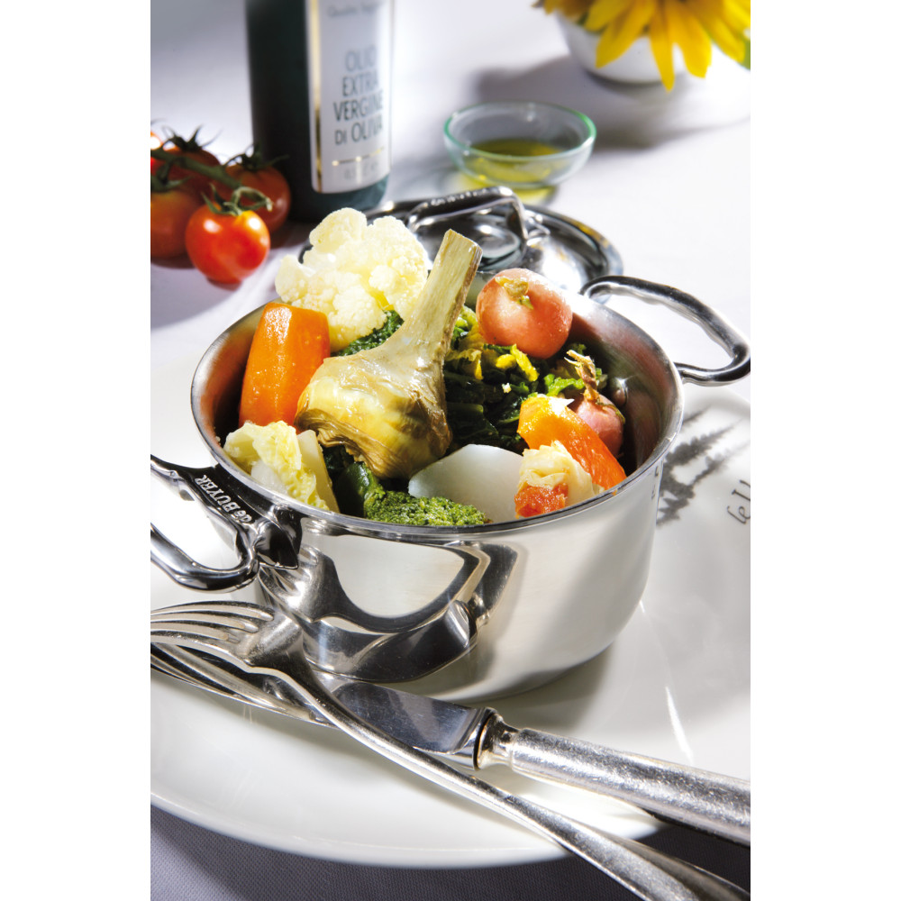 Garnek z pokrywą AFFINITY marki deBuyer wykonany jest z najwyższej jakości stali nierdzewnej i aluminium. Techniczne zalety korpusu naczynia skonstruowanego z pięciu warstw (tj. stal nierdzewna, aluminium, aluminium wzmocnione, aluminium, zewnętrzna stal nierdzewna kompatybilna z indukcją) doceniane są przez szefów kuchni na całym świecie.