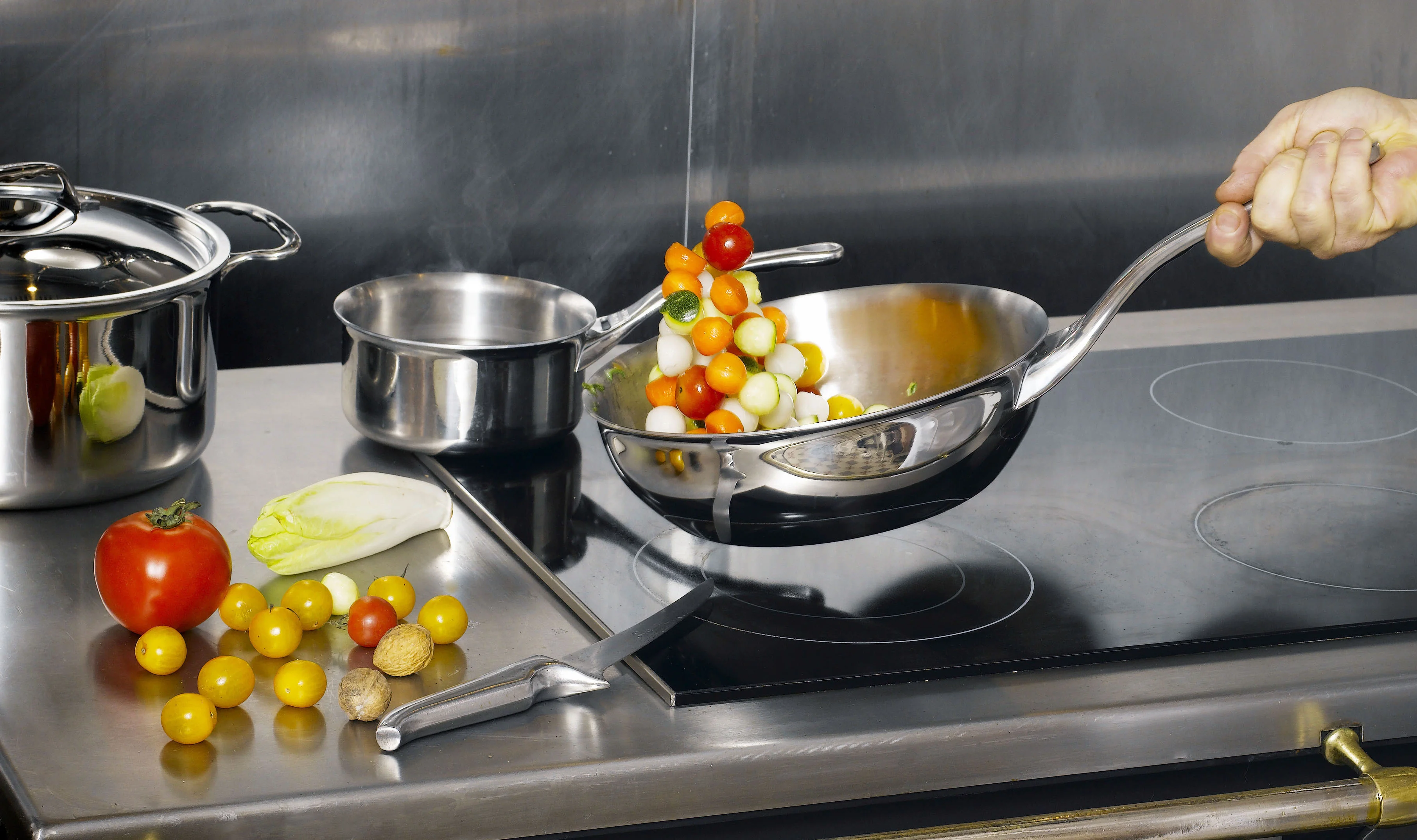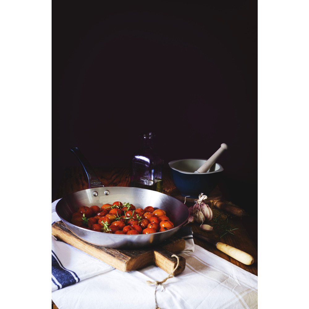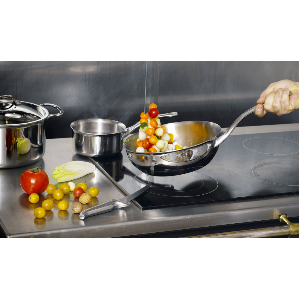 Monoblokowy korpus gwarantuje równomierne rozprowadzanie temperatury oraz bardzo precyzyjną kontrolę procesu gotowania, zbliżoną do tej, którą oferują tradycyjne naczynia miedziane. Taka budowa naczynia zmniejsza zużycie energii oraz i pozwala gotować potrawy z zachowaniem cennych witamin. Brzeg patelni typu Lyonnaise, umożliwiający łatwe zsuwanie się jedzenia do naczynia. Idealna do smażenia, grillowania, przyrumieniania i flambirowania.