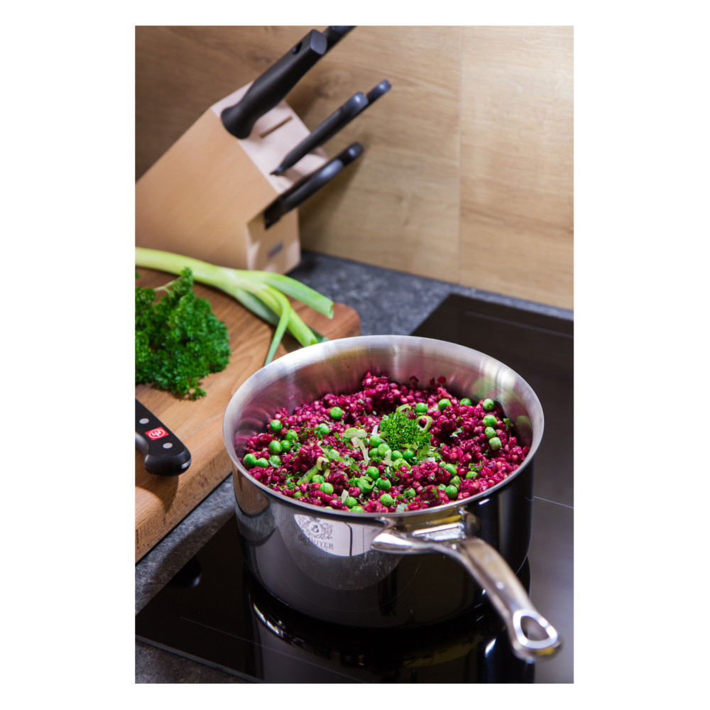 Konstrukcja naczynia jest wyposażona w system blokowania ciepła, który uniemożliwia nagrzewanie się uchwytu w czasie gotowania (rękojeść pozostaje chłodna - maksymalnie 29°C po 30 minutach podgrzewania). Ergonomiczna rączka jest solidnie przytwierdzona nitami, a wykończenie stali na wysoki połysk nadaje jej szczególnie elegancki wygląd. Pokrywki ze stali umożliwiają gotowanie przy minimalnym użyciu wody, co jest niezwykle korzystne dla zdrowia.