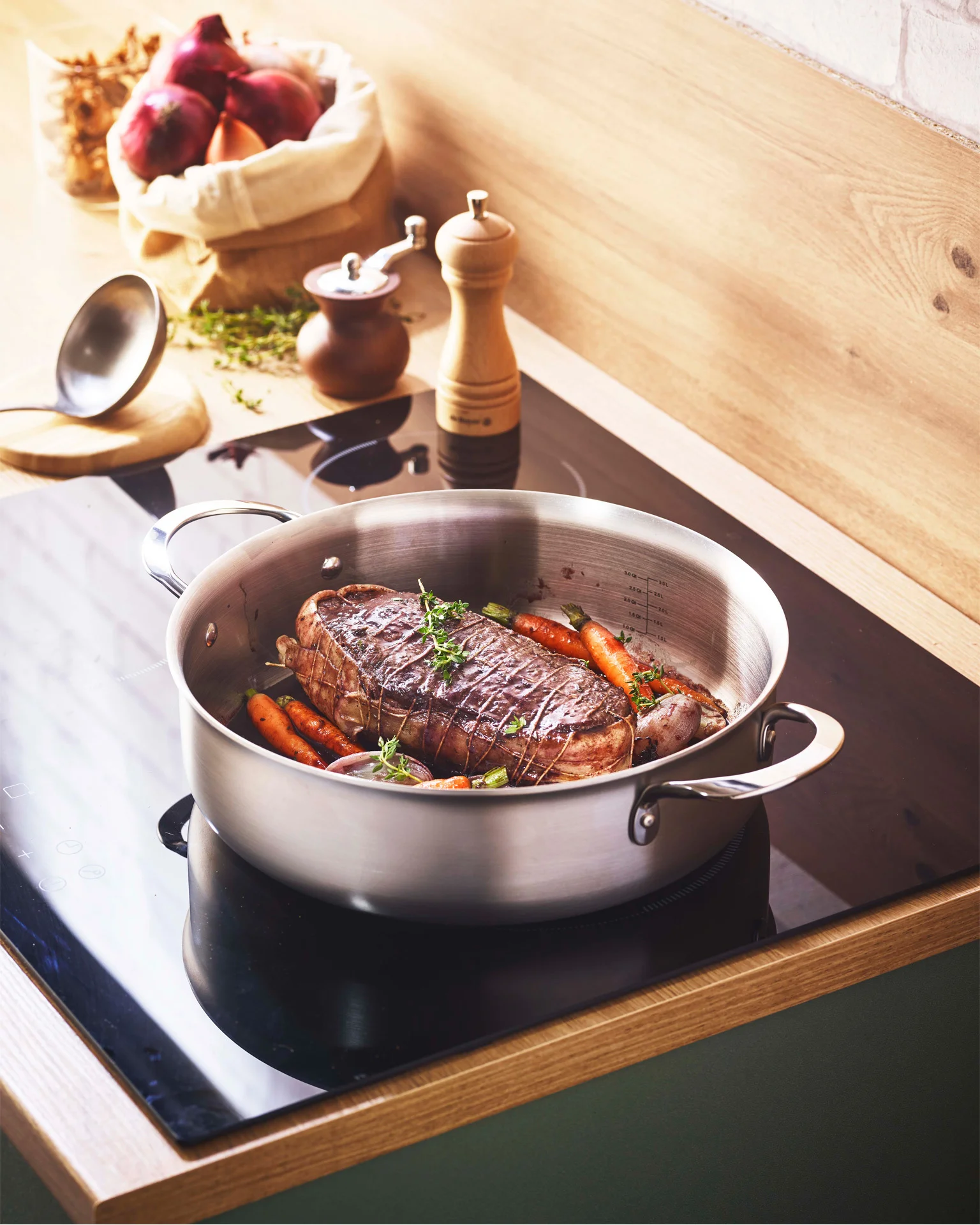 Monoblokowy korpus gwarantuje równomierne rozprowadzanie temperatury oraz bardzo precyzyjną kontrolę procesu gotowania. Taka budowa naczynia zmniejsza zużycie energii oraz i pozwala gotować potrawy z zachowaniem cennych witamin. Wewnętrzna miarka pojemności naczynia ułatwia gotowanie, umożliwiając odmierzenie oraz zachowanie odpowiednich proporcji w potrawie.