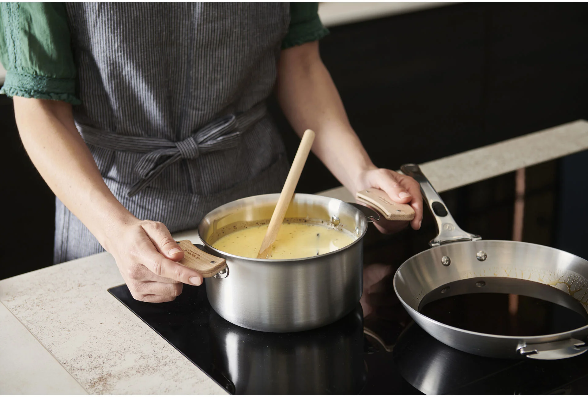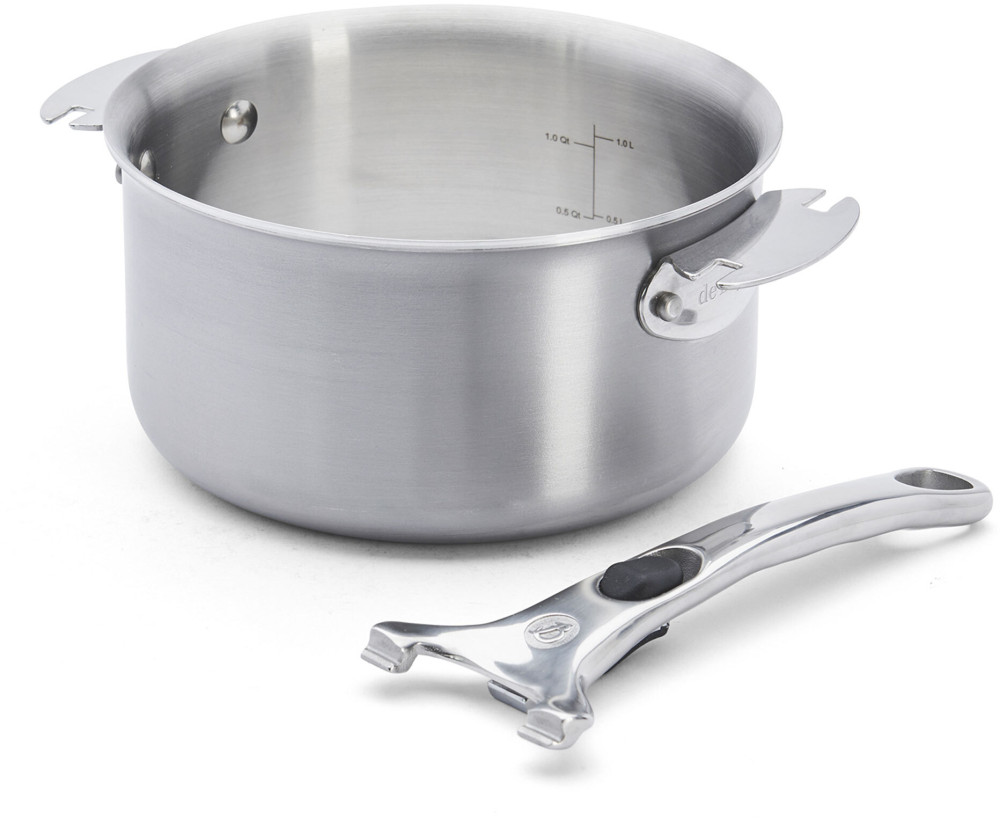 Jako materiał wykorzystano tu wysokiej jakości stal nierdzewną - łatwą do czyszczenia, nietoksyczną i wytrzymałą. Jej 3-warstwowa konstrukcja gwarantuje równomierne rozprowadzanie temperatury i oznacza, że zachowujesz pełną kontrolę nad gotowaniem, nawet w przypadku najdelikatniejszych przepisów. Taka konstrukcja zmniejsza też zużycie energii. Wewnątrz znajduje się przydatna miarka. Uchwyty są solidnie nitowane, zapewniające wieloletnią trwałość i komfort użytkowania. Naczynie może być używane równie ze zdejmowaną rączką D-3660-00 lub z parą uchwytów D-3660-02 z drewna bukowego. Naczynia tej serii można łatwo układać w stosy, co daje możliwość wygodnego przechowywania i oszczędności miejsca. Szczotkowane wykończenie stali nadaje kolekcji szczególnego charakteru. Naczynia nadają się do wszystkich rodzajów płyt grzewczych, w tym indukcyjnych. Po zdemontowaniu rączki lub drewnianych uchwytów naczynia mogą być stosowane również do zapiekania, lub wykończania dań w piekarniku.