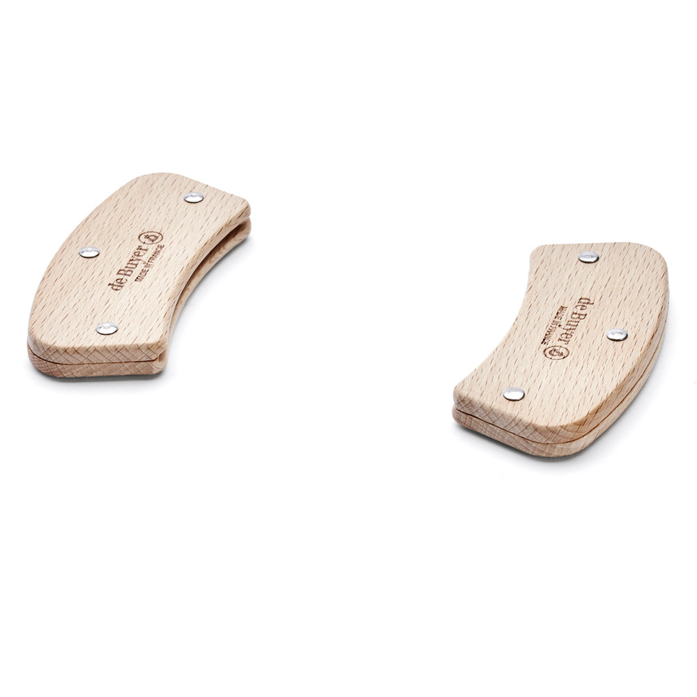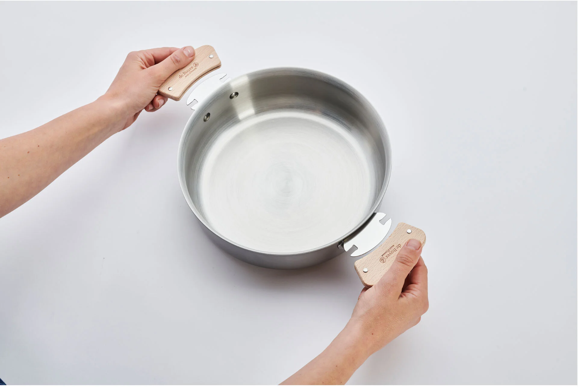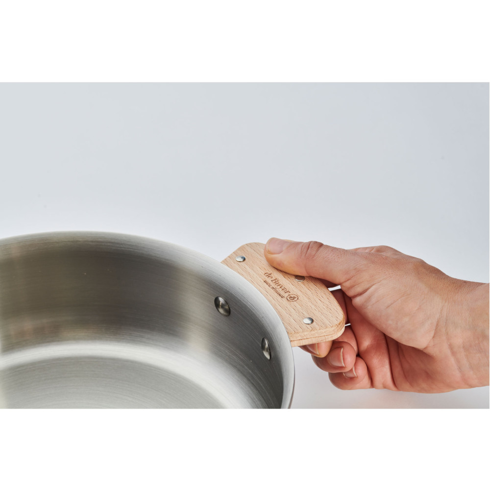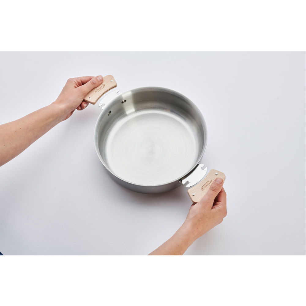 - podwójnie nitowane uchwyty ze stali nierdzewnej gwarantują długoletnią użyteczność, stabilność naczynia oraz możliwość stosowania dwóch rodzajów uchwytów tj. stalowej rączki (do kupienia osobno) oraz drewnianych uchwytów (załączonych do zestawu)