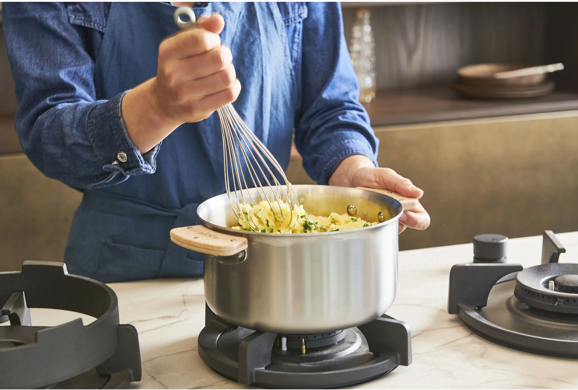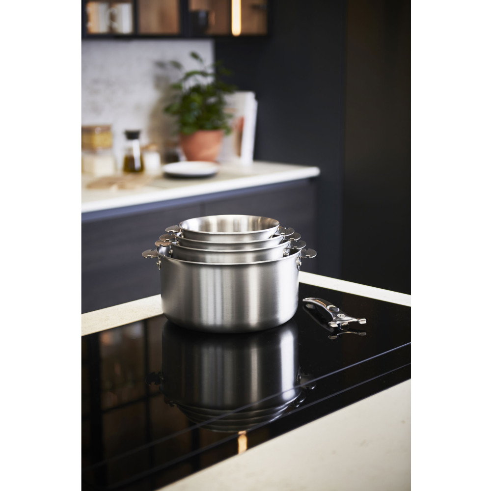 Jako materiał wykorzystano tu wysokiej jakości stal nierdzewną - łatwą do czyszczenia, nietoksyczną i wytrzymałą. Jej 3-warstwowa konstrukcja gwarantuje równomierne rozprowadzanie temperatury i oznacza, że zachowujesz pełną kontrolę nad gotowaniem, nawet w przypadku najdelikatniejszych przepisów. Taka konstrukcja zmniejsza też zużycie energii. Wewnątrz znajduje się przydatna miarka. Uchwyty są solidnie nitowane, zapewniające wieloletnią trwałość i komfort użytkowania. Naczynie może być używane równie ze zdejmowaną rączką D-3660-00 (do kupienia osobno) lub z parą uchwytów D-3660-02 z drewna bukowego - dołączoną do zestawu. Naczynia tej serii można łatwo układać w stosy, co daje możliwość wygodnego przechowywania i oszczędności miejsca. Szczotkowane wykończenie stali nadaje kolekcji szczególnego charakteru. Naczynia nadają się do wszystkich rodzajów płyt grzewczych, w tym indukcyjnych. Po zdemontowaniu drewnianych uchwytów lub stalowej raczki, naczynia mogą być stosowane również do zapiekania lub wykończania dań w piekarniku.