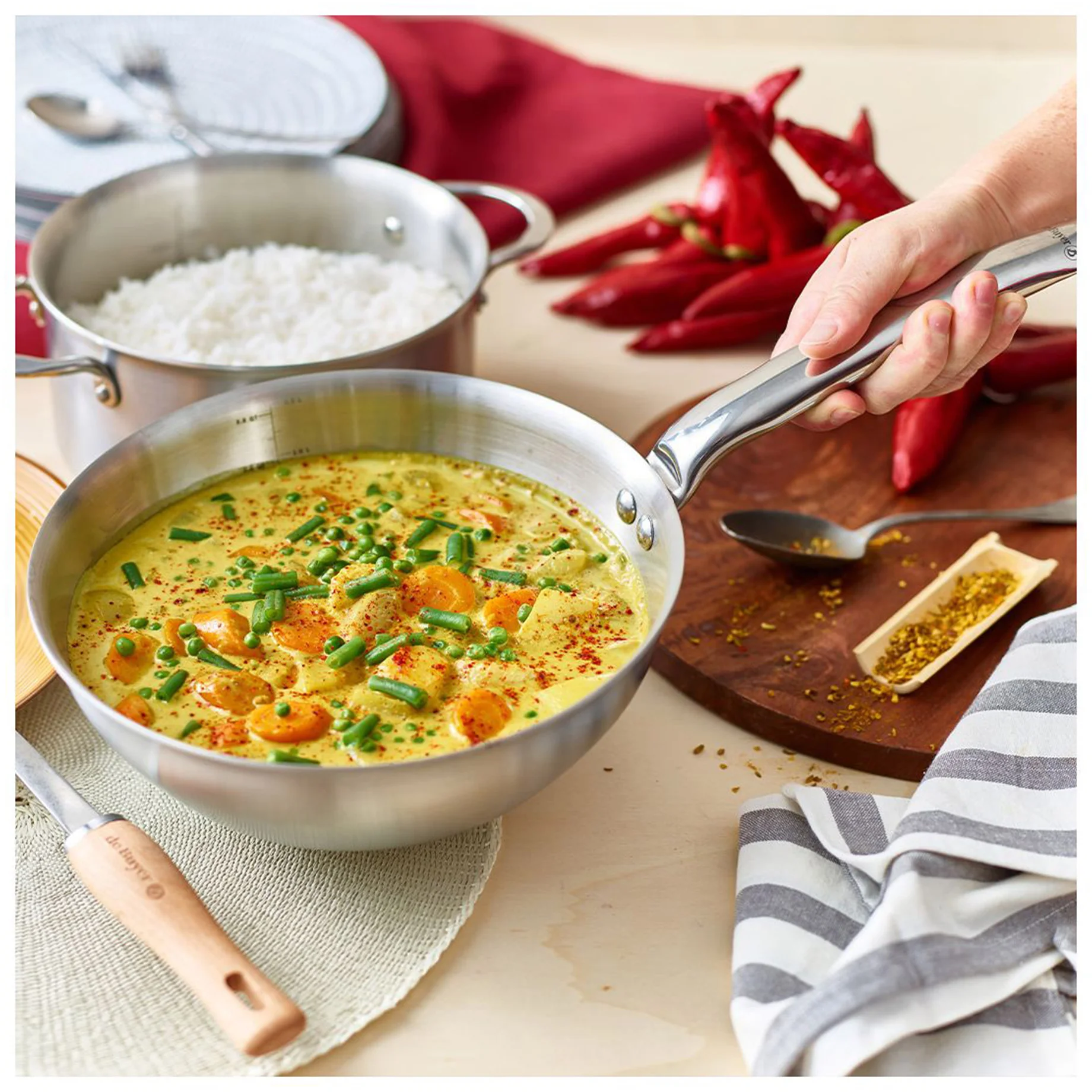 Monoblokowy korpus gwarantuje równomierne rozprowadzanie temperatury oraz bardzo precyzyjną kontrolę procesu gotowania. Taka budowa naczynia zmniejsza zużycie energii oraz i pozwala gotować potrawy z zachowaniem cennych witamin. Wewnętrzna miarka pojemności naczynia ułatwia gotowanie, umożliwiając odmierzenie oraz zachowanie odpowiednich proporcji w potrawie.