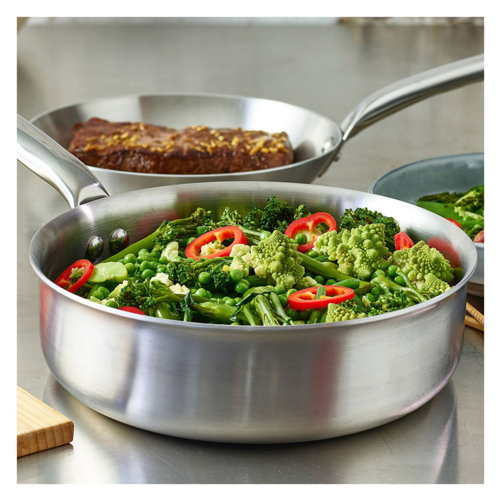Konstrukcja naczynia uniemożliwia nagrzewanie się uchwytu w czasie gotowania (rękojeść pozostaje chłodna). Ergonomiczny uchwyt jest solidnie mocowany nitami, a satynowe wykończenie stali nadaje im interesujący, nowoczesny wygląd. Pokrywki szklane (do kupienia osobno) umożliwiają gotowanie przy minimalnym użyciu wody, co jest niezwykle korzystne dla zdrowia.