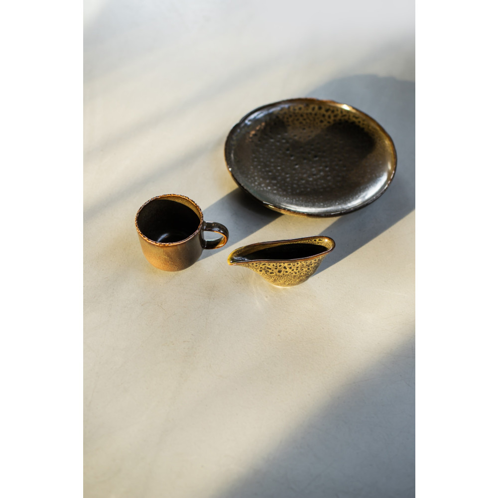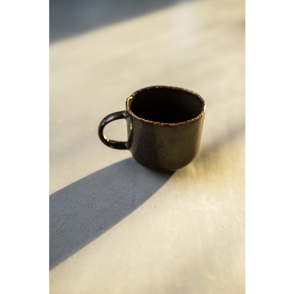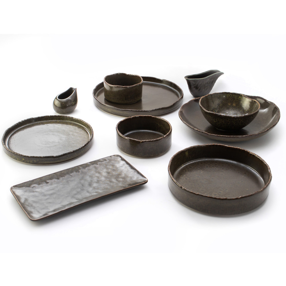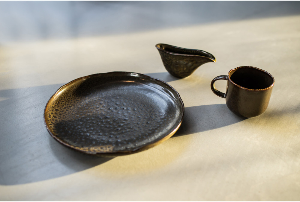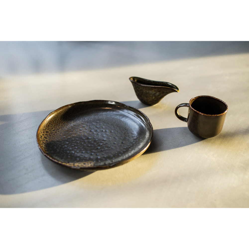 Prosta, minimalistyczna forma tych naczyń oraz ciemna kolorystyka pięknie skomponuje się zarówno w minimalistycznej aranżacji kuchni czy jadali, jak również w bardziej rustykalnych wnętrzach. Subtelne, półmatowe wykończenie naczyń wspaniale podkreśla lekko nakrapianą glazurę i przenikanie się barw. Dodatkowo, nieregularnie wykończone brzegi nadają każdemu naczyniu indywidualny