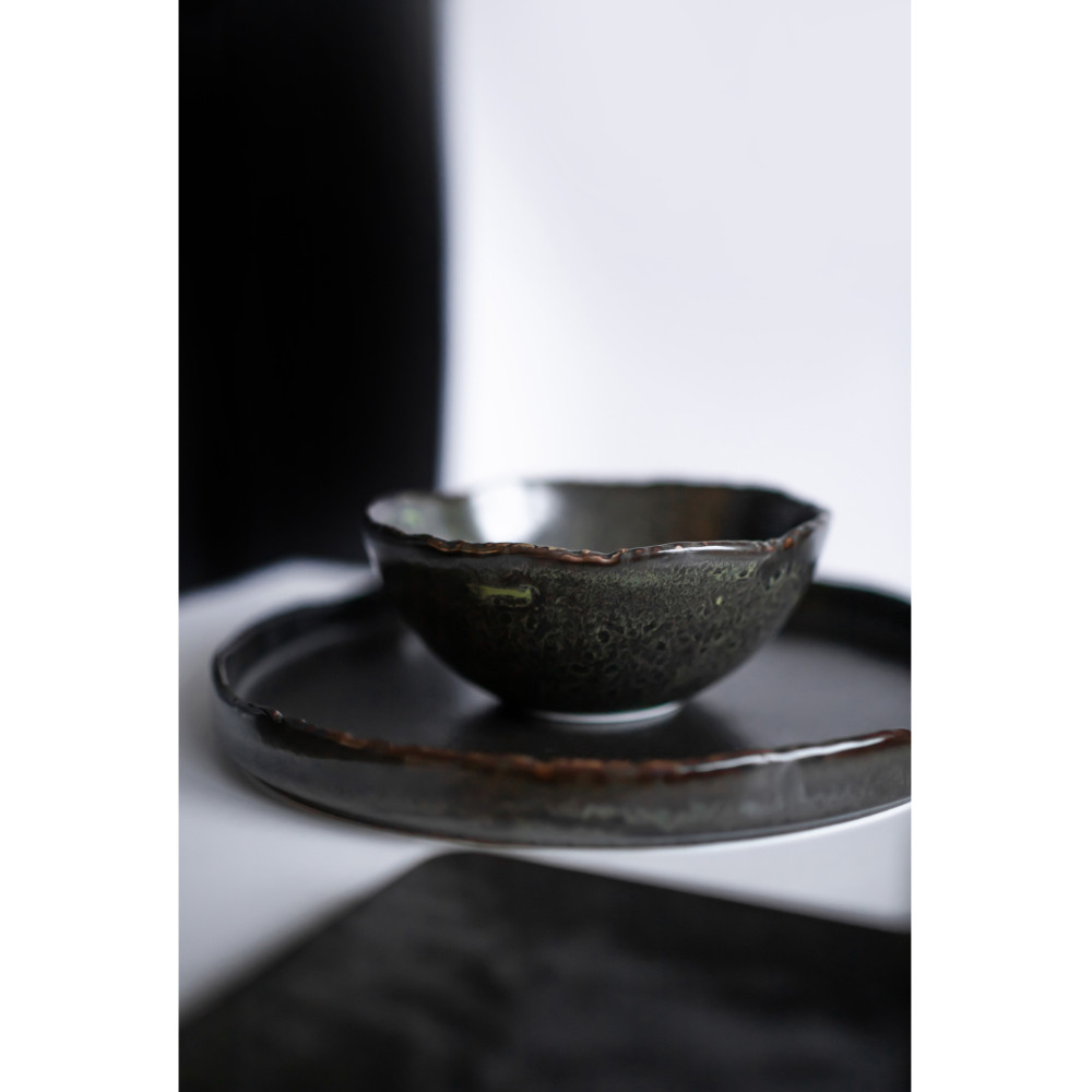 Prosta, minimalistyczna forma tych naczyń oraz ciemna kolorystyka pięknie skomponuje się zarówno w minimalistycznej aranżacji kuchni czy jadali, jak również w bardziej rustykalnych wnętrzach. Subtelne, półmatowe wykończenie naczyń wspaniale podkreśla lekko nakrapianą glazurę i przenikanie się barw. Dodatkowo, nieregularnie wykończone brzegi nadają każdemu naczyniu indywidualny