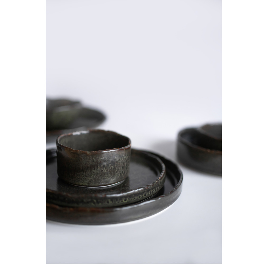 Prosta, minimalistyczna forma tych naczyń oraz ciemna kolorystyka pięknie skomponuje się zarówno w minimalistycznej aranżacji kuchni czy jadali, jak również w bardziej rustykalnych wnętrzach. Subtelne, półmatowe wykończenie naczyń wspaniale podkreśla lekko nakrapianą glazurę i przenikanie się barw. Dodatkowo, nieregularnie wykończone brzegi nadają każdemu naczyniu indywidualny