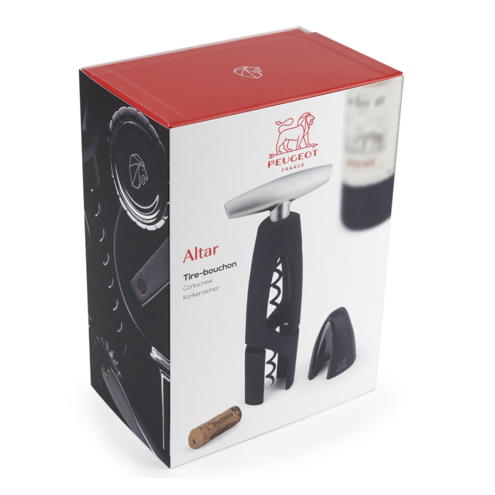 Korkociąg Peugeot Altar to korkociąg z mechanizmem śrubowym zaprojektowany tak, aby oferować maksymalną przyjemność przy minimalnym wysiłku. Centralną osią tego korkociągu jest spirala, która działa intuicyjnie. Wystarcza bez żadnego wysiłku obracać korkociąg! Działa dobrze z każdą butelką wina. Odważny i nowoczesny design, jest wykonany z ABS, wysokiej jakości tworzywa sztucznego. Satynowe w dotyku wykończenie zapewnia wyjątkowo miękki i wygodny chwyt. Ergonomiczna rękojeść wykonana jest ze znalu (stop cynku i aluminium). Do korkociągu dołączony jest przecinak do folii. Dostępny w dwóch wariantach kolorystycznych.