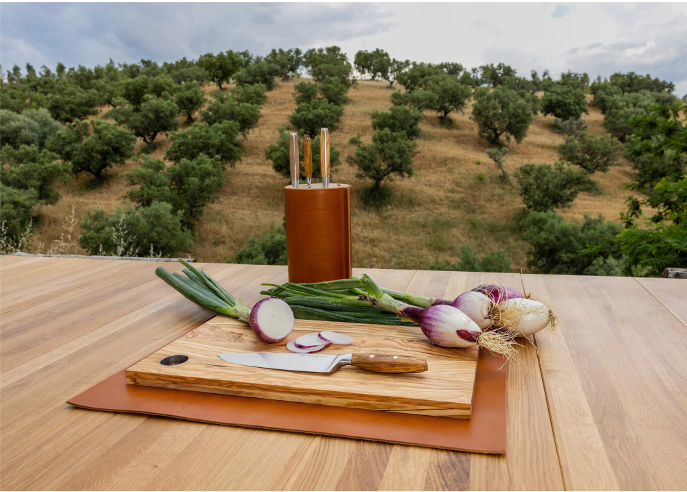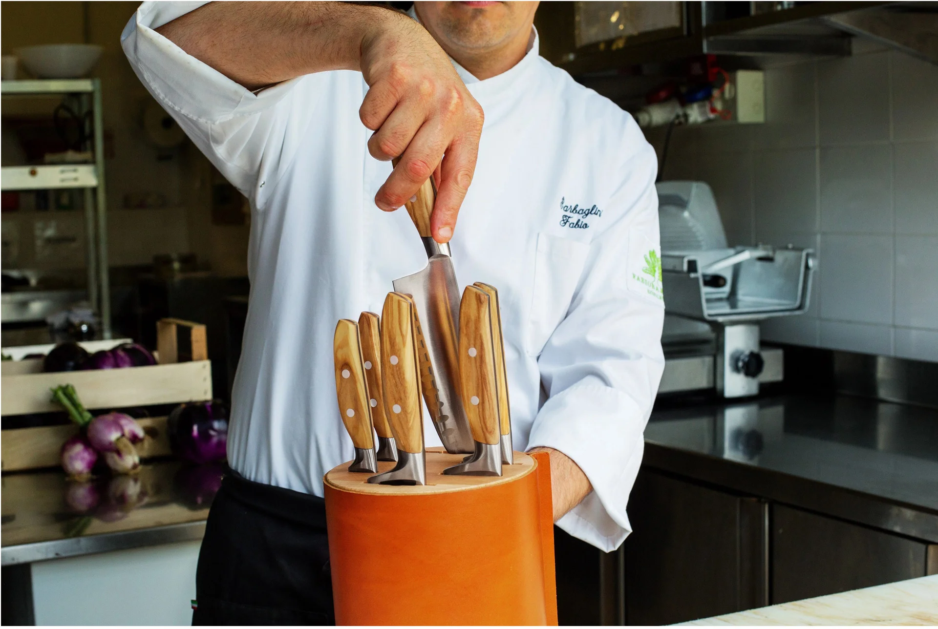 Stylowy blok na noże Amici Villa o kształcie walca wykończonego warstwą skóry pozwala przechowywać do 6 noży. Włoska skóra subtelnie podkreśla urodę rękojeści z drewna oliwnego, a antypoślizgowa podstawa z wysokiej jakości drewna bukowego gwarantuje stabilność.