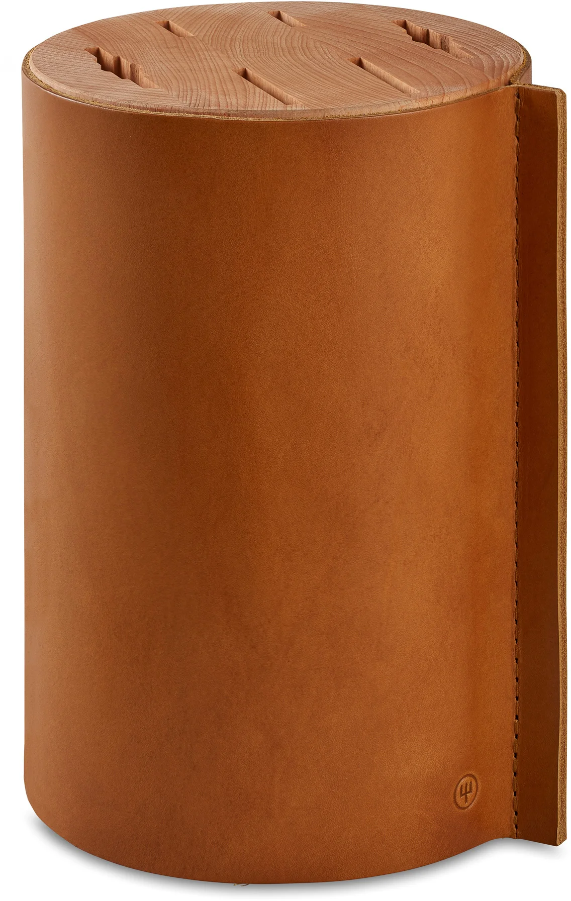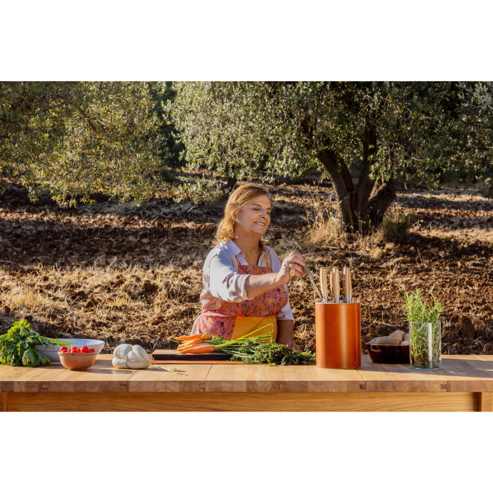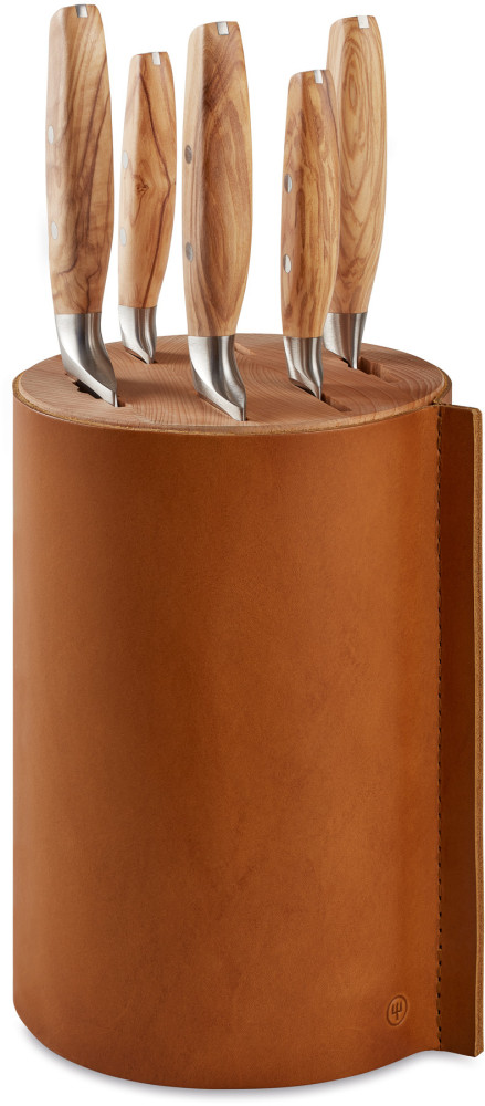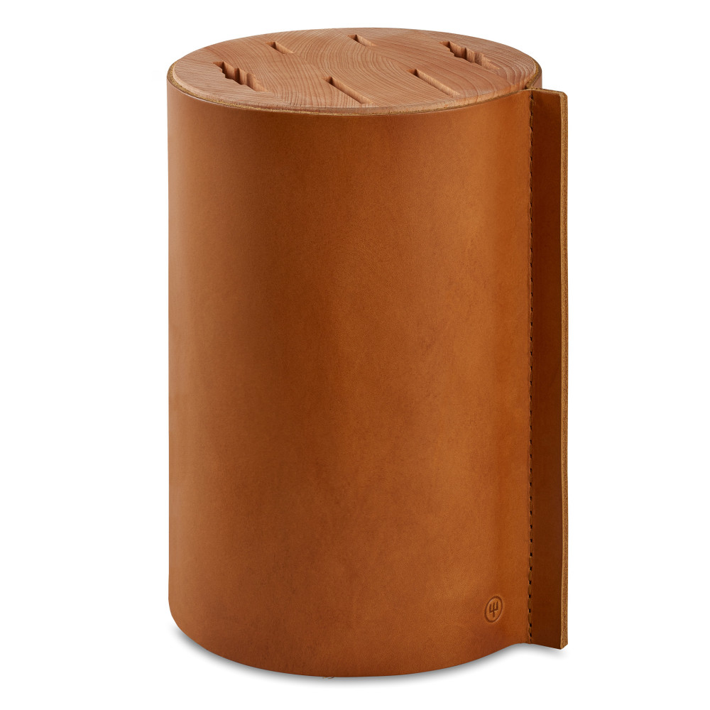 Wyjątkowe noże inspirowane przez słoneczne wzgórza Kalabrii zasługują na wyjątkową oprawę. Stylowy blok na noże Amici Villa o kształcie walca wykończonego warstwą skóry niewątpliwie taką oprawę gwarantuje. Włoska skóra subtelnie podkreśla urodę rękojeści z drewna oliwnego, a antypoślizgowa podstawa z wysokiej jakości drewna bukowego jest dodatkowym atutem. Blok pozwala przechowywać do 6 noży.
