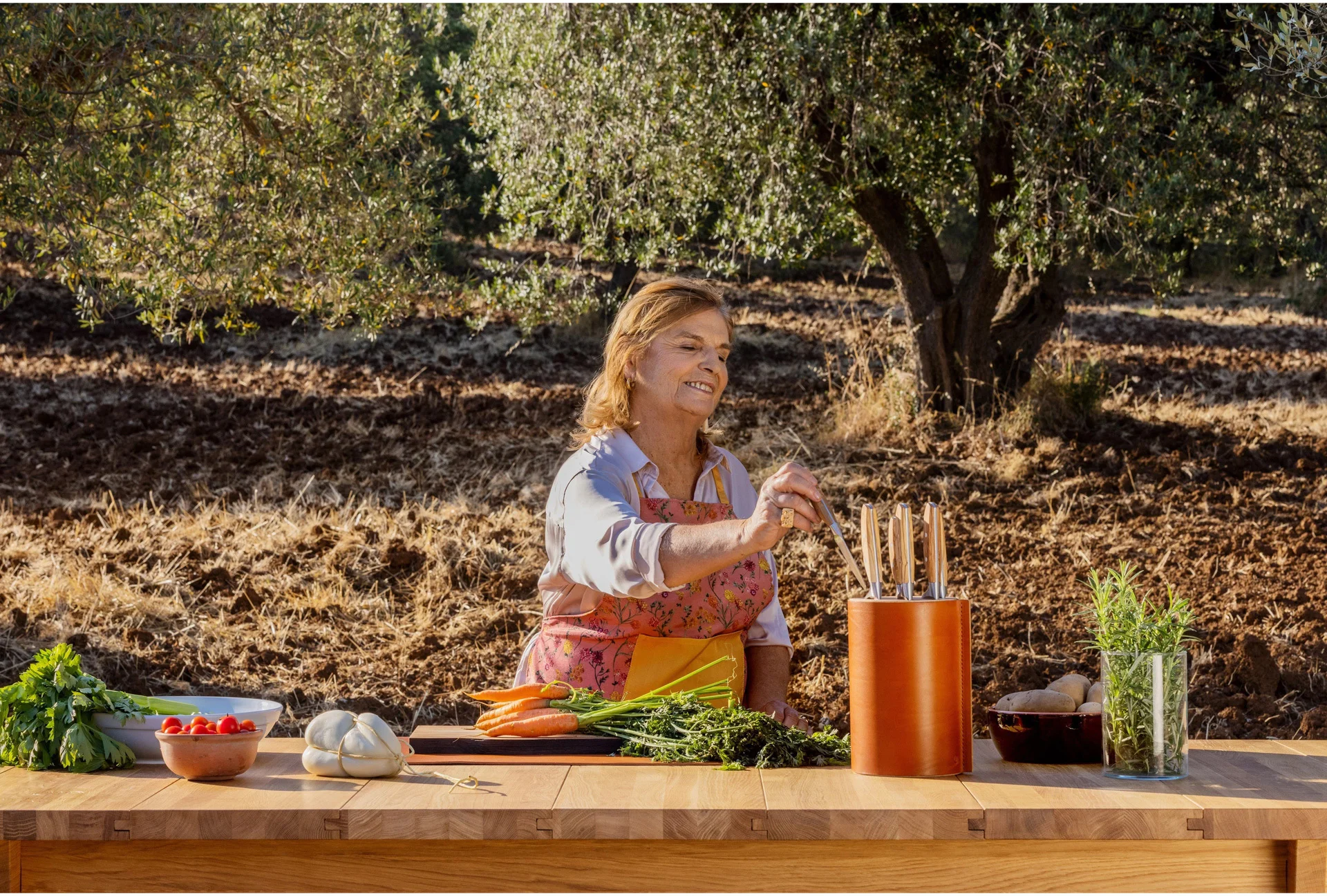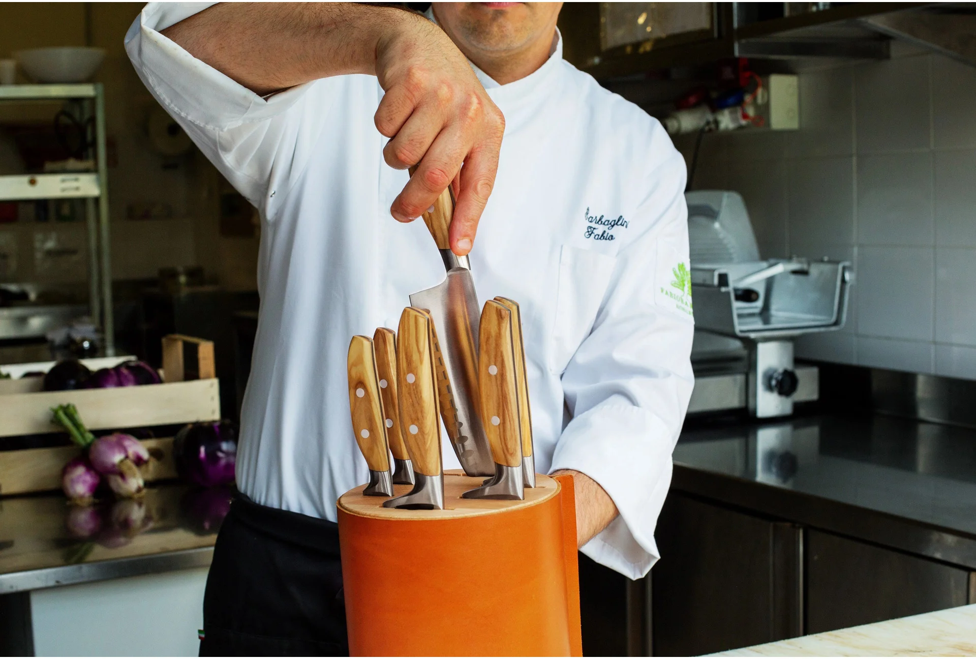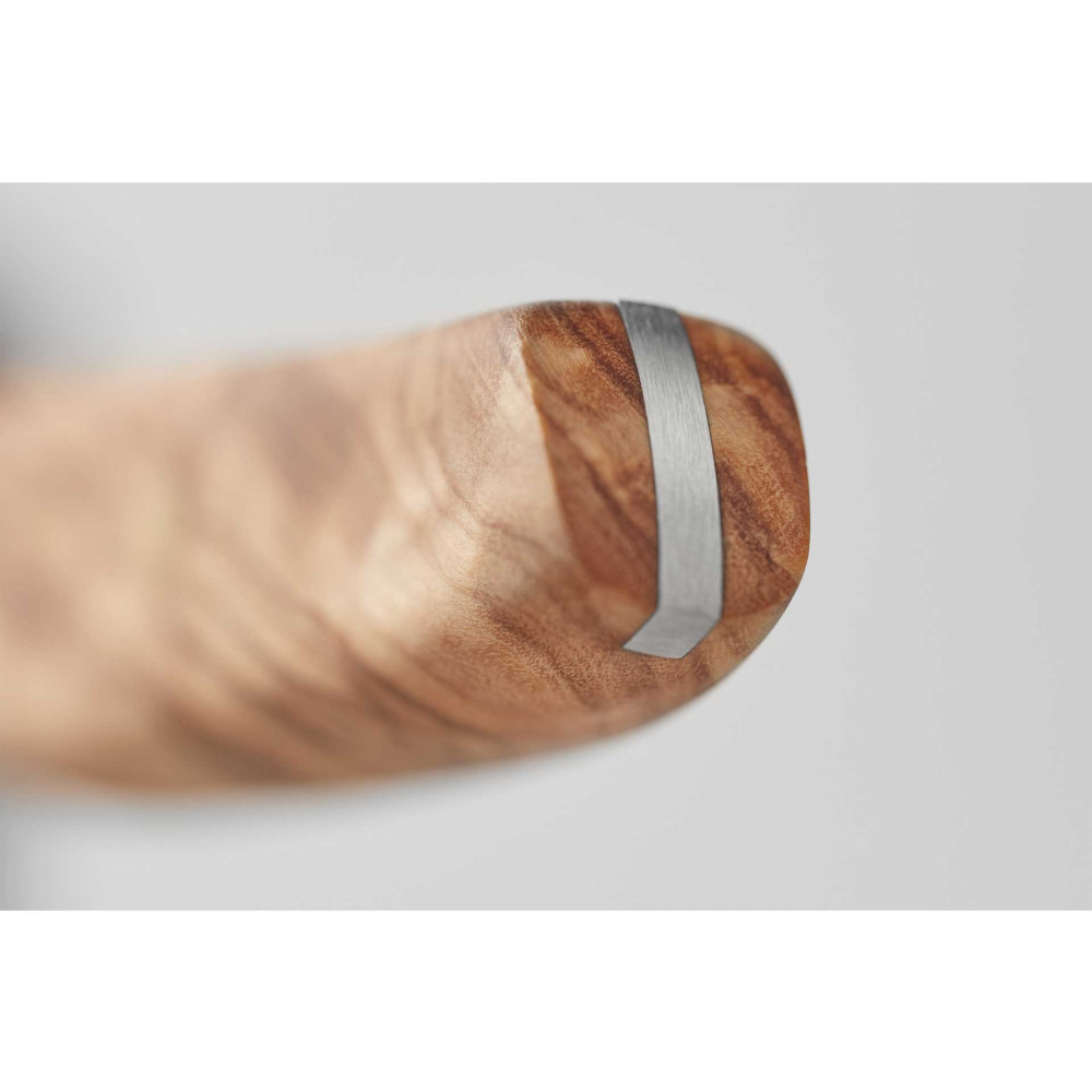 Każdy nóż serii AMICI jest wyjątkowy i niepowtarzalny dzięki unikalnemu rysunkowi drewna oliwnego rękojeści. Kalabryjskie drzewa oliwne rosną powoli, a ich drewno odznacza się ponadprzeciętną trwałością, naturalną wodoodpornością oraz właściwościami antybakteryjnymi. Drewno używane do produkcji pozyskiwane jest z drzew, które ze względu na swój zaawansowany wiek nie owocują wcale lub w sposób bardzo znikomy.