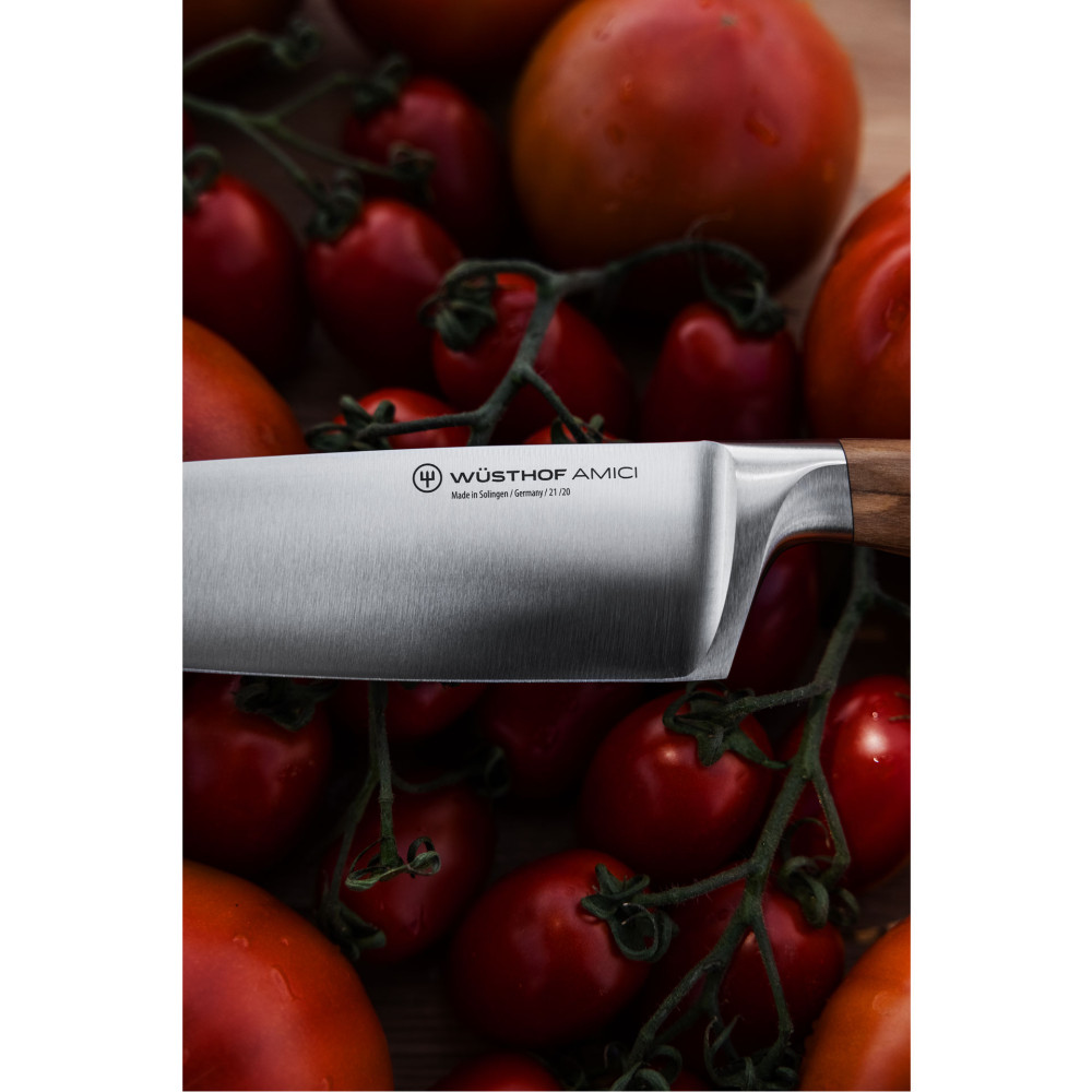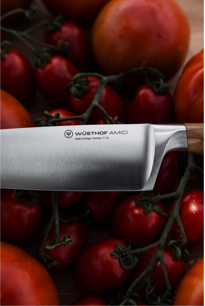 Noże serii AMICI łączą kultowe, precyzyjnie wykute ostrza z których znana jest marka Wusthof z wyszukanymi rękojeściami z kalabryjskiego drewna oliwnego. Połączenie nowoczesnego rzemiosła doskonalonego do stuleci z włoskim designem, tworzy idealny nóż, idealny, aby przygotowanie posiłku i wspólne jego spożycie były prawdziwą radością. Benvenuti Amici.