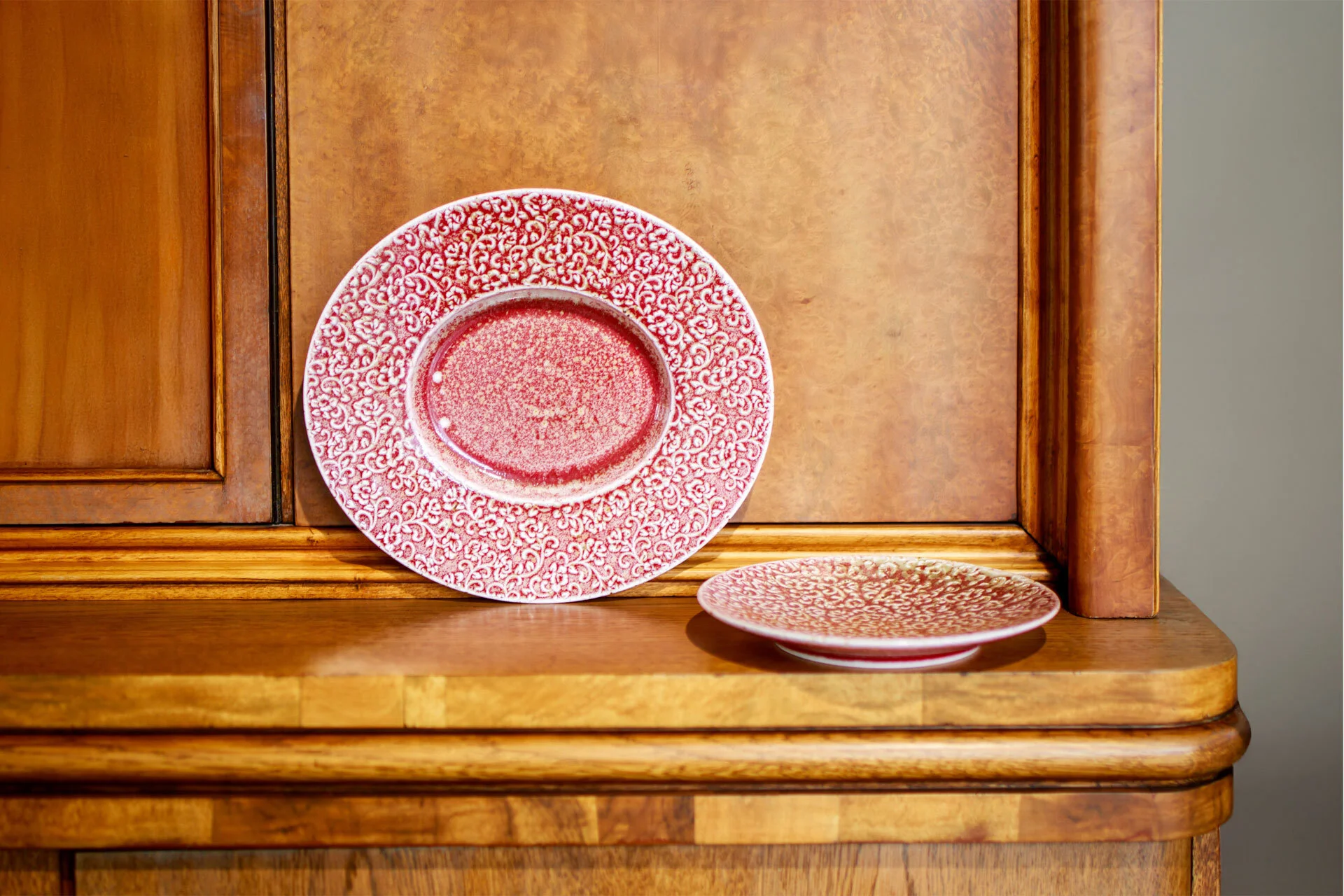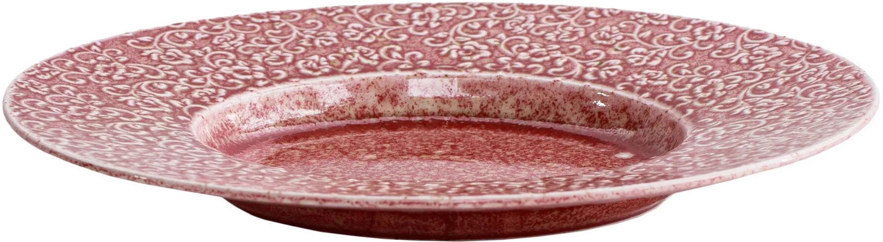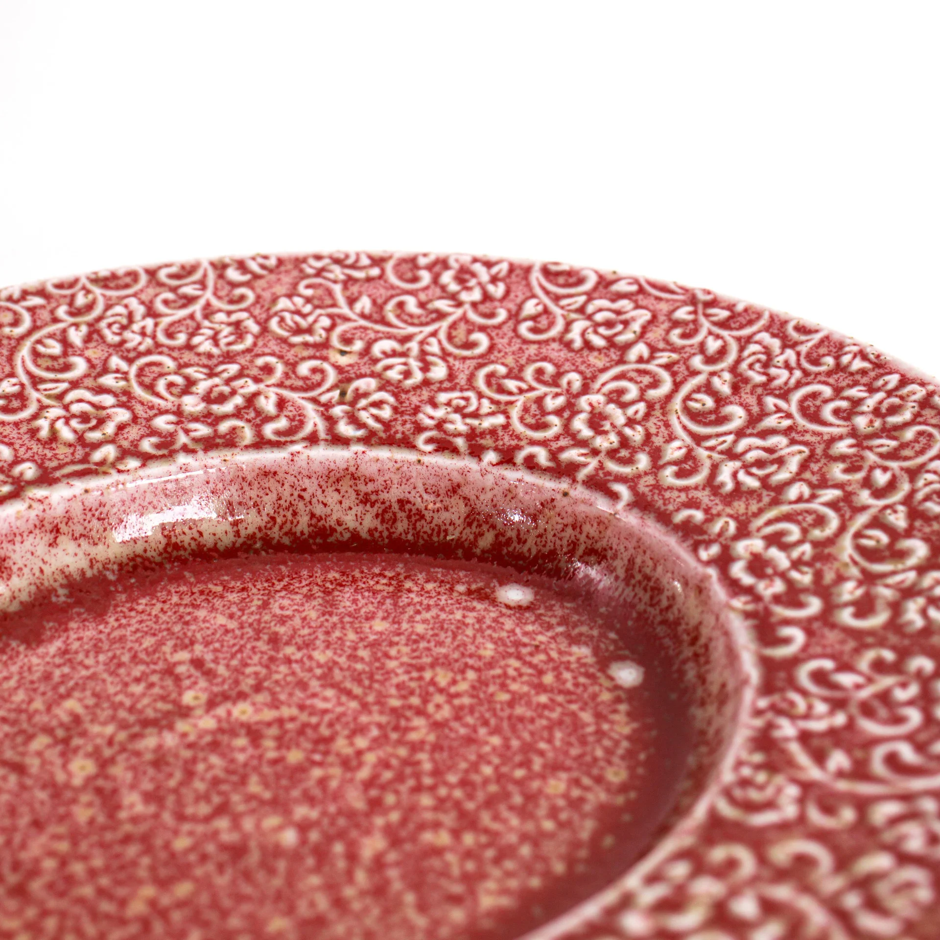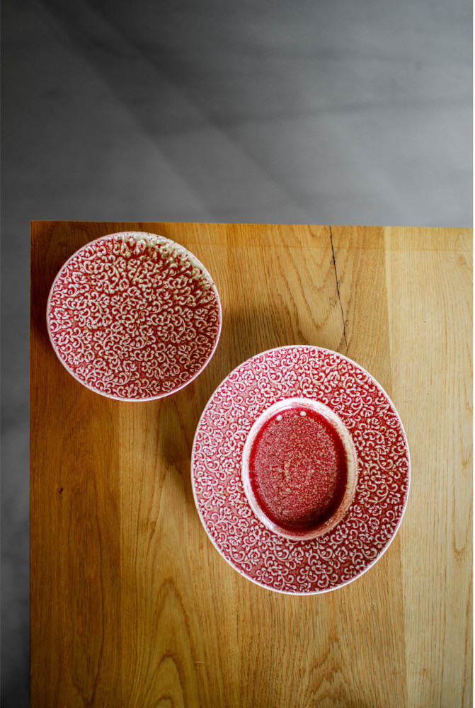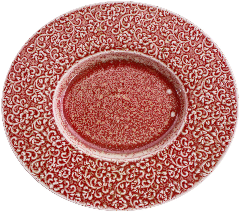Talerz porcelanowy AMOUR Verlo to połączenie precyzyjnego rzemiosła z dekoracyjną tradycją. Jego powierzchnię zdobi efektowny relief inspirowany motywem mandali – złożony z powtarzających się, stylizowanych elementów roślinnych. Wzór przyciąga wzrok nie tylko symetrią, ale też subtelną grą kolorów: rdzawa czerwień przenika się z jaśniejszymi, niemal kremowymi akcentami, tworząc bogatą, a jednocześnie harmonijną kompozycję.