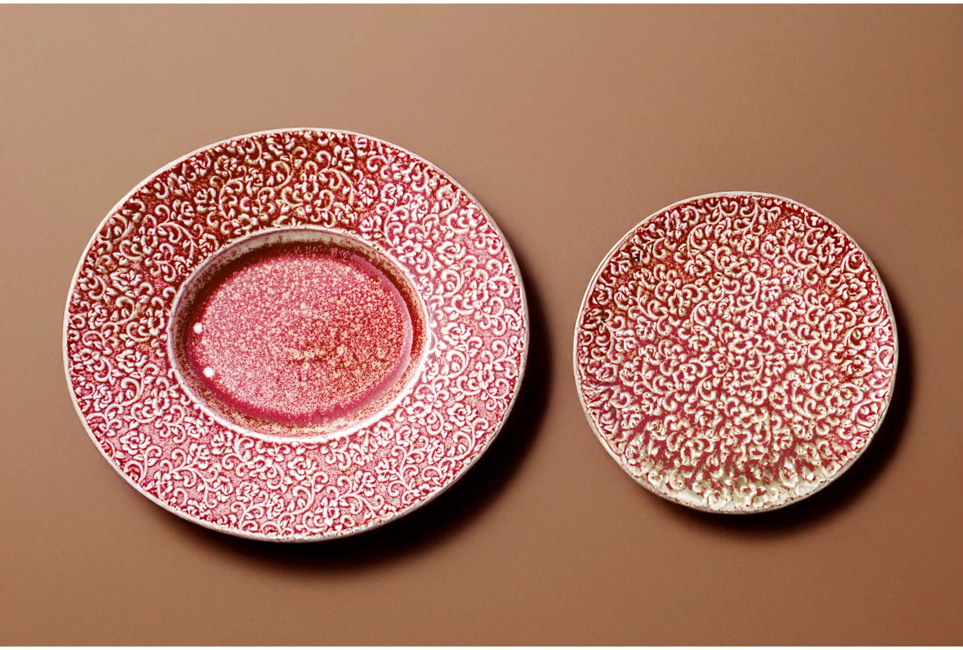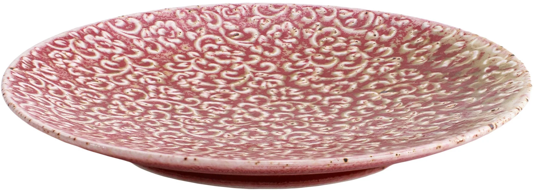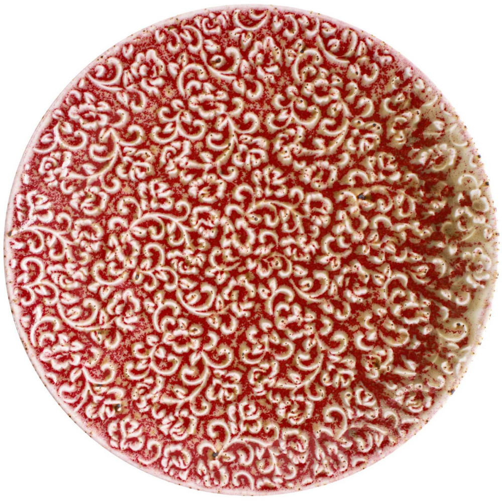 Talerz porcelanowy AMOUR Verlo to połączenie precyzyjnego rzemiosła z dekoracyjną tradycją. Jego powierzchnię zdobi efektowny relief inspirowany motywem mandali – złożony z powtarzających się, stylizowanych elementów roślinnych. Wzór przyciąga wzrok nie tylko symetrią, ale też subtelną grą kolorów: rdzawa czerwień przenika się z jaśniejszymi, niemal kremowymi akcentami, tworząc bogatą, a jednocześnie harmonijną kompozycję.