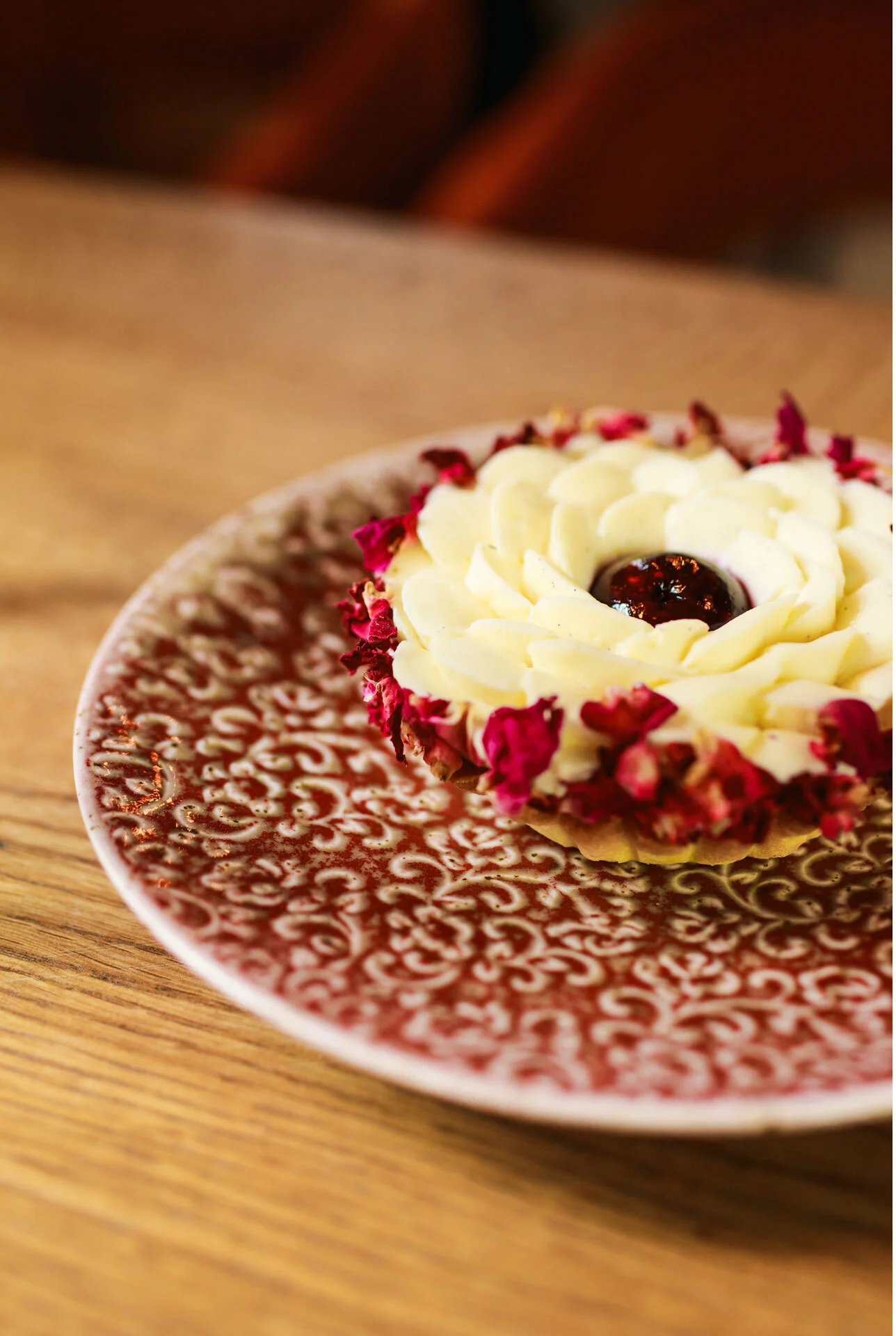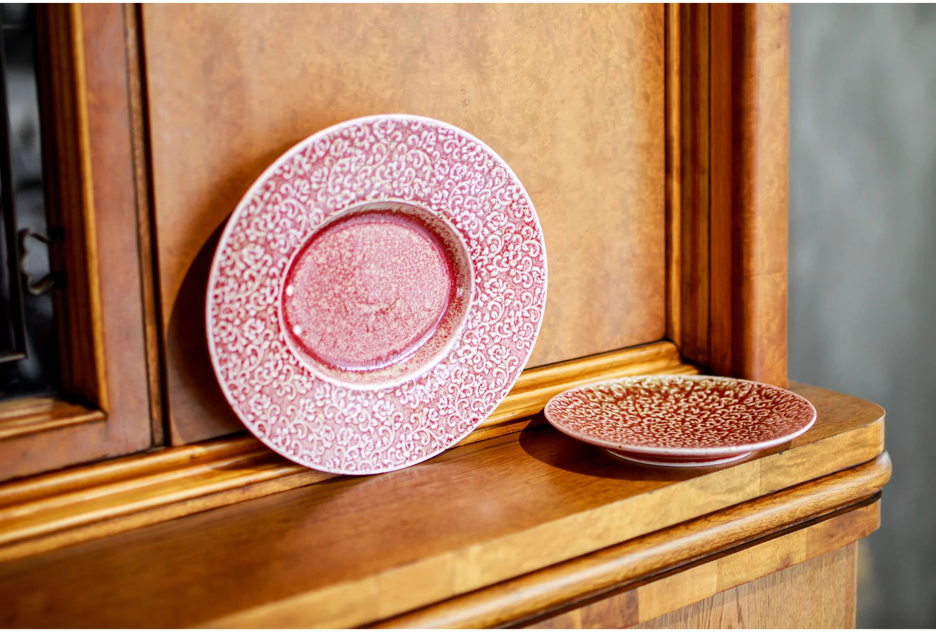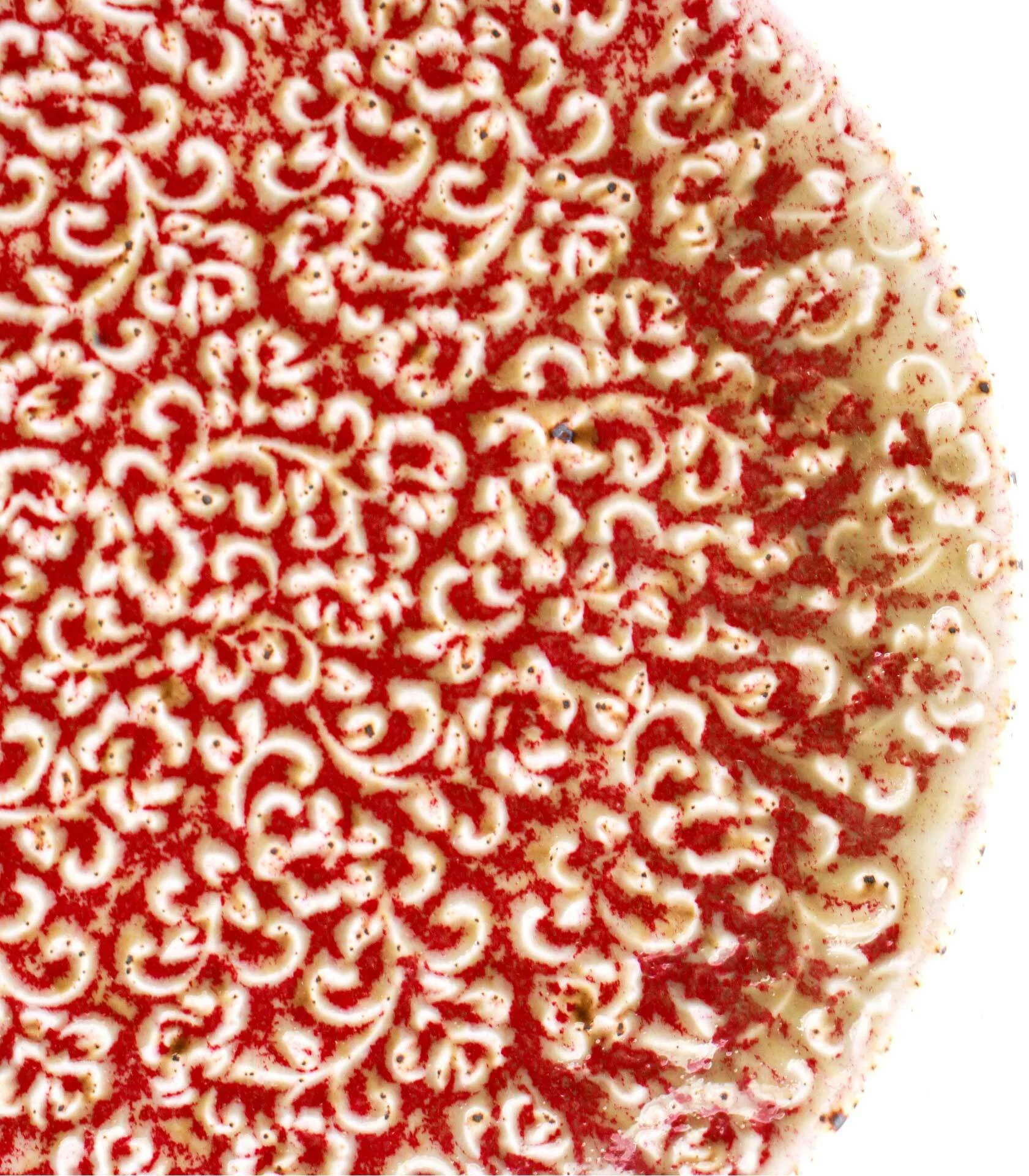 Talerz porcelanowy AMOUR Verlo to połączenie precyzyjnego rzemiosła z dekoracyjną tradycją. Jego powierzchnię zdobi efektowny relief inspirowany motywem mandali – złożony z powtarzających się, stylizowanych elementów roślinnych. Wzór przyciąga wzrok nie tylko symetrią, ale też subtelną grą kolorów: rdzawa czerwień przenika się z jaśniejszymi, niemal kremowymi akcentami, tworząc bogatą, a jednocześnie harmonijną kompozycję.