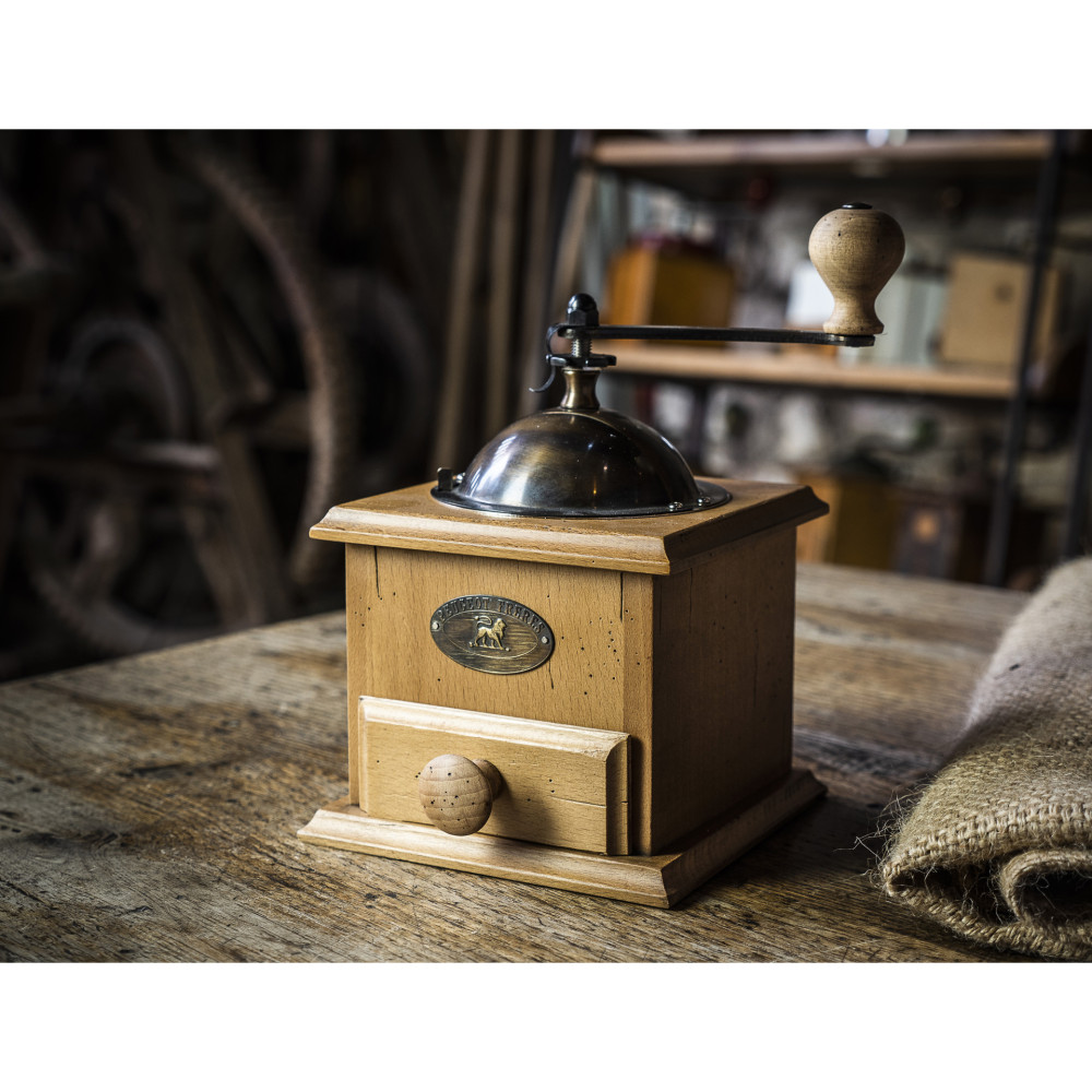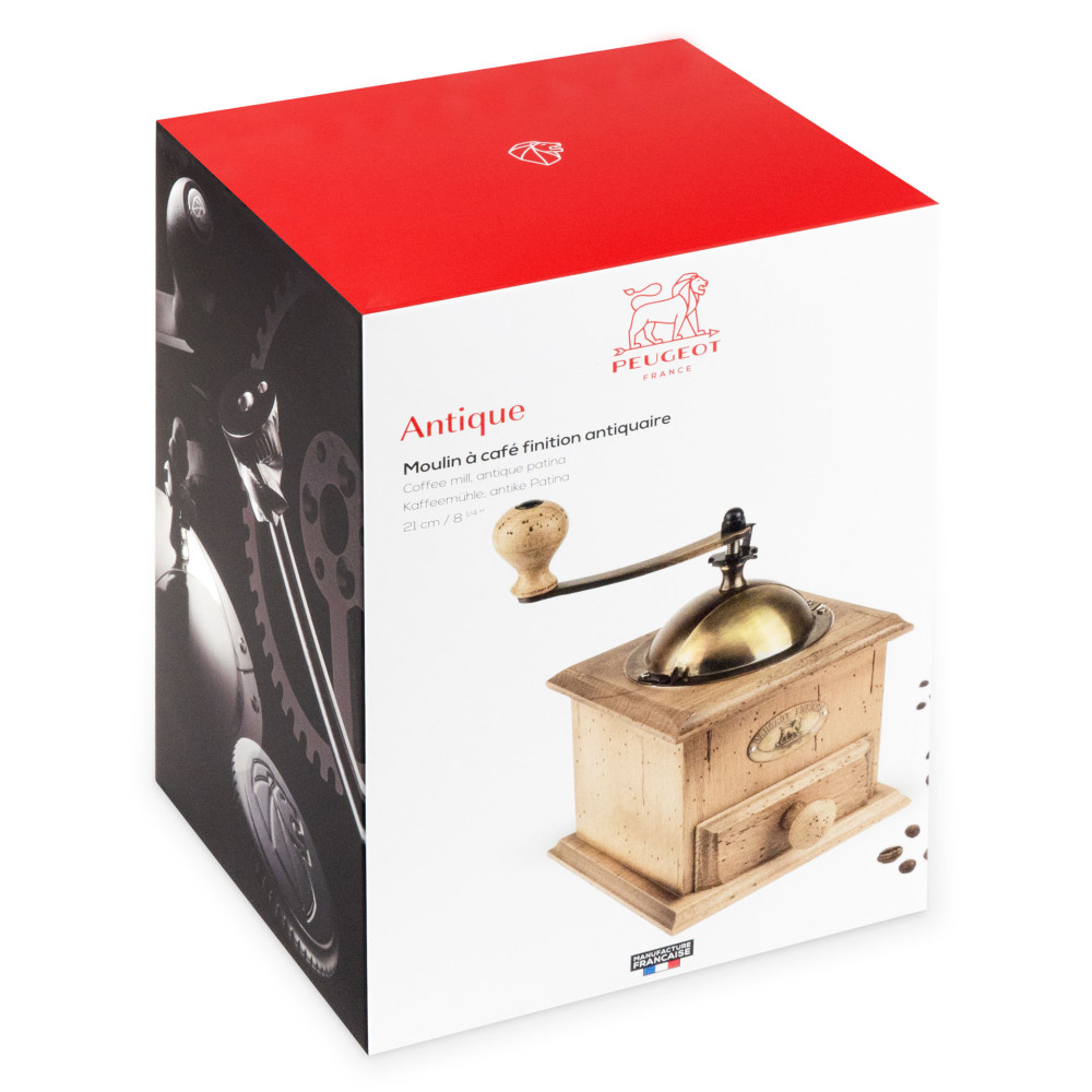 Drewniana, sześcienna obudowa wykonana z drewna bukowego, jest niezwykle stabilna i wygodna podczas mielenia. Zamykany zbiornik na kawę w górnej części młynka, wykonany jest ze stali nierdzewnej. Jego wykończenie w kolorze starego złota nadaje młynkowi elegancji i podkreśla jego antyczny design. Napełnianie młynka ziarnami kawy jest niezwykle wygodne i łatwe, a zasuwka zabezpiecza przed wypadaniem ziaren kawy podczas mielenia. Stalowa korba służąca do napędzania młynka jest w doskonałych proporcjach, a jej obłe, duże i efektowne zakończenie z drewna bukowego sprawia, że wygodnie się ją trzyma i wprowadza w ruch. Szufladka umożliwia zbieranie świeżo zmielonej kawy. Jej otwieranie i zamykanie są łatwe i płynne. Drewniany uchwyt oraz emblemat z symbolem Lwa – znakiem firmowym marki Peugeot - nadaje całości szyku i wysublimowania. Regulacja stopnia mielenia (mniej lub bardziej drobnego w zależności od pożądanego rodzaju kawy) odbywa się za pomocą pokrętła znajdującego się pod korbką. Każdy młynek Paris Antique jest wykańczany ręcznie z największą starannością i dbałością o niuanse. Dodawanie im cech dawności czyni tą kolekcję wyjątkową. Młynki z antycznym wykończeniem sprawą przyjemność kolekcjonerom i miłośnikom zabytkowych przedmiotów