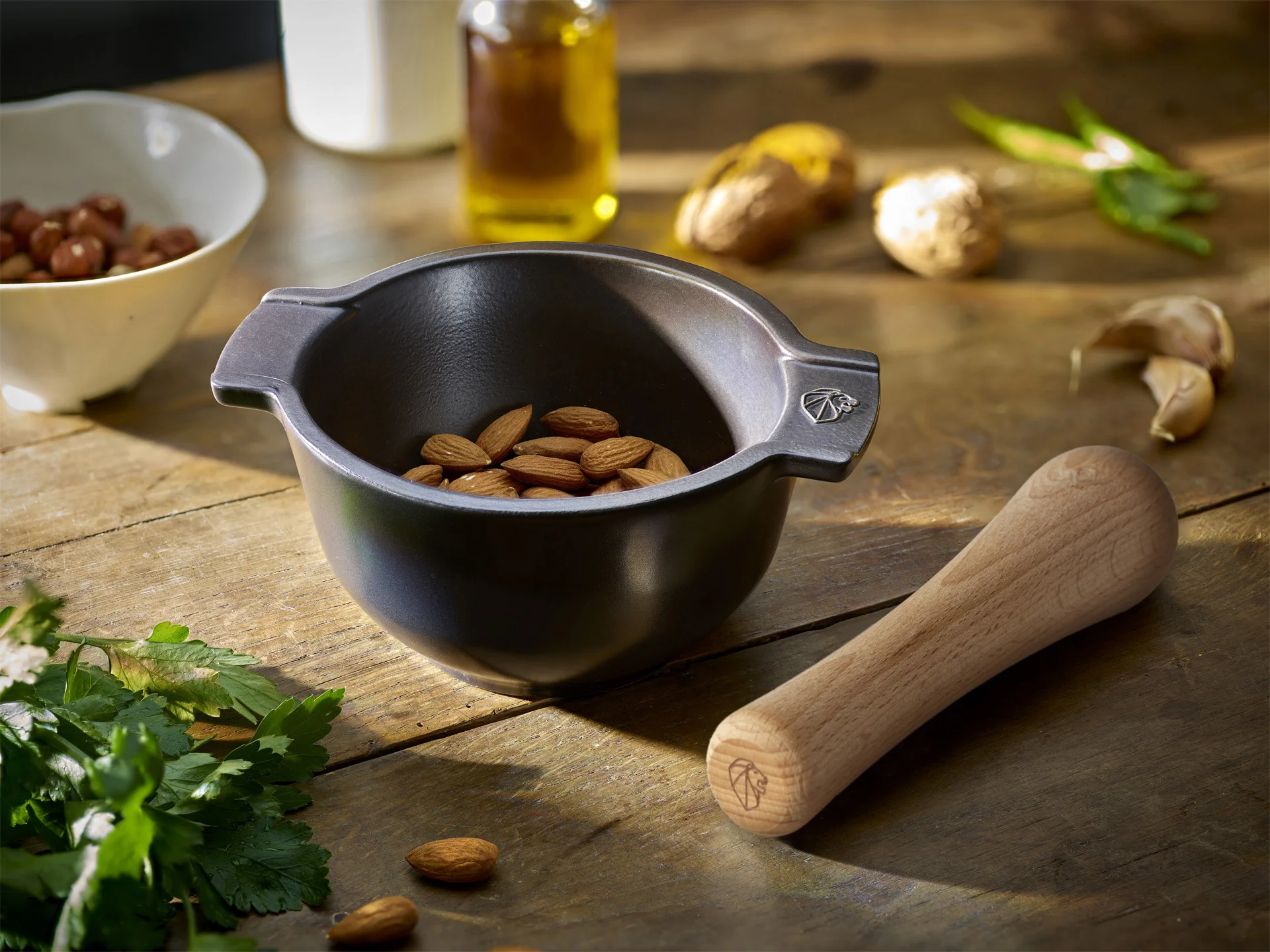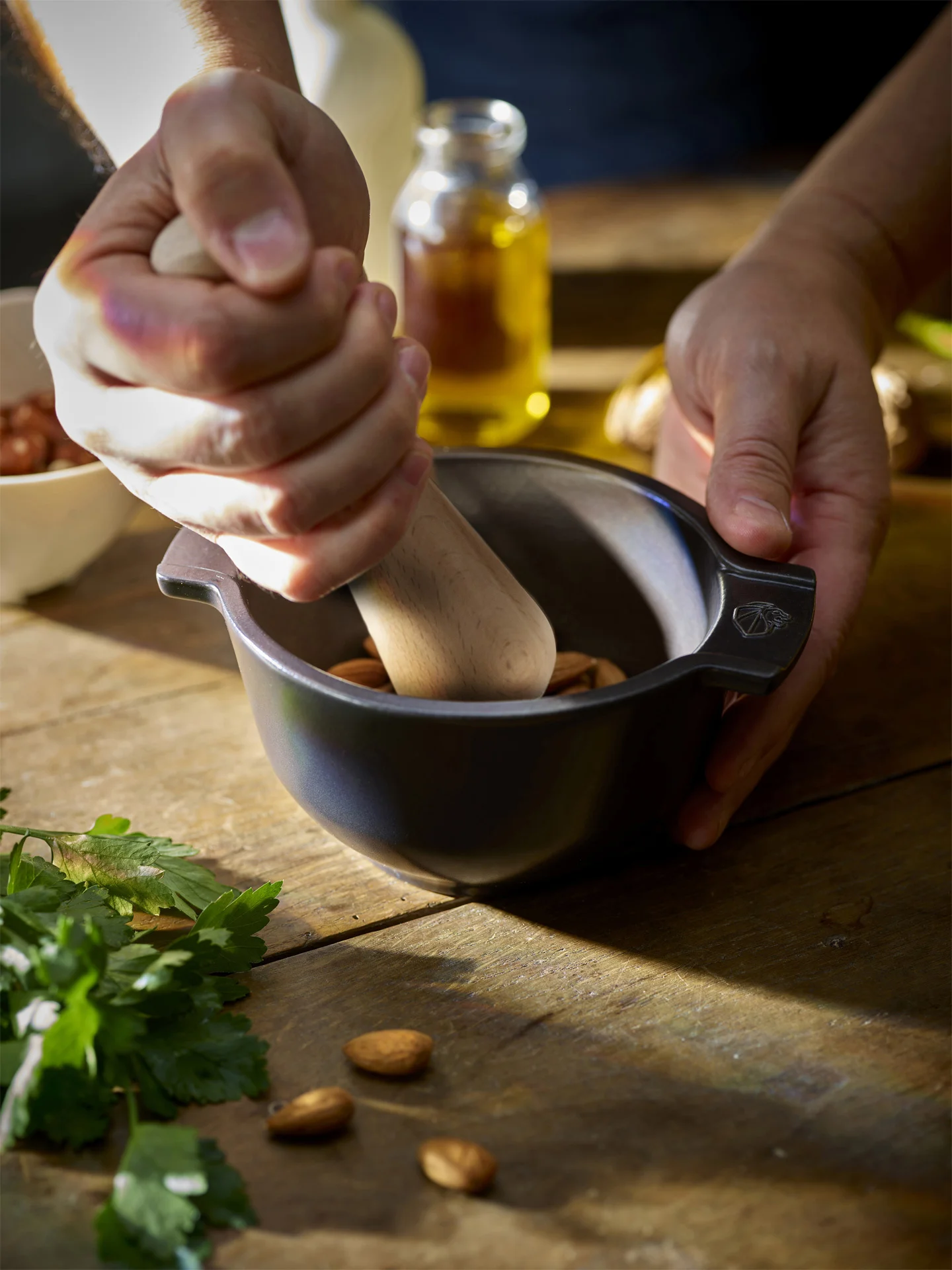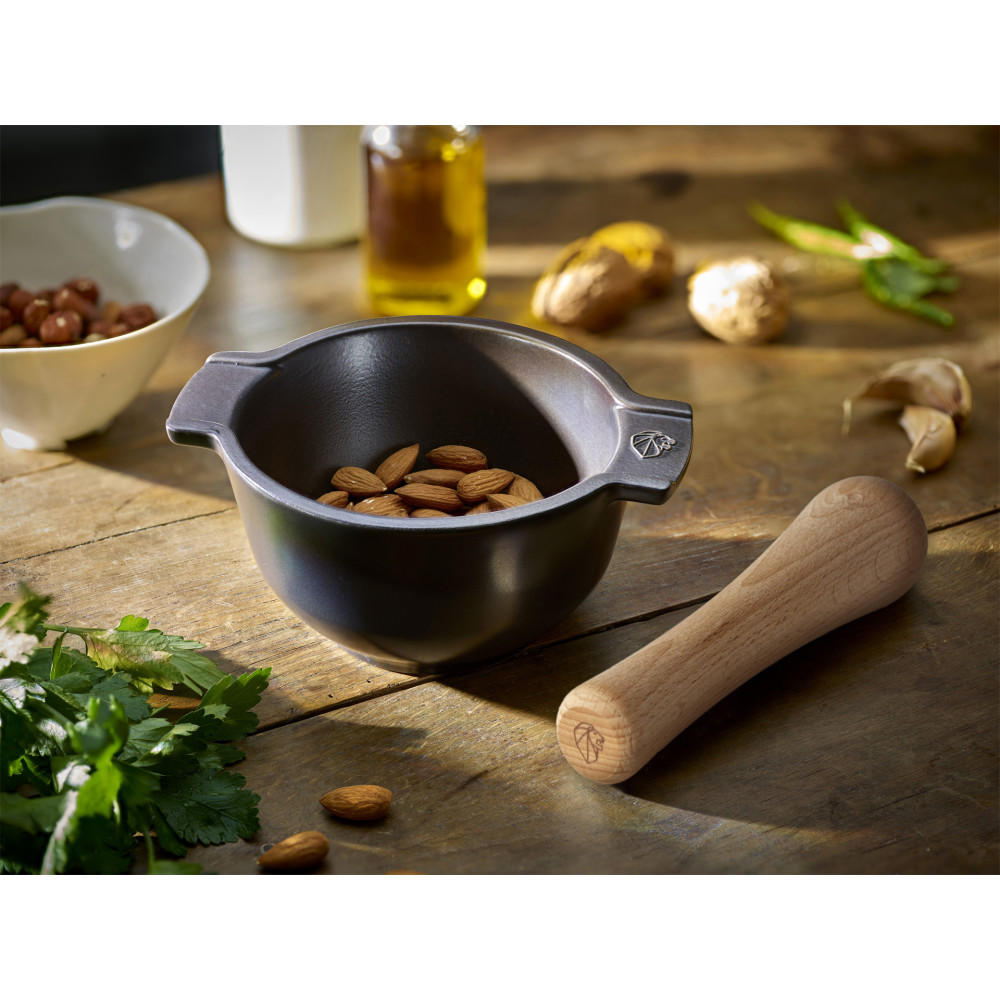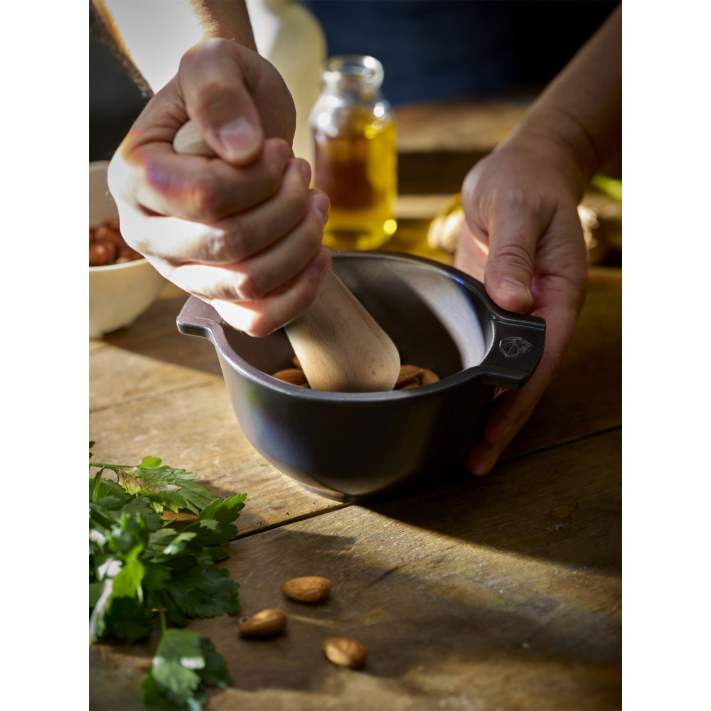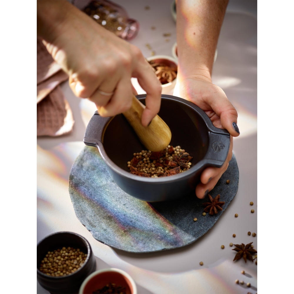Moździerz kuchenny do przypraw z tłuczkiem wykonany z trwałych materiałów (ceramika, drewno), zapewniających długotrwałe użytkowanie. Doskonały do ucierania ziół, przypraw, nasion i orzechów, oraz do przygotowywania pesto. Doskonale łączy przyprawy, dzięki czemu np. domowe curry staje się bardziej aromatyczne. Solidna konstrukcja z uchwytami zapewnia komfort podczas użytkowania. Moździerz to niezastąpione narzędzie w każdej kuchni, idealne dla osób ceniących jakość przypraw. Ucierane składniki uwalniają wyjątkowy smak, nadając potrawom wyjątkowe walory smakowe.