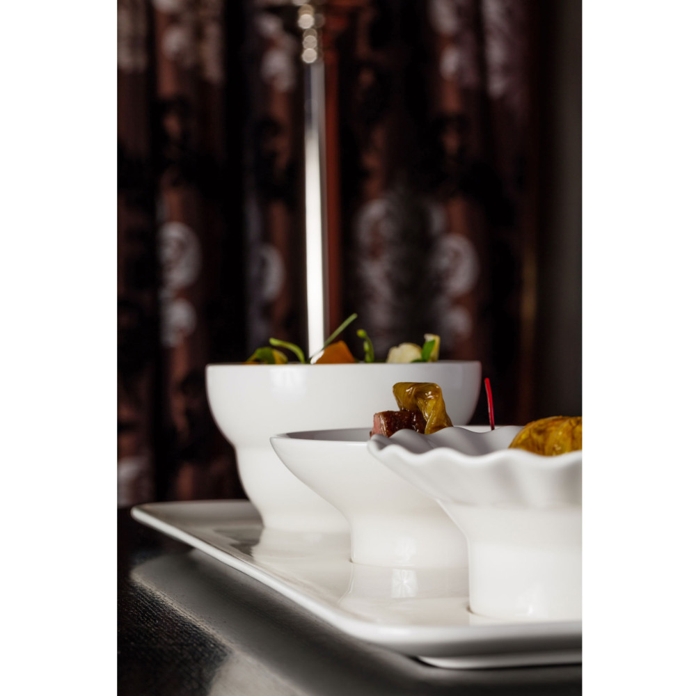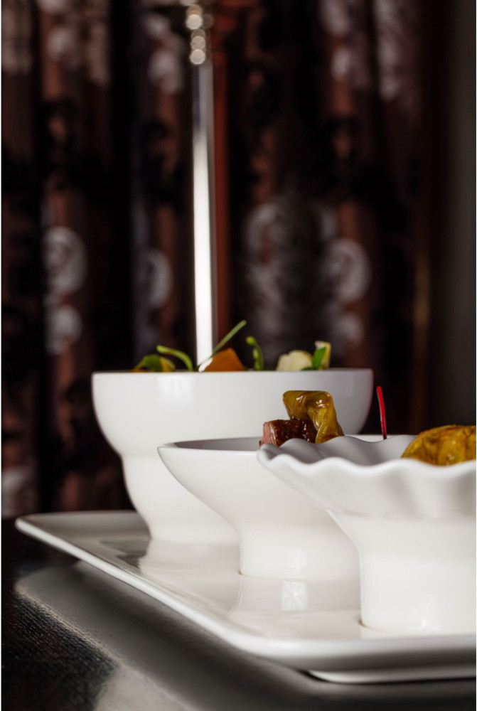 Kolekcja porcelany AUREA inspirowana formułą podawania "tapas" przedstawia stylowe minimalistyczne talerze-patery, na których idealnie komponują się mniejsze naczynka degustacyjne. Linię uzupełniają talerze głębokie oraz cała gama różnorodnych w kształtach mniejszych naczynek / miseczek do porcji degustacyjnych.