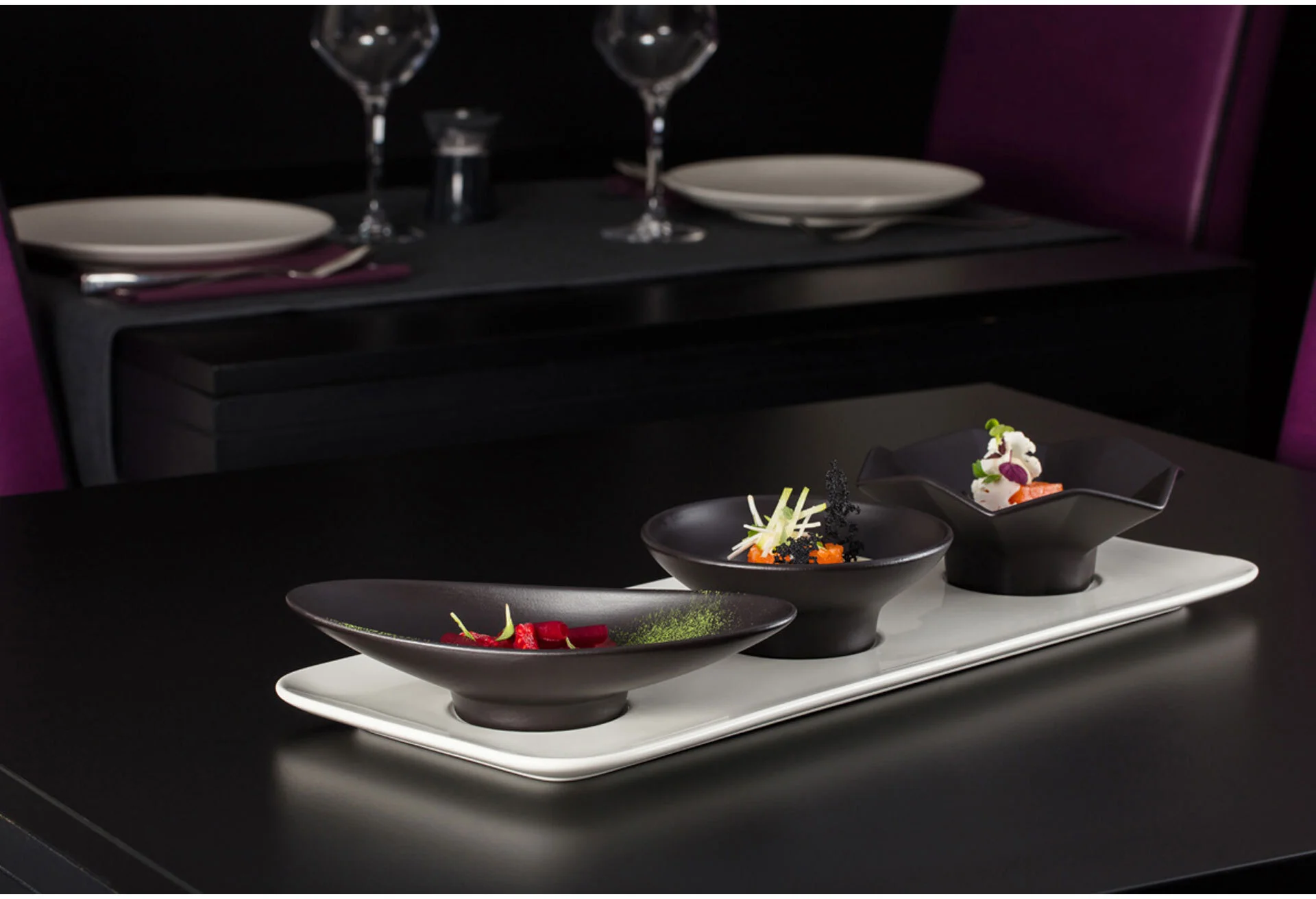 Kolekcja porcelany AUREA inspirowana formułą podawania "tapas" przedstawia stylowe minimalistyczne talerze-patery, na których idealnie komponują się mniejsze naczynka degustacyjne. Linię uzupełniają talerze głębokie oraz cała gama różnorodnych w kształtach mniejszych naczynek / miseczek do porcji degustacyjnych.