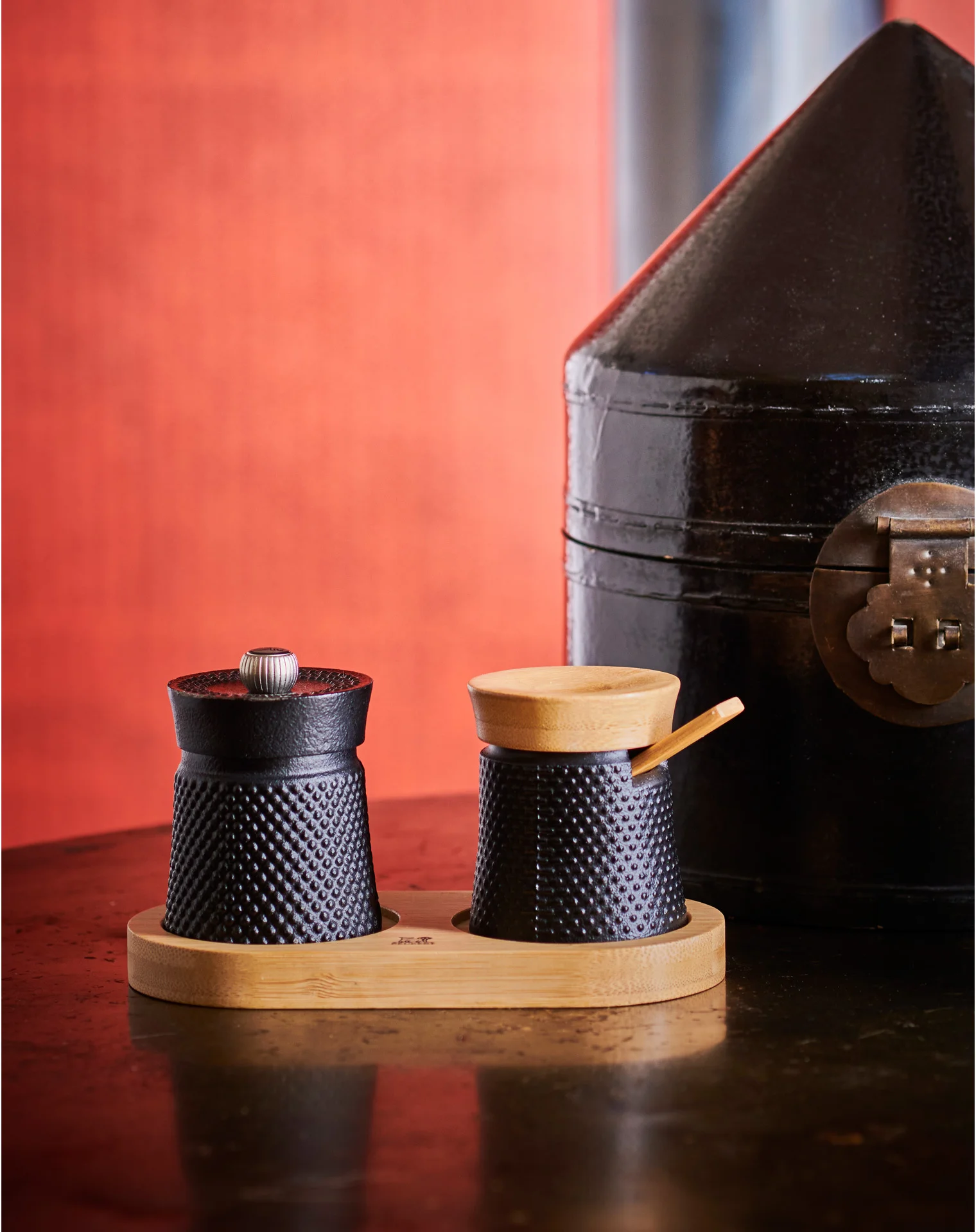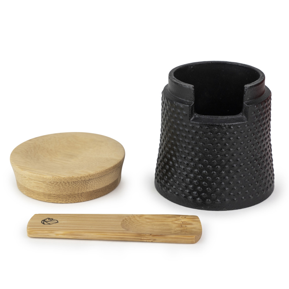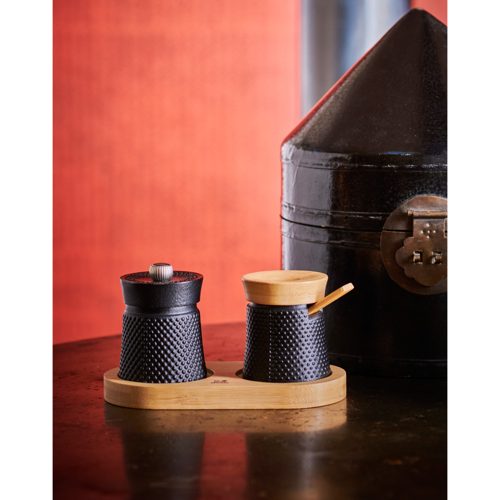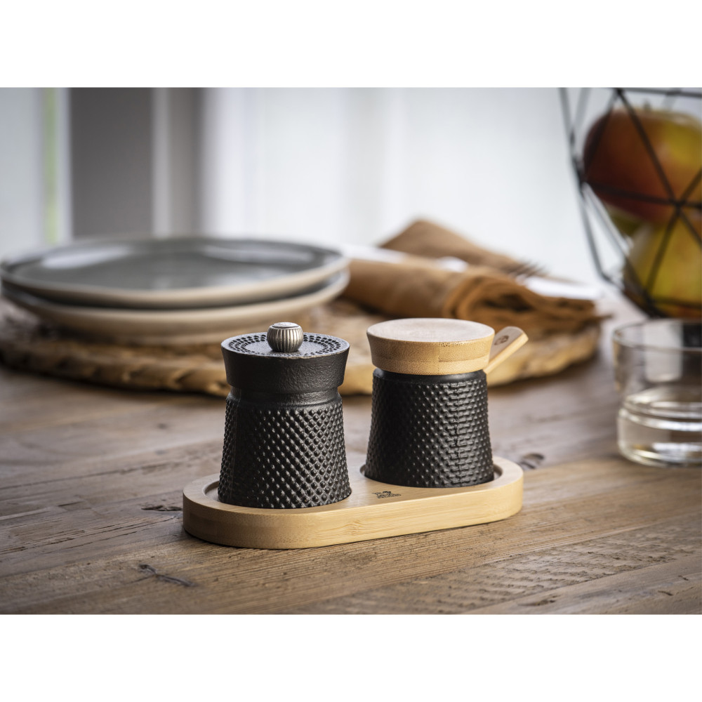 Bambusowa podstawa zestawu Bali Cast Iron nadaje ciepłe tło dla dwóch żeliwnych elementów: młynka do pieprzu o średnicy 8 cm oraz solniczki z pokrywką i delikatną bambusową łyżką, która zapewnia idealną porcję soli. Zestaw idealny do zaprezentowania na Twoim stole.