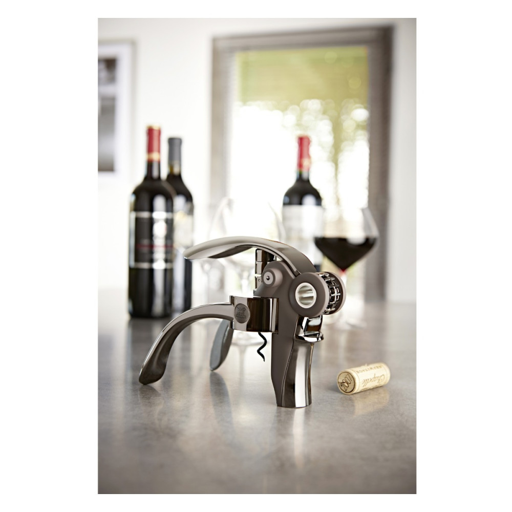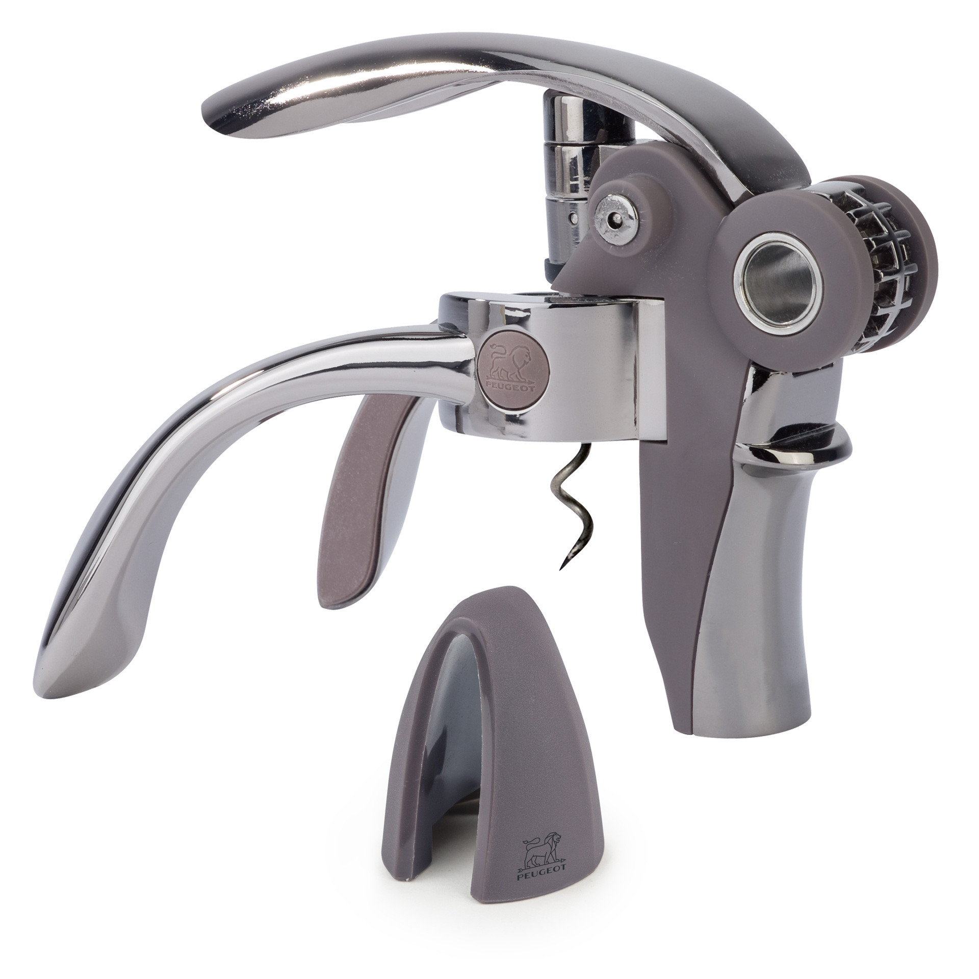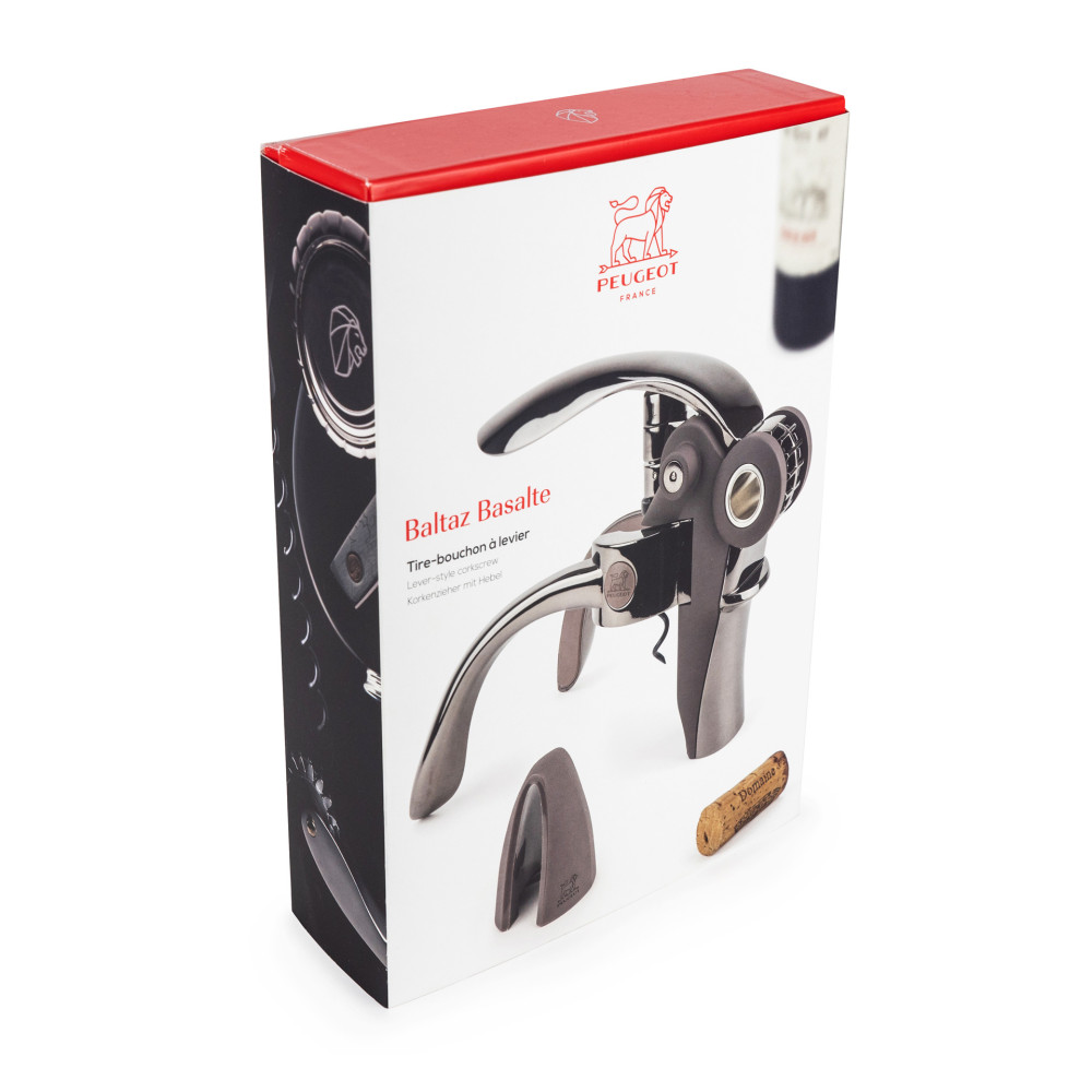 Korkociąg Peugeot Baltaz z dźwignią jest wyposażony w uchwyty, które stabilnie utrzymują butelkę na miejscu, dzięki czemu można bez wysiłku wyciągnąć korek. Wystarczy umieścić korkociąg na szyjce butelki, przytrzymać specjalnymi uchwytami i pociągnąć dźwignię w dół. Wiertło same wejdzie w korek, a ruch dźwigni w górę spowoduje wyciągnięcie korka z butelki. Został zaprojektowany ergonomicznie, aby zapewnić doskonałą i intuicyjną obsługę. Pasuje do każdej butelki. Jego bardzo elegancki, współczesny design jest dostępny w 3 wersjach kolorystycznych. Dostarczany jest w eleganckim, prezentowym pudełku. Do korkociągu dołączony jest nożyk do folii, który pozwoli szybko i łatwo przygotować butelkę do otwarcia.