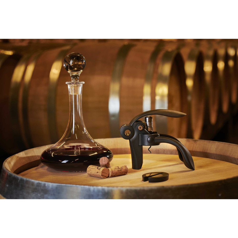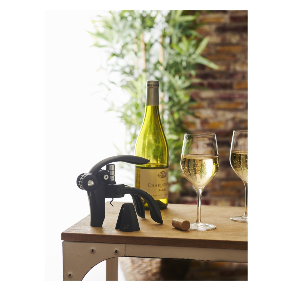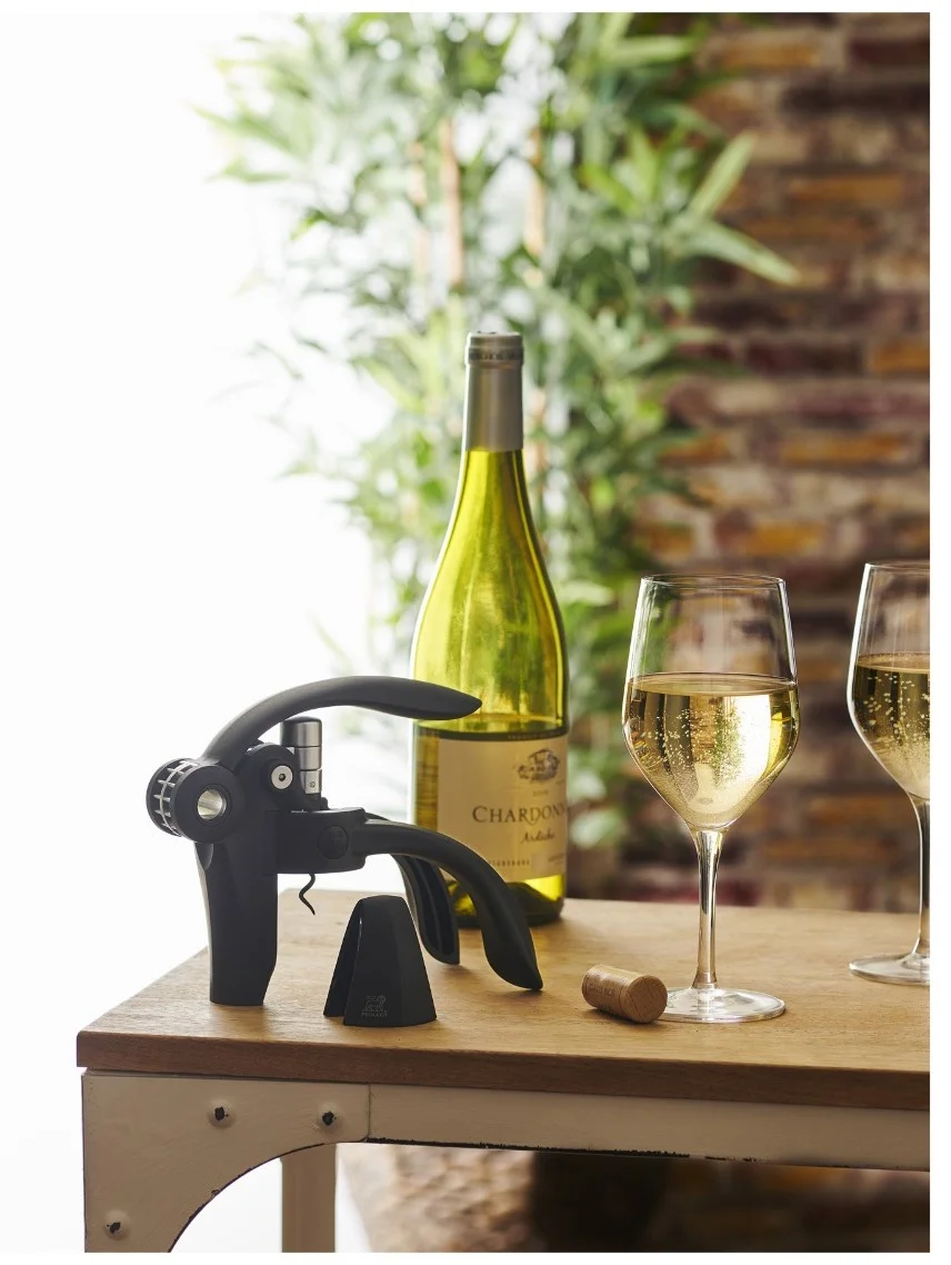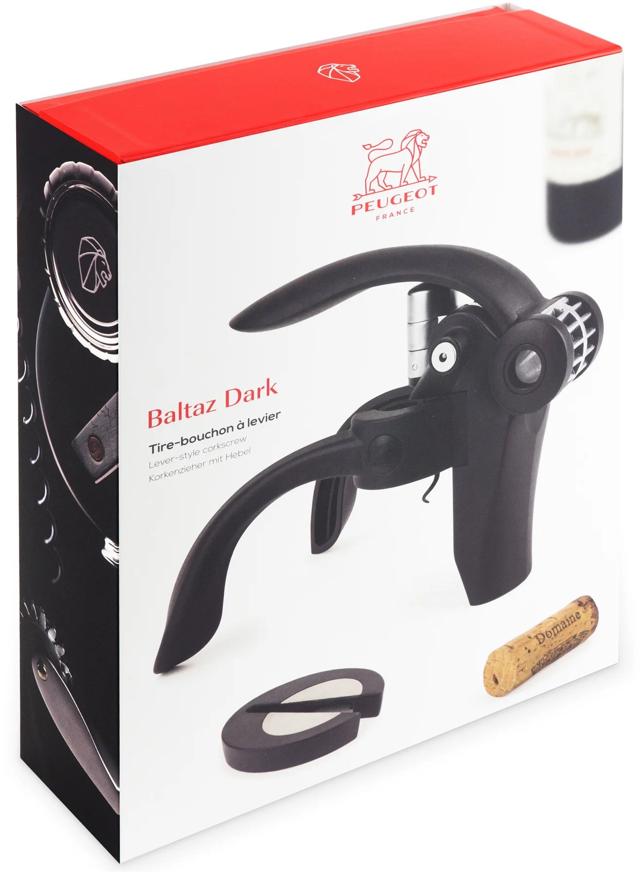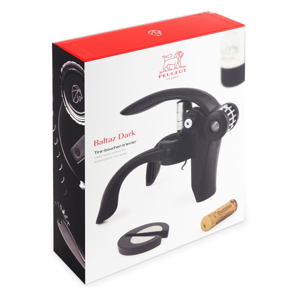 Korkociąg Peugeot Baltaz z dźwignią jest wyposażony w uchwyty, które stabilnie utrzymują butelkę na miejscu, dzięki czemu można bez wysiłku wyciągnąć korek. Wystarczy umieścić korkociąg na szyjce butelki, przytrzymać specjalnymi uchwytami i pociągnąć dźwignię w dół. Wiertło same wejdzie w korek, a ruch dźwigni w górę spowoduje wyciągnięcie korka z butelki. Został zaprojektowany ergonomicznie, aby zapewnić doskonałą i intuicyjną obsługę. Pasuje do każdej butelki. Jego bardzo elegancki, współczesny design jest dostępny w 3 wersjach kolorystycznych. Dostarczany jest w eleganckim, prezentowym pudełku. Do korkociągu dołączony jest nożyk do folii, który pozwoli szybko i łatwo przygotować butelkę do otwarcia.