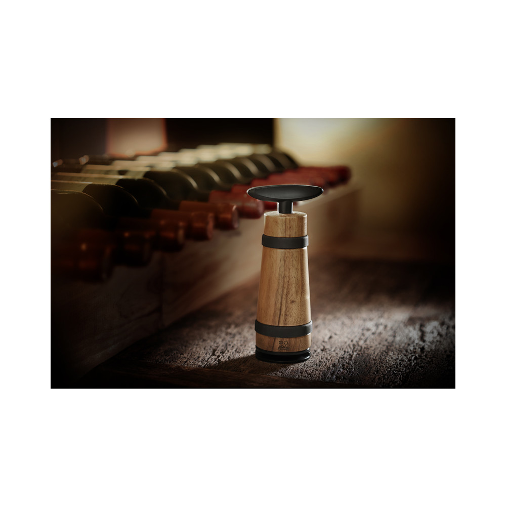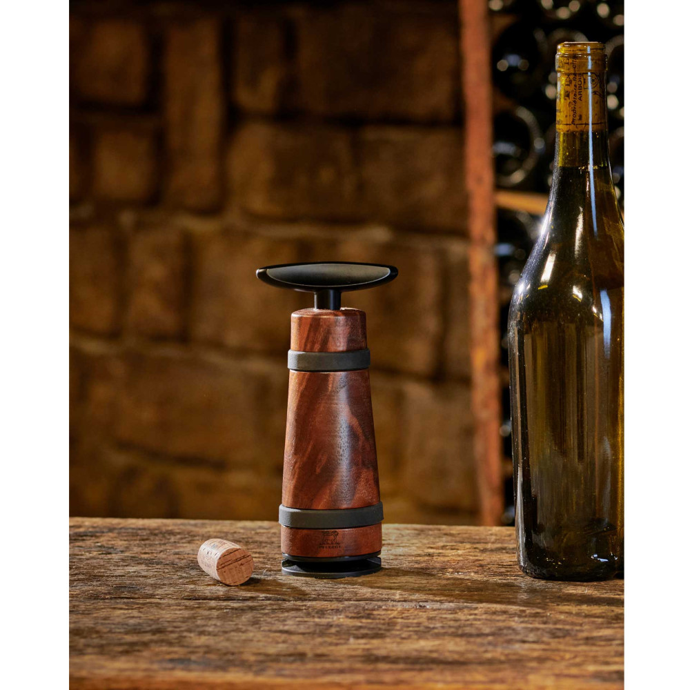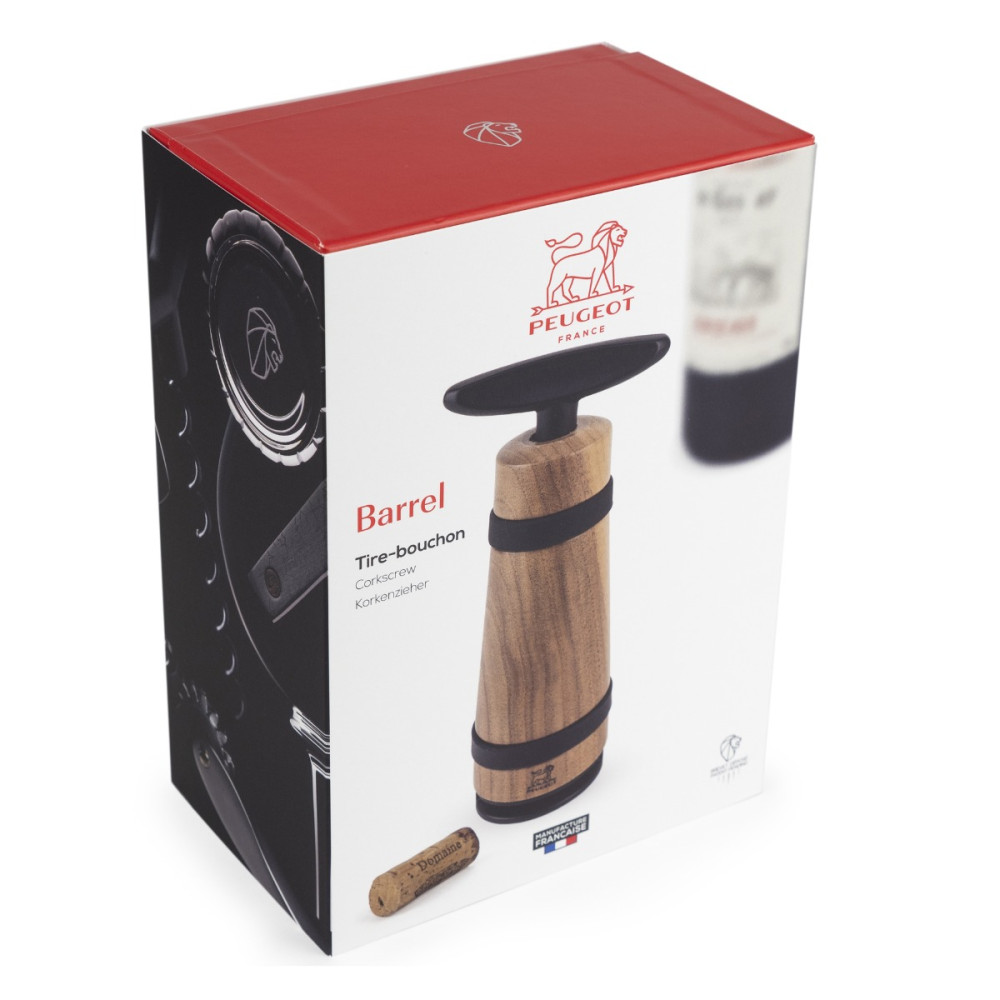 Korkociąg BARREL to zaskakująca forma połączona z niezawodnym mechanizmem. Wykonany został z największą starannością z certyfikowanego drzewa orzechowego (PEFC). Piękne, pionowe smugi drewna orzechowego łącza się gustownie z ciemnymi elementami korkociągu. Otoczony czarnymi, ozdobnymi pierścieniami, przywodzi na myśl wygląd beczek z winem. Innowacyjny, opatentowany przez firmę Peugeot mechanizm wyciągania korków zaskakuje pomysłowością i funkcjonalnością. Korkociąg Barrel to doskonały prezent dla wszystkich koneserów win. Korkociąg sprawdza się zarówno do wyciągania korków naturalnych jak i syntetycznych. Rękojeść korkociągu w kolorze czarnym wykonana jest ze stopu cynku znanego również pod nazwą ZAMAK.