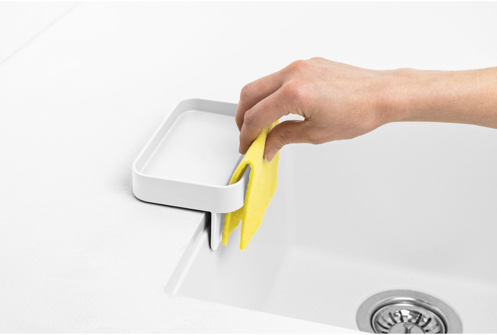 Uchwyt BATTIGIA to praktyczny organizer na akcesoria do zmywania. Umieszcza się go na ściance zlewu dzięki dwóm skutecznym przyssawkom zamontowanym pod spodem. Zamontowany w zlewozmywaku sprawi, że gąbka/ściereczka będzie ociekała bezpośrednio do zlewu, nie zachlapując powierzchni wokół. Część przeznaczona na gąbkę jest lekko pochylona, co zapobiega zastojowi wody. Krawędź służy do zawieszenia ściereczek kuchennych. To przydatne akcesorium ułatwia organizację pracy oraz utrzymanie higieny i porządku w kuchni.