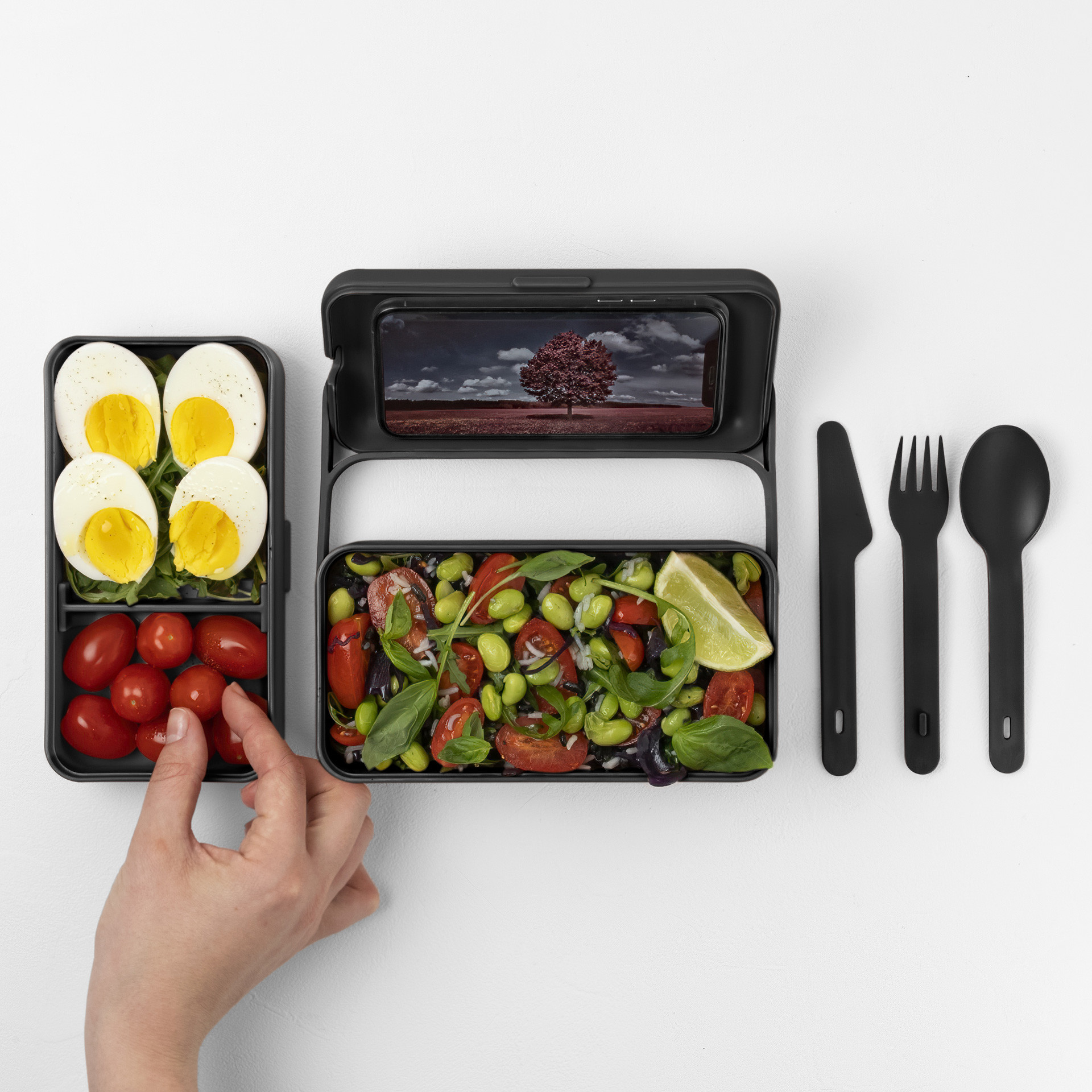 Wewnętrzny, ruchomy separator dzieli żywność, aby zachować ich najlepszy smak i konsystencję. Specjalny otwór odpowietrzający umożliwia równomierne nagrzewanie i bezpieczne użytkowanie w mikrofalówce. Hermetyczna pokrywa z otworem na słuchawki lub kabel do ładowania smartfona, staje się zarazem stabilną podstawką pod telefon. Łatwe zamykanie i otwieranie nie powodują szarpnięcia i przemieszczania się jedzenia wewnątrz. Dodatkowym zabezpieczeniem przed otwarciem jest efektowny pasek, który służy równie do wygodnego przenoszenia twojego posiłku. Zestaw zawiera sztućce, które kompaktowo umieszczone są na wierzchniej części pojemnika tuż pod pokrywą główną.