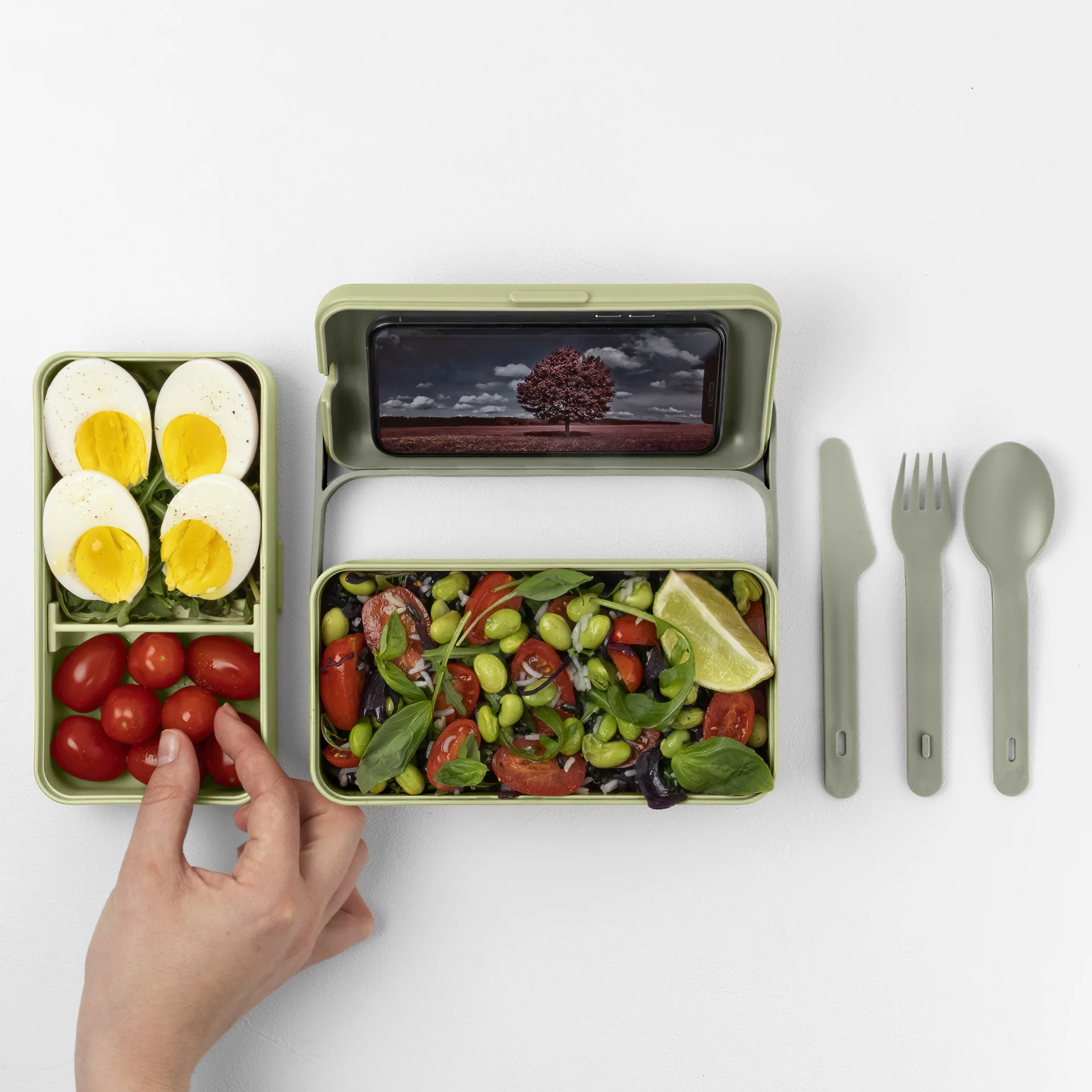 Wewnętrzny, ruchomy separator dzieli żywność, aby zachować ich najlepszy smak i konsystencję. Specjalny otwór odpowietrzający umożliwia równomierne nagrzewanie i bezpieczne użytkowanie w mikrofalówce. Hermetyczna pokrywa z otworem na słuchawki lub kabel do ładowania smartfona, staje się zarazem stabilną podstawką pod telefon. Łatwe zamykanie i otwieranie nie powodują szarpnięcia i przemieszczania się jedzenia wewnątrz. Dodatkowym zabezpieczeniem przed otwarciem jest efektowny pasek, który służy równie do wygodnego przenoszenia twojego posiłku. Zestaw zawiera sztućce, które kompaktowo umieszczone są na wierzchniej części pojemnika tuż pod pokrywą główną.