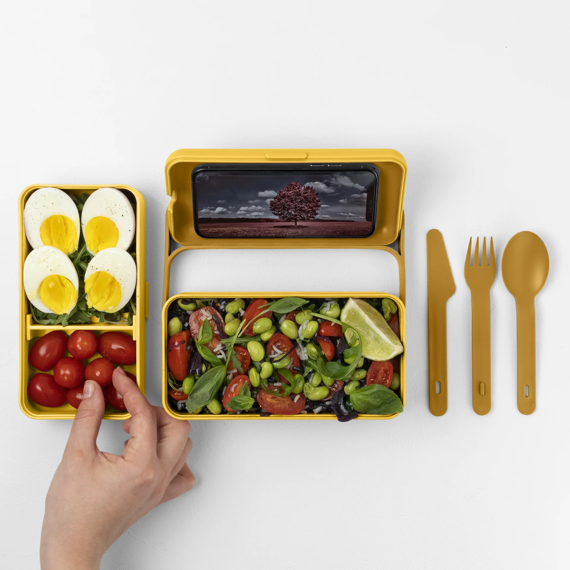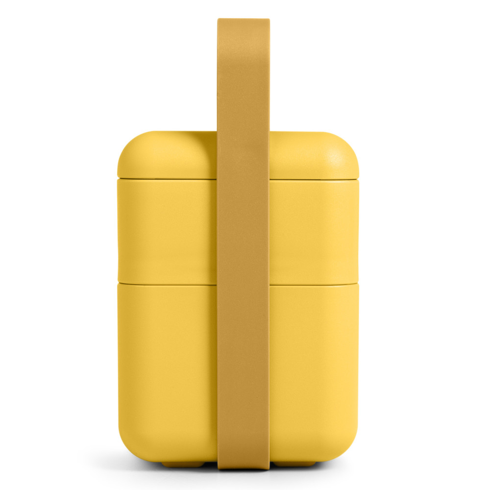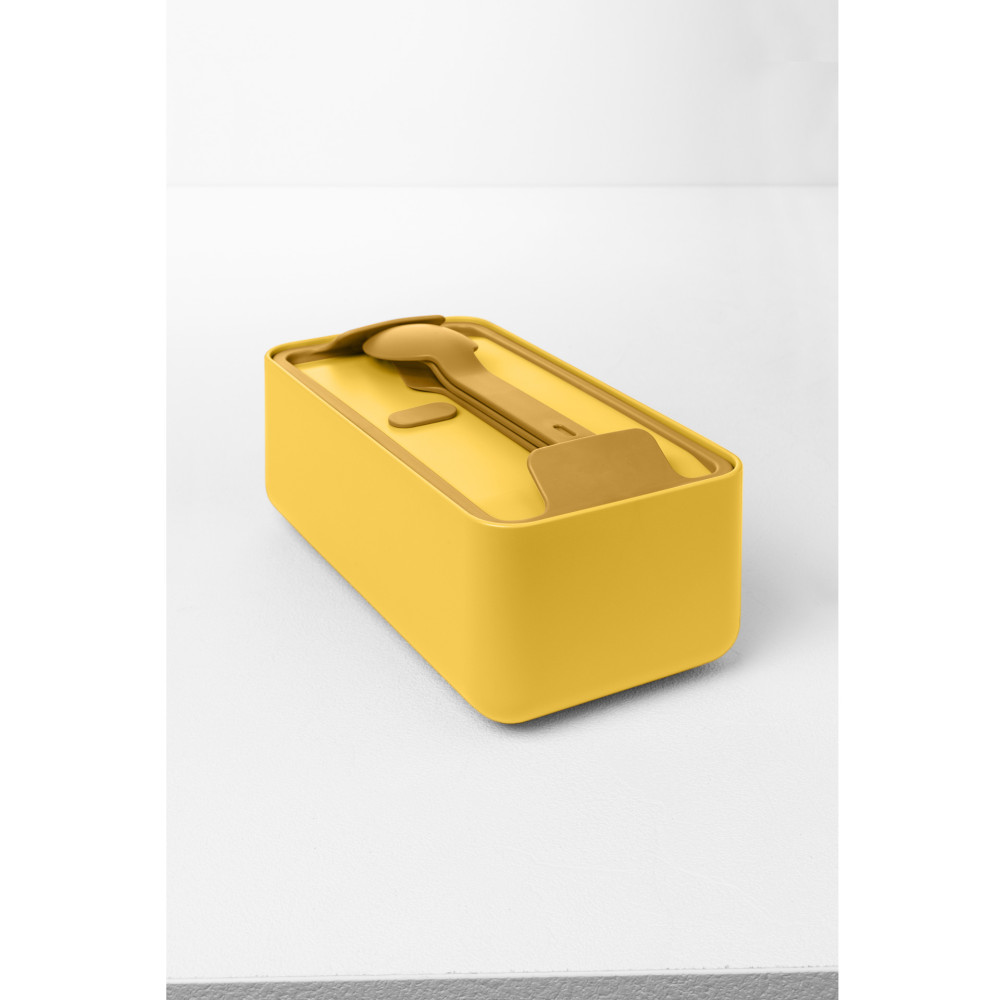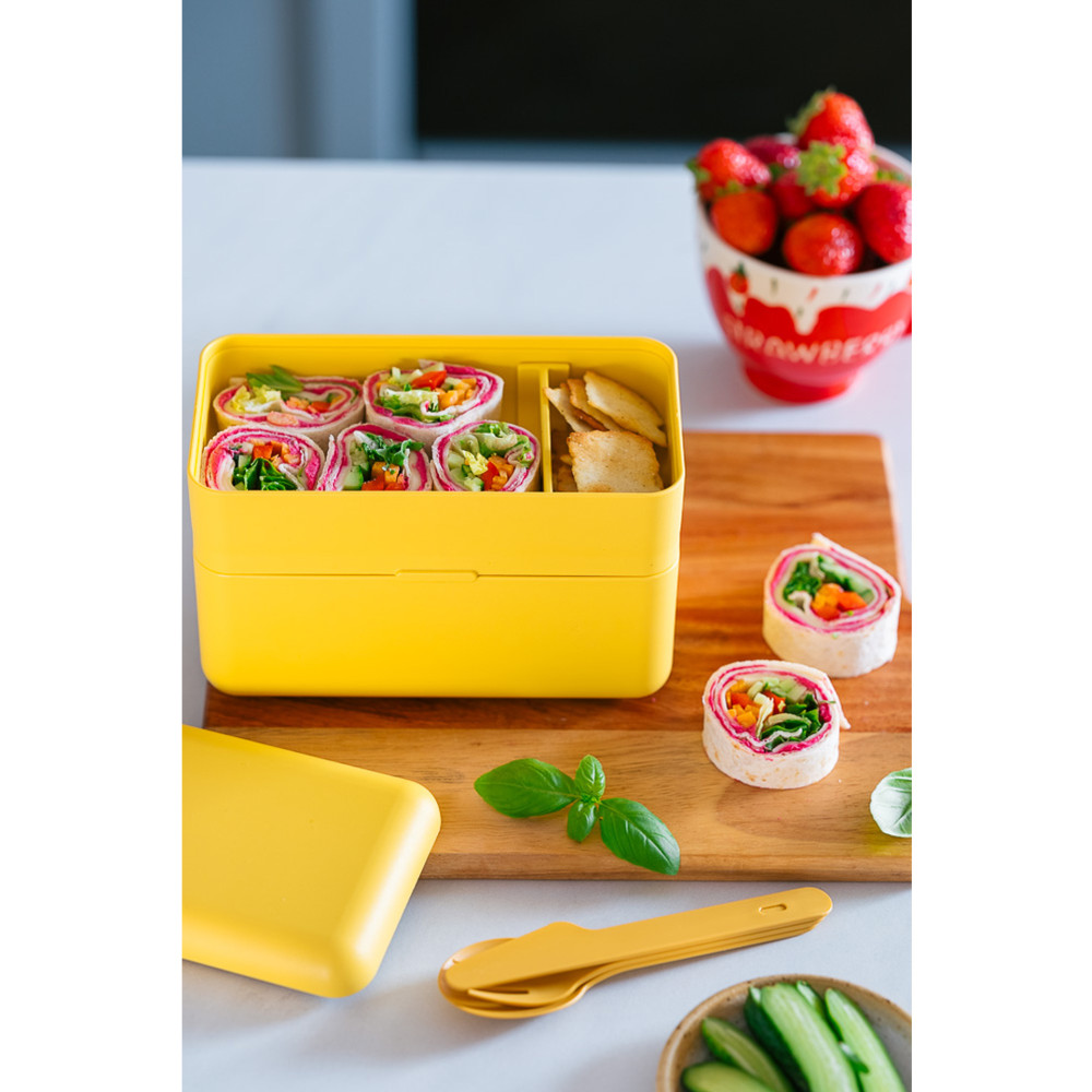 Wewnętrzny, ruchomy separator dzieli żywność, aby zachować ich najlepszy smak i konsystencję. Specjalny otwór odpowietrzający umożliwia równomierne nagrzewanie i bezpieczne użytkowanie w mikrofalówce. Hermetyczna pokrywa z otworem na słuchawki lub kabel do ładowania smartfona, staje się zarazem stabilną podstawką pod telefon. Łatwe zamykanie i otwieranie nie powodują szarpnięcia i przemieszczania się jedzenia wewnątrz. Dodatkowym zabezpieczeniem przed otwarciem jest efektowny pasek, który służy równie do wygodnego przenoszenia twojego posiłku. Zestaw zawiera sztućce, które kompaktowo umieszczone są na wierzchniej części pojemnika tuż pod pokrywą główną.