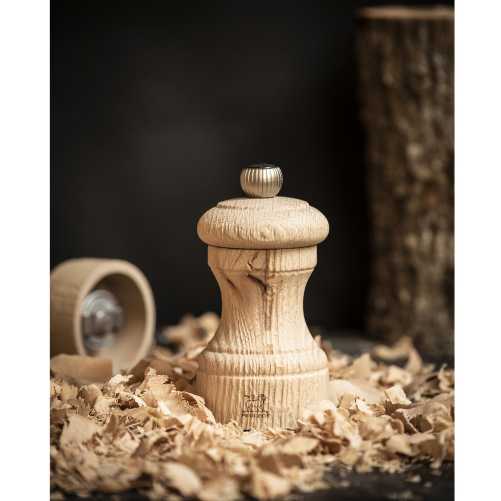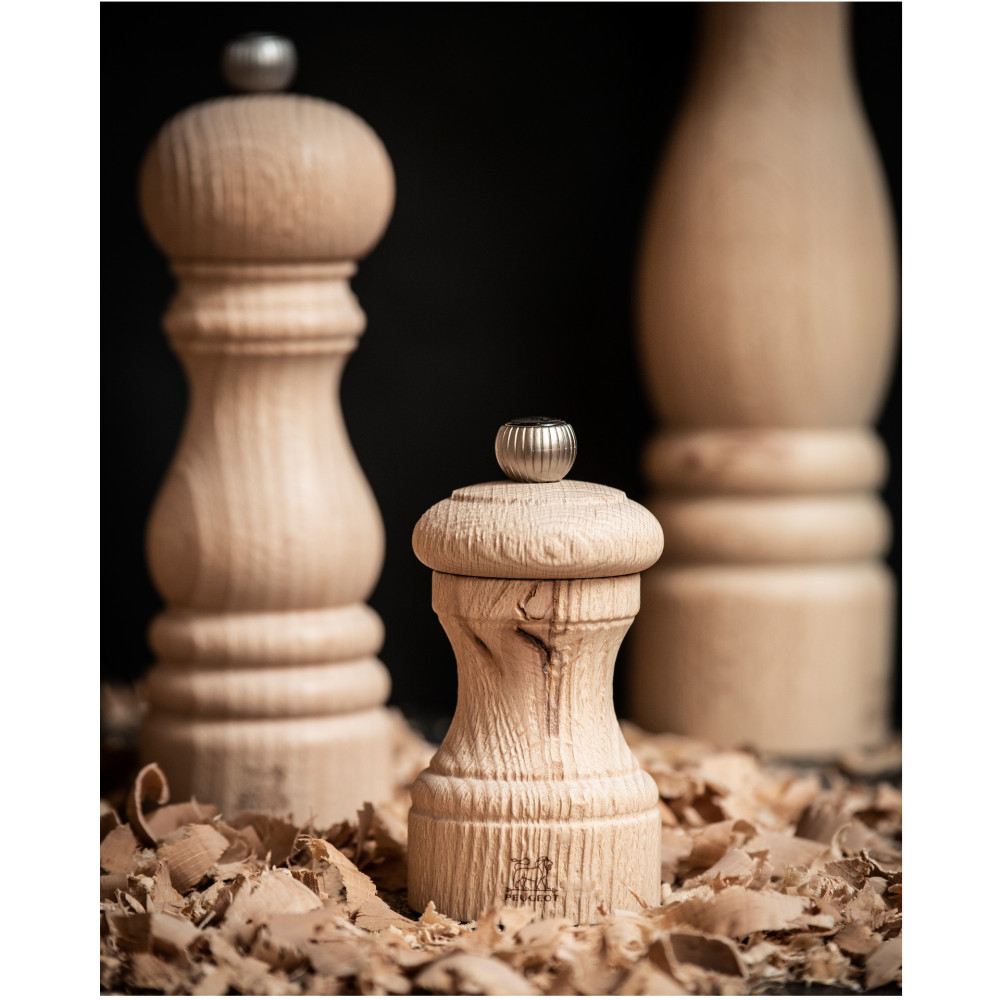 Projektanci firmy PEUEGOT postanowili wykorzystać drewno, które ze względu na pewne niedoskonałości, odrzucane zostało podczas produkcji innych linii młynków. Aby uzyskać niepowtarzalny, naturalny wygląd, który jest charakterystyczny dla młynków PARIS NATURE, drewno nadające się do ponownego użycia, poddaje się teksturowaniu poprzez natryskiwanie drobinkami łupin orzecha włoskiego. Korpus młynka w całości wykonany jest z drewna bukowego pozyskanego z certyfikowanych lasów PEFC™. Wytoczone drewno zabezpieczane jest ekologicznym lakierem pochodzenia roślinnego składającym się z oleju lnianego i wosku Carnauba. W ten oto sposób zachowano naturalny charakter rysunku drewna i zapewniono jego maksymalną trwałość.