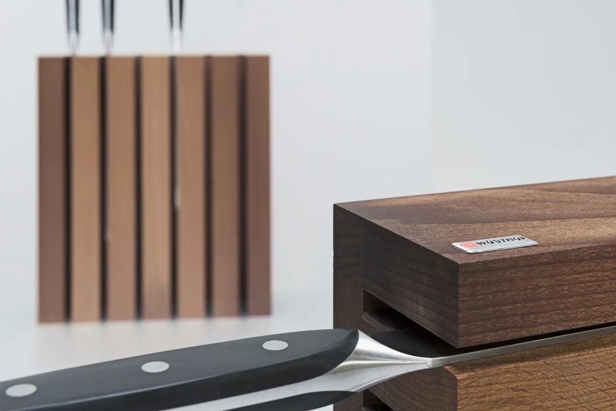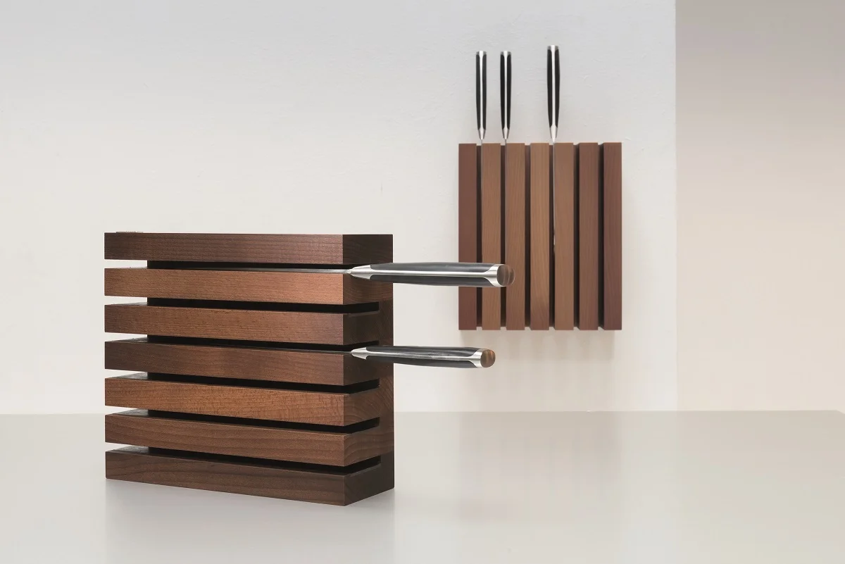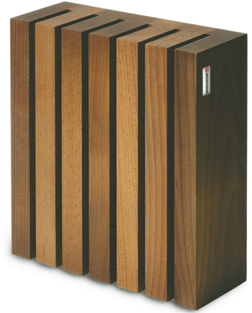 Blok do przechowywania noży wykonany z termo utwardzonego drewna bukowego. Ciepła, ciemna tonacja drewna wraz z bardzo oryginalnym designem bloku stanowią, że oprócz walorów praktycznych będzie on ozdobą każdej kuchennej przestrzeni. Dostosowany do przechowywania 6 noży o dowolnej długości ostrza, które dzięki magnetycznym wkałdom w drewnianej konstrukcji utrzymują noże we właściwej pozycji. Może być usatwiony w pozycji poziomej jak i pionowej.