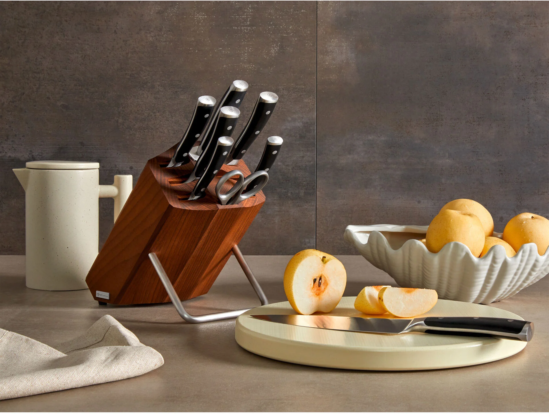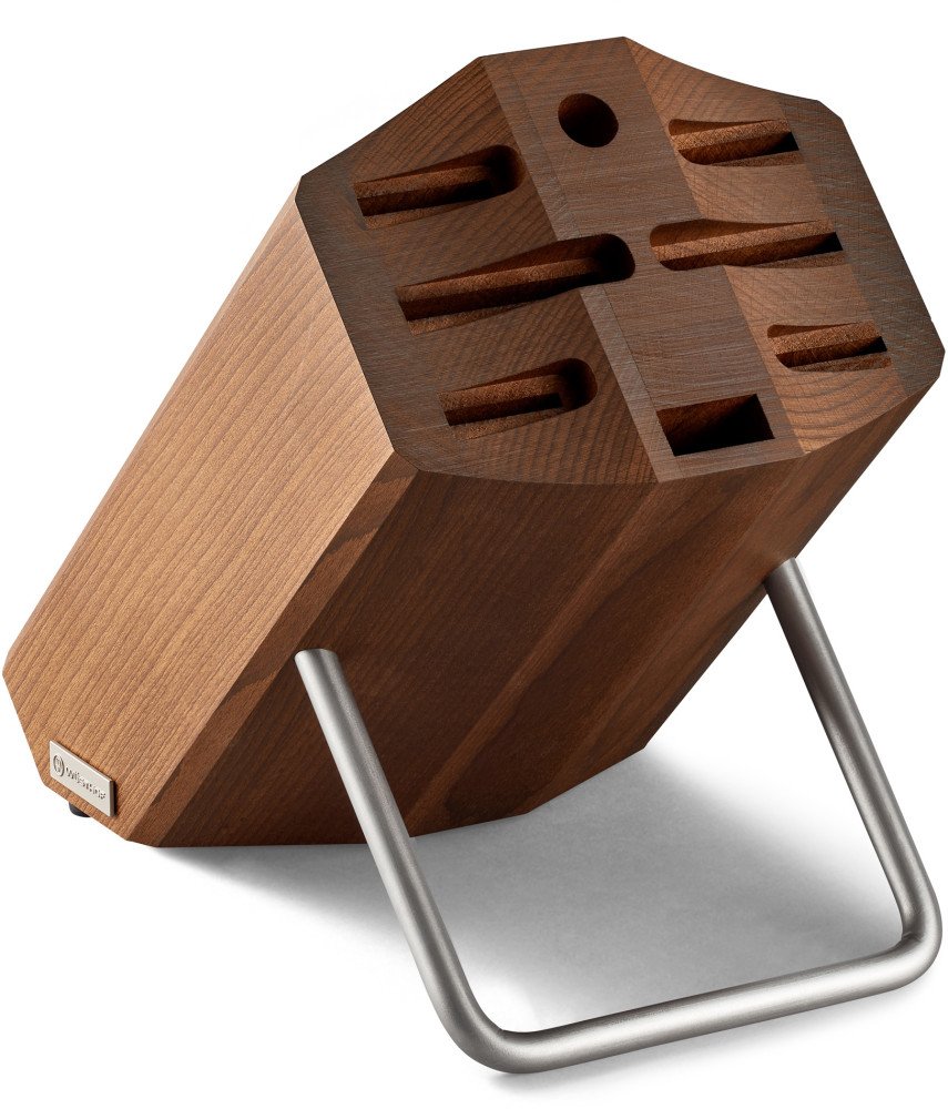 Ten elegancki wykonany z drewna bukowego blok na noże marki Wusthof będzie stanowił prostą a zarazem elegancką ozdobę kuchennego blatu. Posiada 6 otworów do przechowywania noży, oraz dodatkowe 2 na akcesoria typu stalka czy nożyczki. Wsparty na stalowej, stabilnej nóżce jest praktycznym rozwiązaniem, aby noże były zawsze w zasięgu ręki.