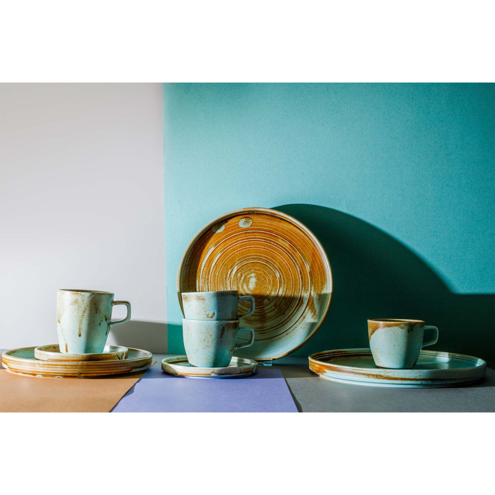 Kolekcja składająca się z płaskich talerzy z lekko podniesionym rantem, filiżanek i spodków w kolorze turkusowo-rdzawym. To piękne połączenie kolorów podkreśli wyjątkowy smak każdej potrawy, zestawu śniadaniowego czy deseru. Zadbaj o wyjątkową aranżację Twojej jadalni i ciesz się chwilami spędzonymi w ulubionym stylu. Modna kolorystyka, matowe wykończenie oraz minimalne żłobienia to nawiązanie do stylu etnicznego. Pokuś się o odrobinę szaleństwa i połącz kolekcję BRASSI z zastawą stołową Verlo FIRE. Ten duet z pewnością wyróżni się na tle pozostałej zastawy stołowej.