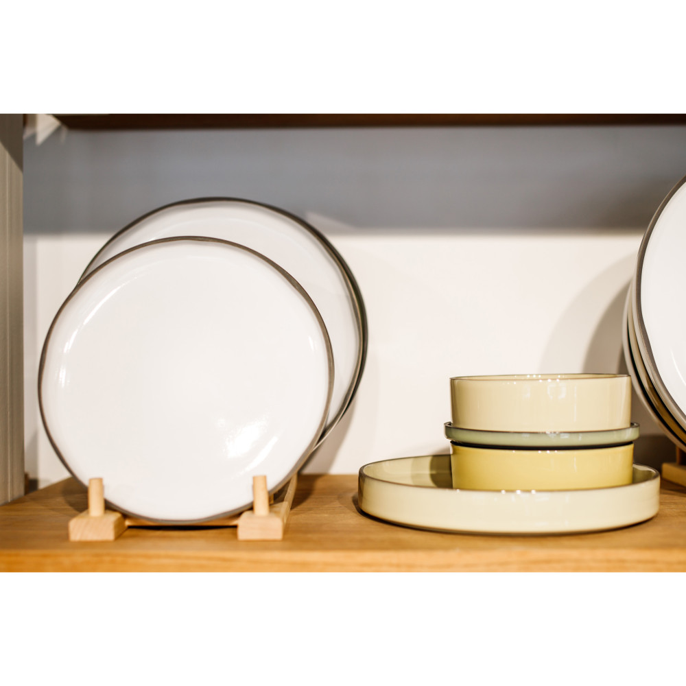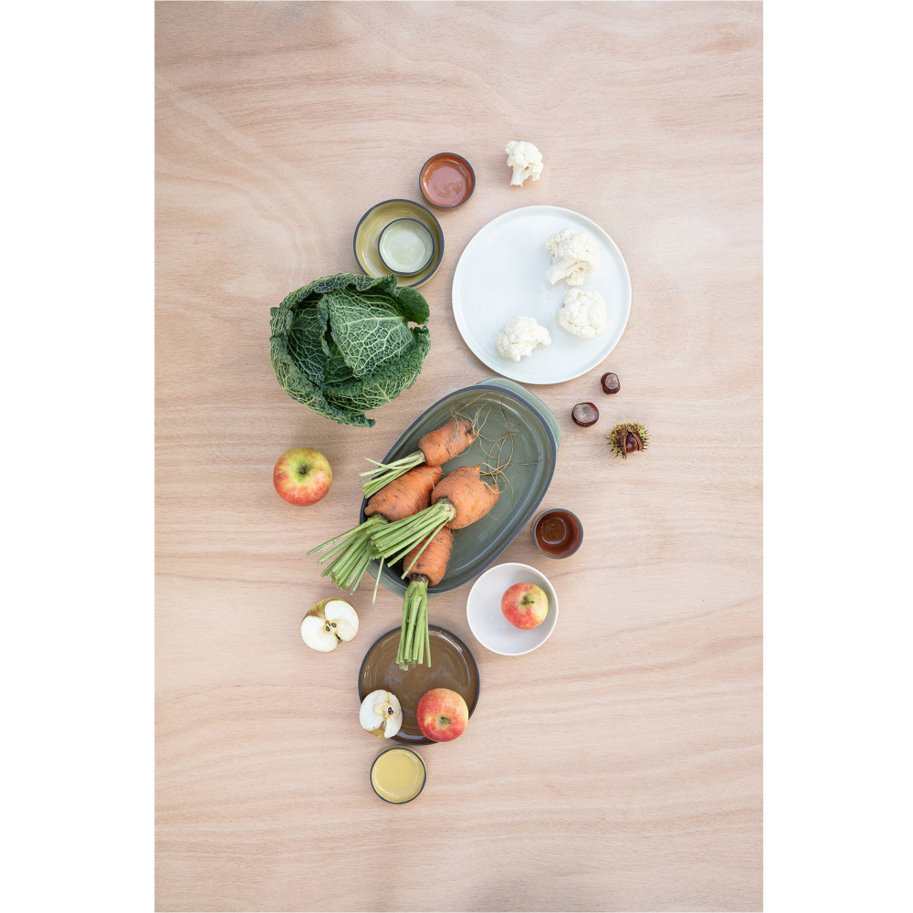 Porcelana CARACTERE stworzona ze specjalnie wyselekcjonowanej czarnej gliny, szkliwionej w jednej z siedmiu barw, ręcznie wykończonej tak aby uzyskać unikalnie kształtowany dla każdego egzemplarza - czarny rant. Elementy porcelany dostępne są w siedmiu kolorach inspirowanych przyprawami, mogą być dowolnie zestawiane utrzymując spójną tonację. Ponadto nadają się do sztaplowania, zaś płaskie dna gwarantują utrzymanie temperatury potraw.