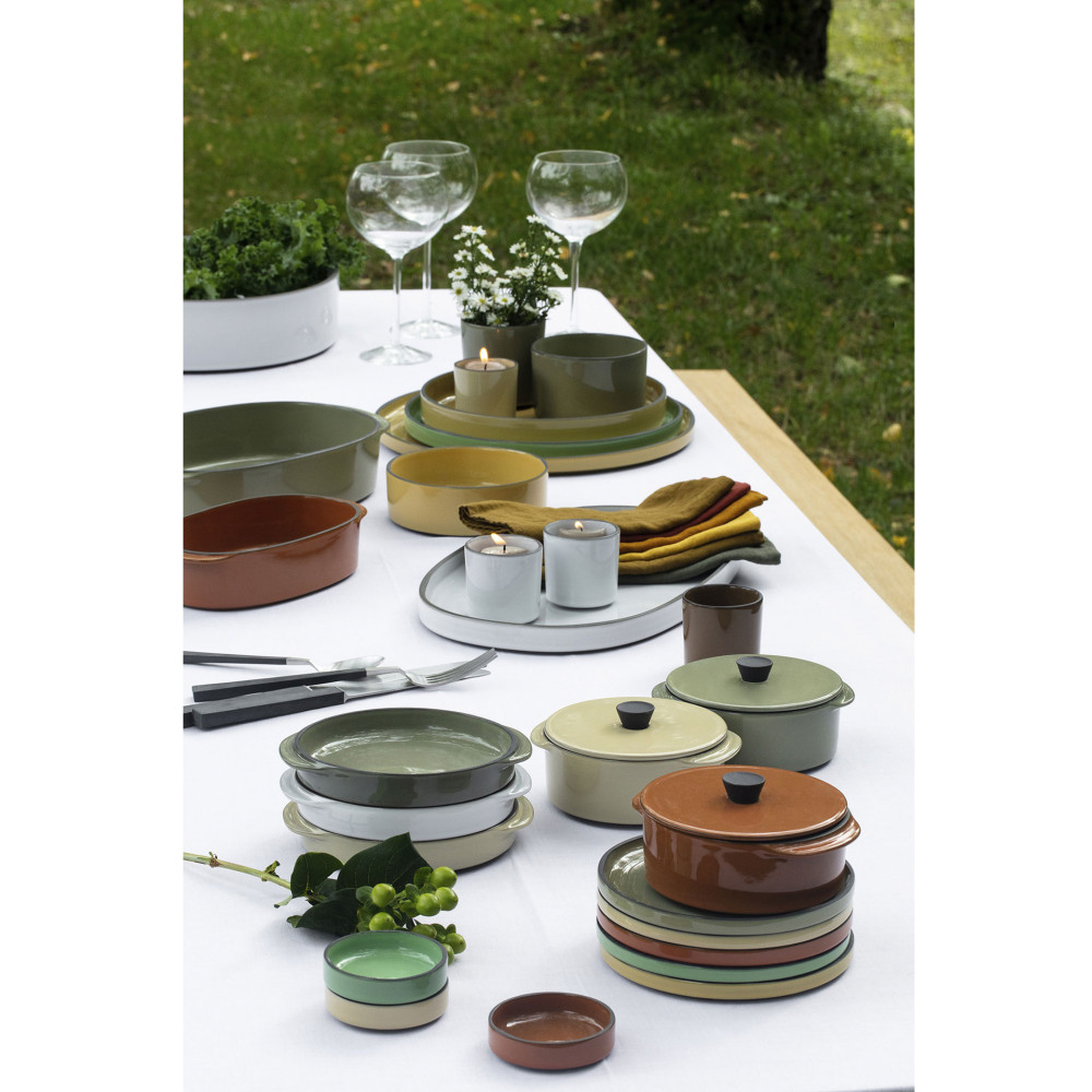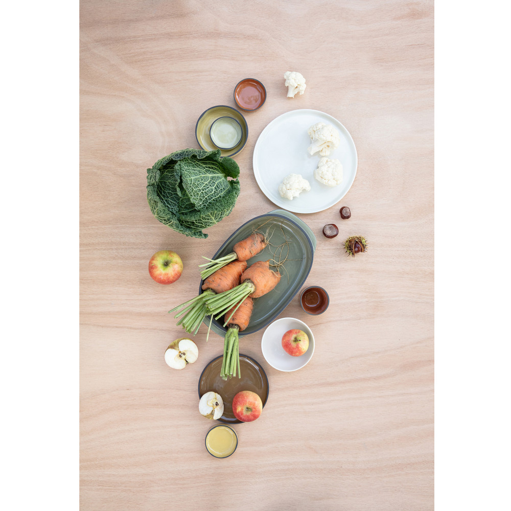 Porcelana CARACTERE stworzona ze specjalnie wyselekcjonowanej czarnej gliny, szkliwionej w jednej z siedmiu barw, ręcznie wykończonej tak aby uzyskać unikalnie kształtowany dla każdego egzemplarza - czarny rant. Elementy porcelany dostępne są w siedmiu kolorach inspirowanych przyprawami, mogą być dowolnie zestawiane utrzymując spójną tonację. Ponadto nadają się do sztaplowania, zaś płaskie dna gwarantują utrzymanie temperatury potraw.