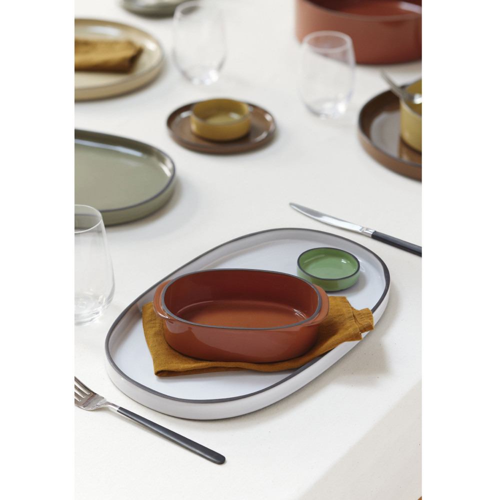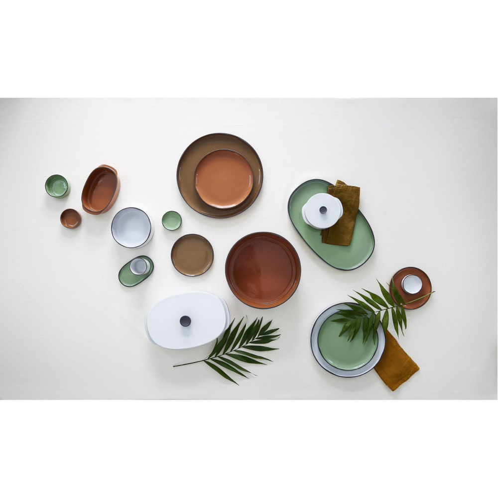 Porcelana CARACTERE stworzona ze specjalnie wyselekcjonowanej czarnej gliny, szkliwionej w jednej z siedmiu barw, ręcznie wykończonej tak aby uzyskać unikalnie kształtowany dla każdego egzemplarza - czarny rant. Elementy porcelany dostępne są w siedmiu kolorach inspirowanych przyprawami, mogą być dowolnie zestawiane utrzymując spójną tonację. Ponadto nadają się do sztaplowania, zaś płaskie dna gwarantują utrzymanie temperatury potraw.