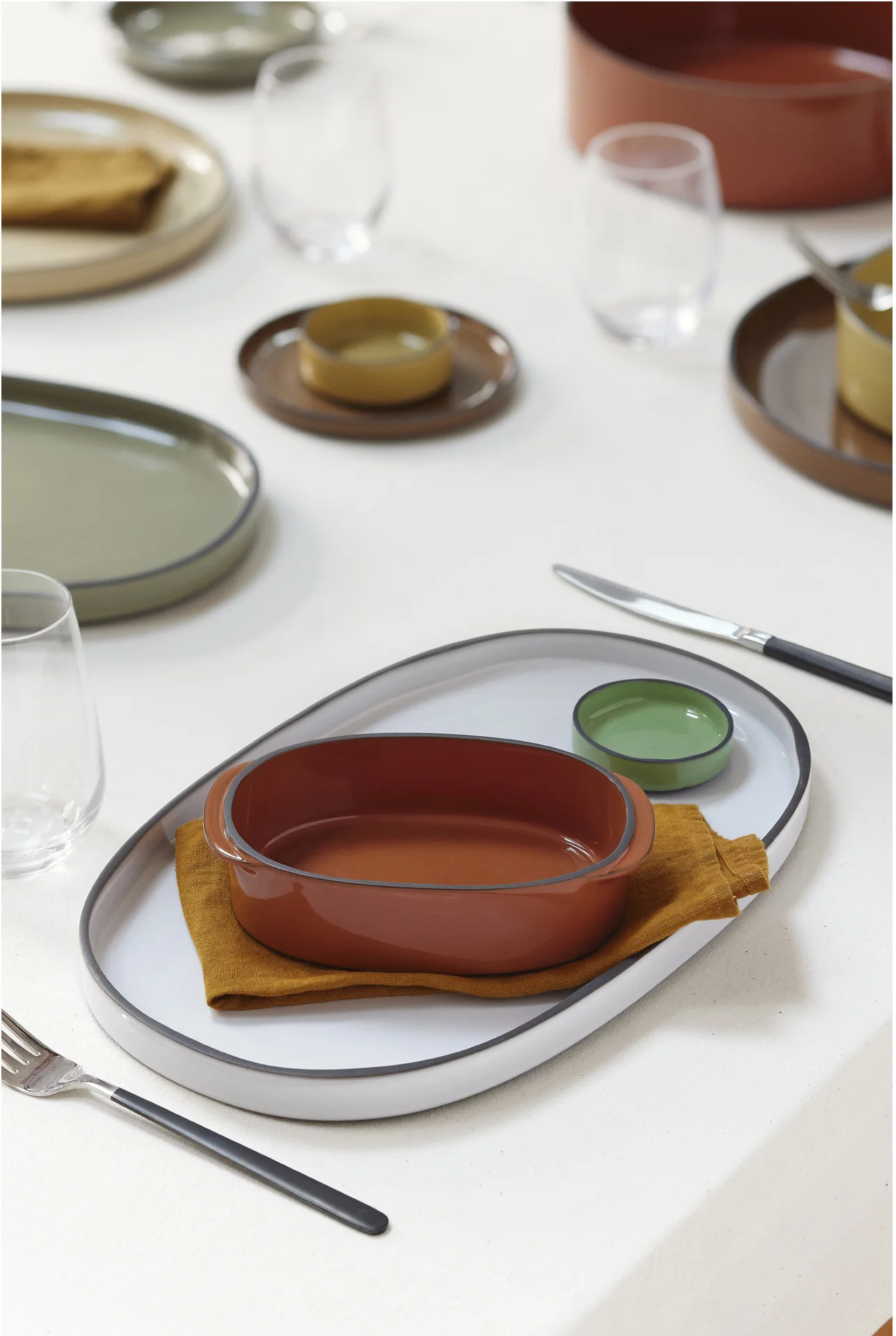 Porcelana CARACTERE stworzona ze specjalnie wyselekcjonowanej czarnej gliny, szkliwionej w jednej z siedmiu barw, ręcznie wykończonej tak aby uzyskać unikalnie kształtowany dla każdego egzemplarza - czarny rant. Elementy porcelany dostępne są w siedmiu kolorach inspirowanych przyprawami, mogą być dowolnie zestawiane utrzymując spójną tonację. Ponadto nadają się do sztaplowania, zaś płaskie dna gwarantują utrzymanie temperatury potraw.