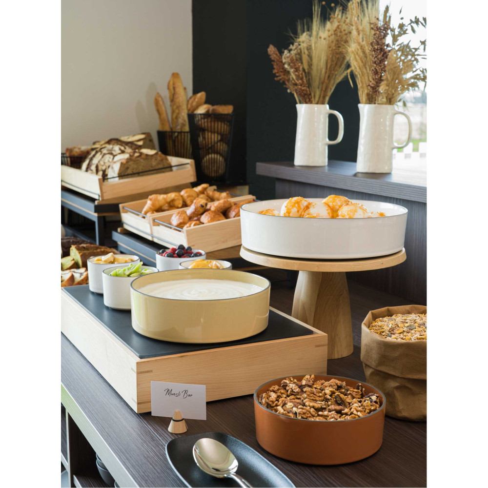 Porcelana CARACTERE stworzona ze specjalnie wyselekcjonowanej czarnej gliny, szkliwionej w jednej z siedmiu barw, ręcznie wykończonej tak aby uzyskać unikalnie kształtowany dla każdego egzemplarza - czarny rant. Elementy porcelany dostępne są w siedmiu kolorach inspirowanych przyprawami, mogą być dowolnie zestawiane utrzymując spójną tonację. Ponadto nadają się do sztaplowania, zaś płaskie dna gwarantują utrzymanie temperatury potraw.