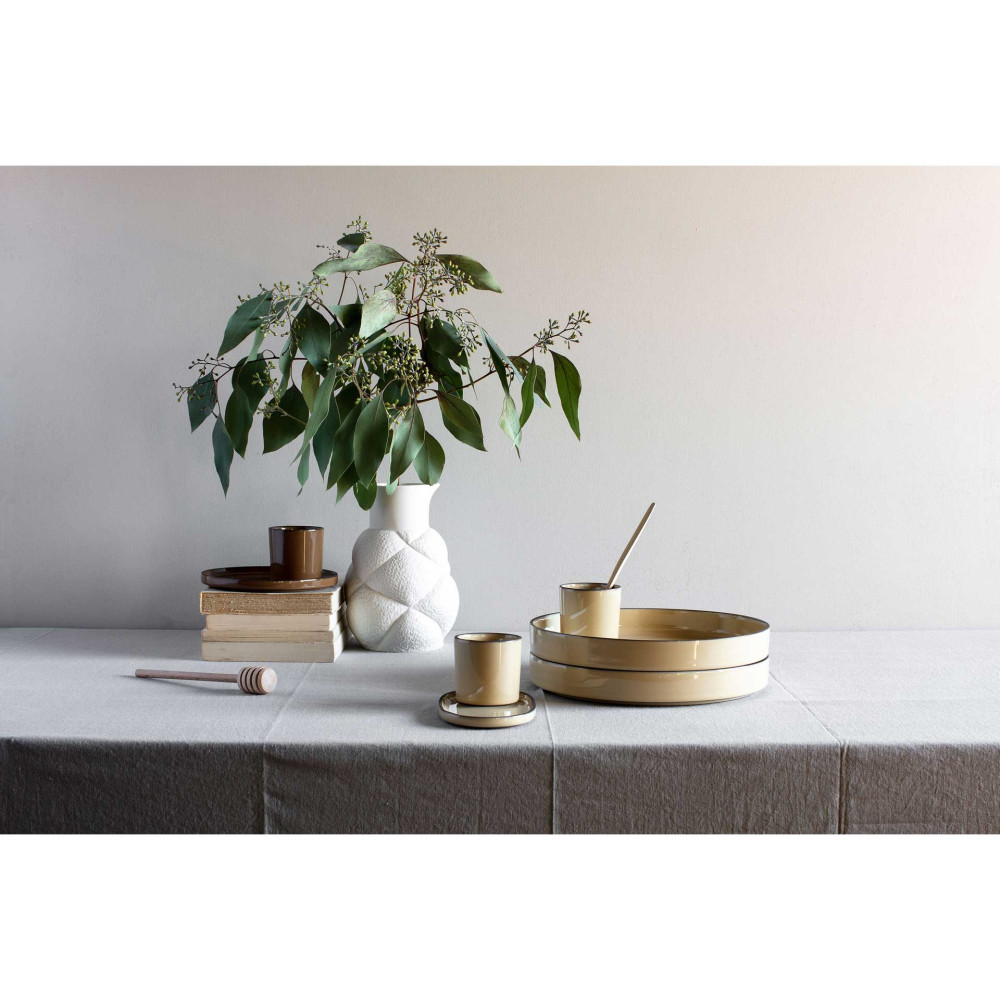 Porcelana CARACTERE stworzona ze specjalnie wyselekcjonowanej czarnej gliny, szkliwionej w jednej z siedmiu barw, ręcznie wykończonej tak aby uzyskać unikalnie kształtowany dla każdego egzemplarza - czarny rant. Elementy porcelany dostępne są w siedmiu kolorach inspirowanych przyprawami, mogą być dowolnie zestawiane utrzymując spójną tonację. Ponadto nadają się do sztaplowania, zaś płaskie dna gwarantują utrzymanie temperatury potraw.