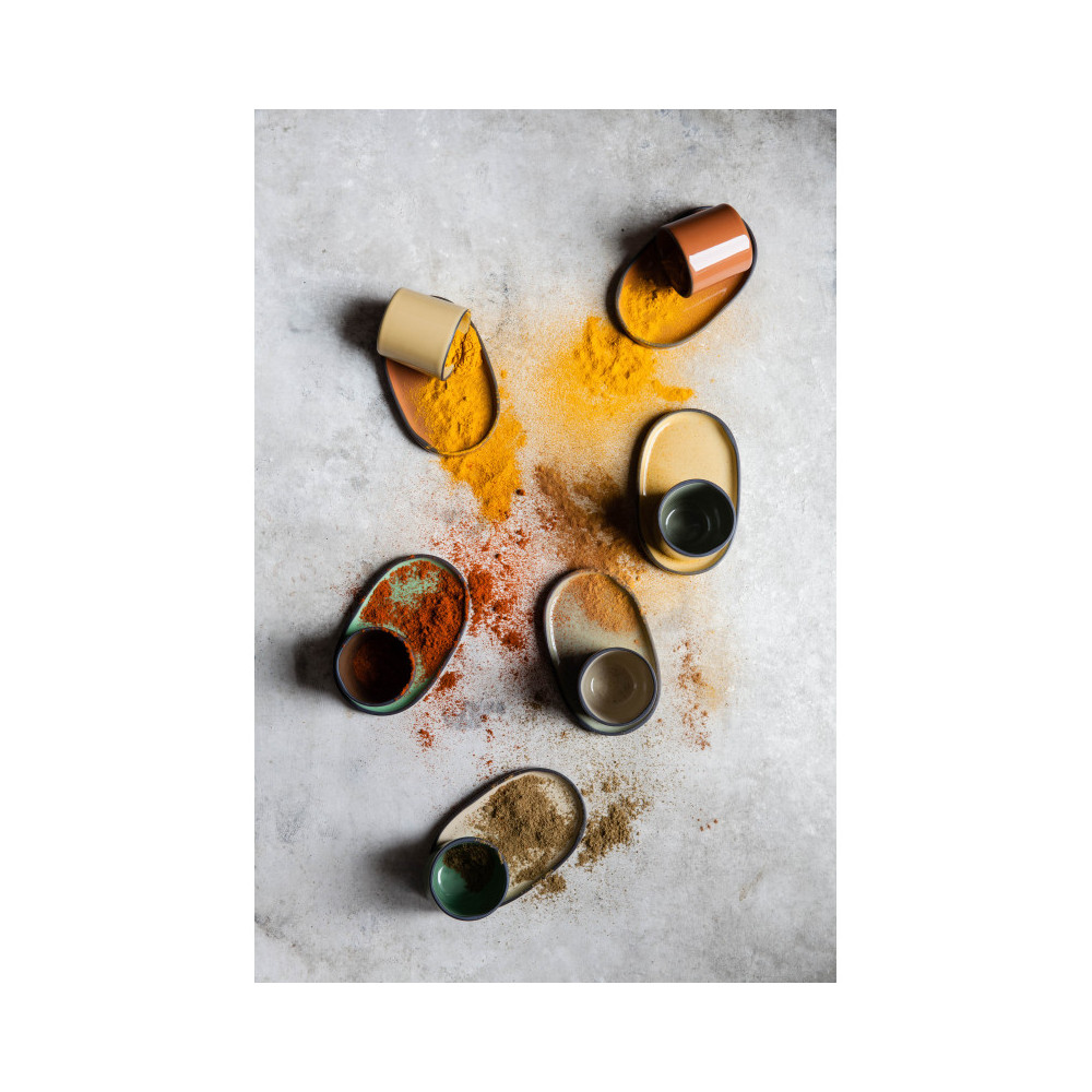 Porcelana CARACTERE stworzona ze specjalnie wyselekcjonowanej czarnej gliny, szkliwionej w jednej z siedmiu barw, ręcznie wykończonej tak aby uzyskać unikalnie kształtowany dla każdego egzemplarza - czarny rant. Elementy porcelany dostępne są w siedmiu kolorach inspirowanych przyprawami, mogą być dowolnie zestawiane utrzymując spójną tonację. Ponadto nadają się do sztaplowania, zaś płaskie dna gwarantują utrzymanie temperatury potraw.