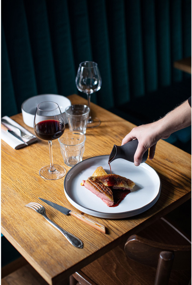 Porcelana CARACTERE stworzona ze specjalnie wyselekcjonowanej czarnej gliny, szkliwionej w jednej z siedmiu barw, ręcznie wykończonej tak aby uzyskać unikalnie kształtowany dla każdego egzemplarza - czarny rant. Elementy porcelany dostępne są w siedmiu kolorach inspirowanych przyprawami, mogą być dowolnie zestawiane utrzymując spójną tonację. Ponadto nadają się do sztaplowania, zaś płaskie dna gwarantują utrzymanie temperatury potraw.