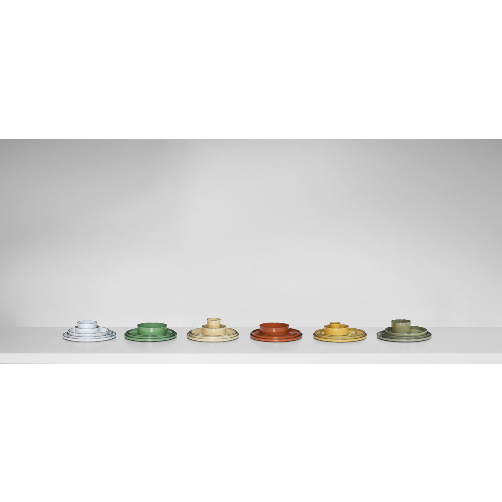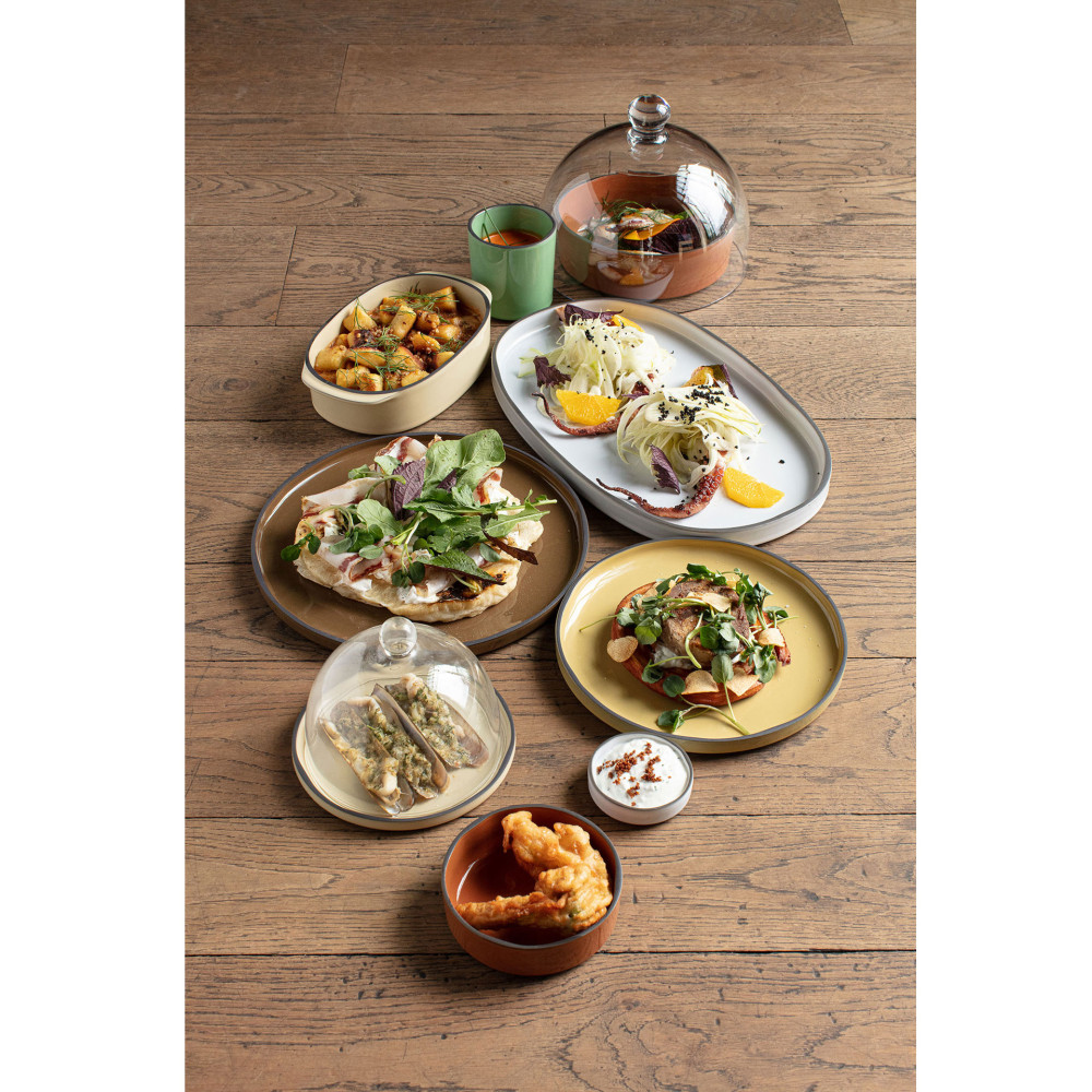 Porcelana CARACTERE stworzona ze specjalnie wyselekcjonowanej czarnej gliny, szkliwionej w jednej z siedmiu barw, ręcznie wykończonej tak aby uzyskać unikalnie kształtowany dla każdego egzemplarza - czarny rant. Elementy porcelany dostępne są w siedmiu kolorach inspirowanych przyprawami, mogą być dowolnie zestawiane utrzymując spójną tonację. Ponadto nadają się do sztaplowania, zaś płaskie dna gwarantują utrzymanie temperatury potraw.