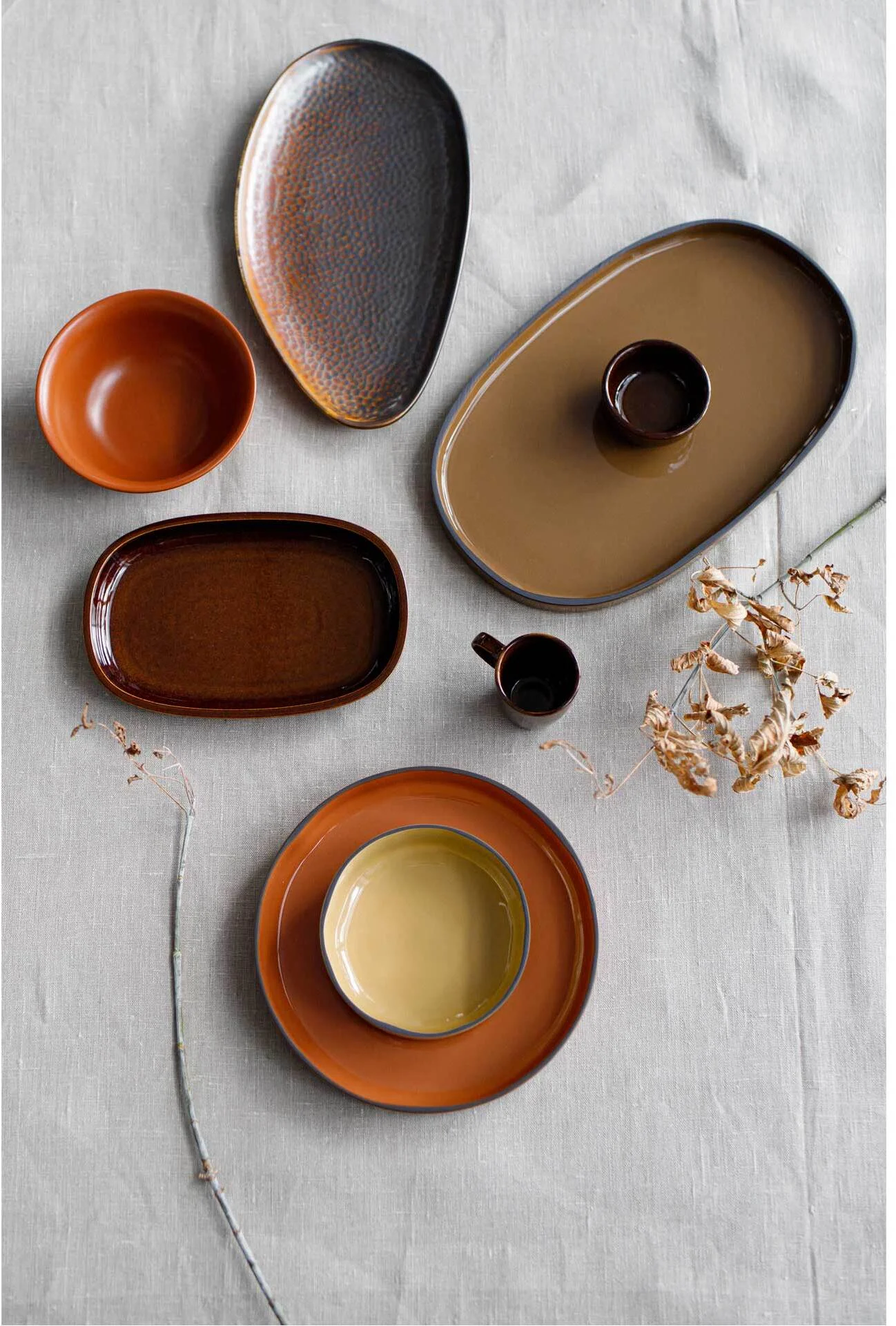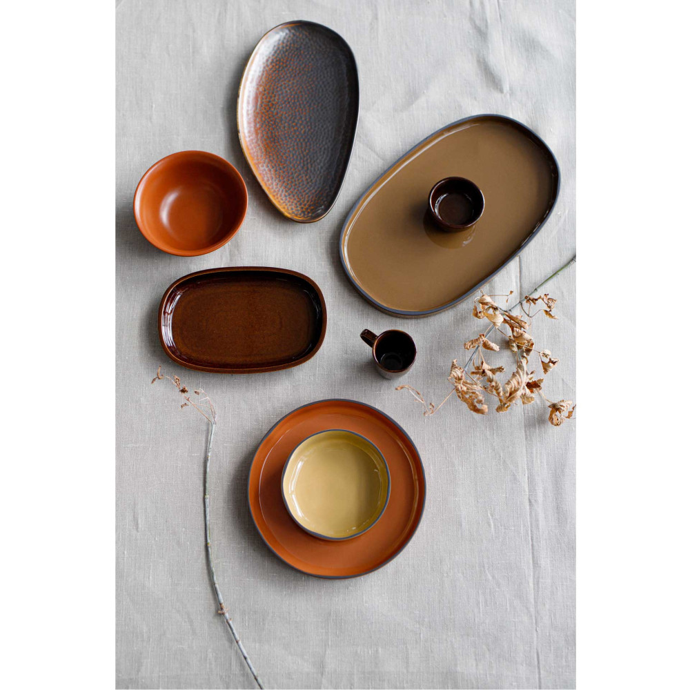 Porcelana CARACTERE stworzona ze specjalnie wyselekcjonowanej czarnej gliny, szkliwionej w jednej z siedmiu barw, ręcznie wykończonej tak aby uzyskać unikalnie kształtowany dla każdego egzemplarza - czarny rant. Elementy porcelany dostępne są w siedmiu kolorach inspirowanych przyprawami, mogą być dowolnie zestawiane utrzymując spójną tonację. Ponadto nadają się do sztaplowania, zaś płaskie dna gwarantują utrzymanie temperatury potraw.