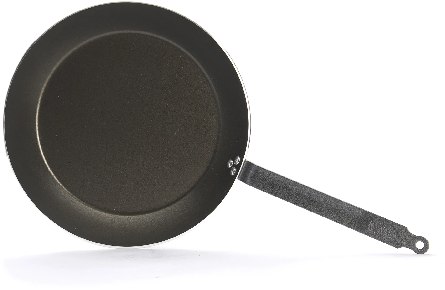 Stalowy nitowany uchwyt we francuskim stylu pokryty żywicą epoksydową jest niezwykle odporny na wysokie temperatury, dzięki czemu patelnia wraz z potrawą może być zapiekana w piekarniku.