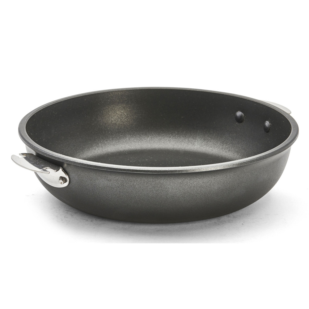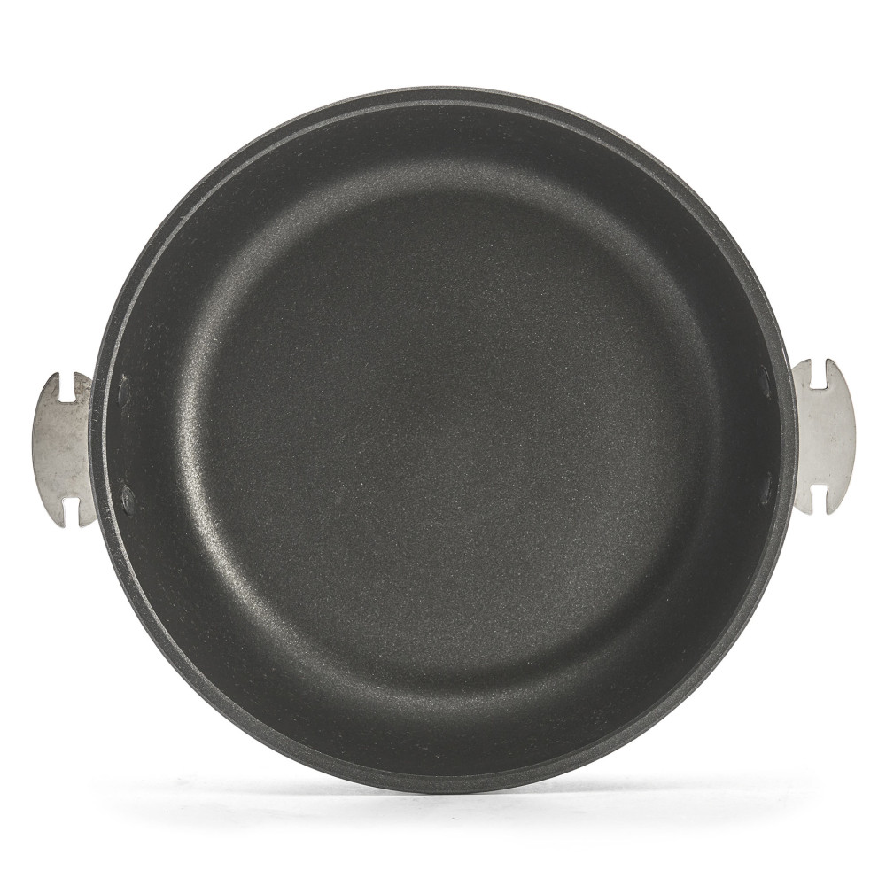 - Podwójnie nitowane uchwyty ze stali nierdzewnej gwarantują długoletnią użyteczność, stabilność naczynia oraz możliwość stosowania dwóch rodzajów uchwytów tj. stalowej rączki oraz drewnianych uchwytów (do kupienia osobno).