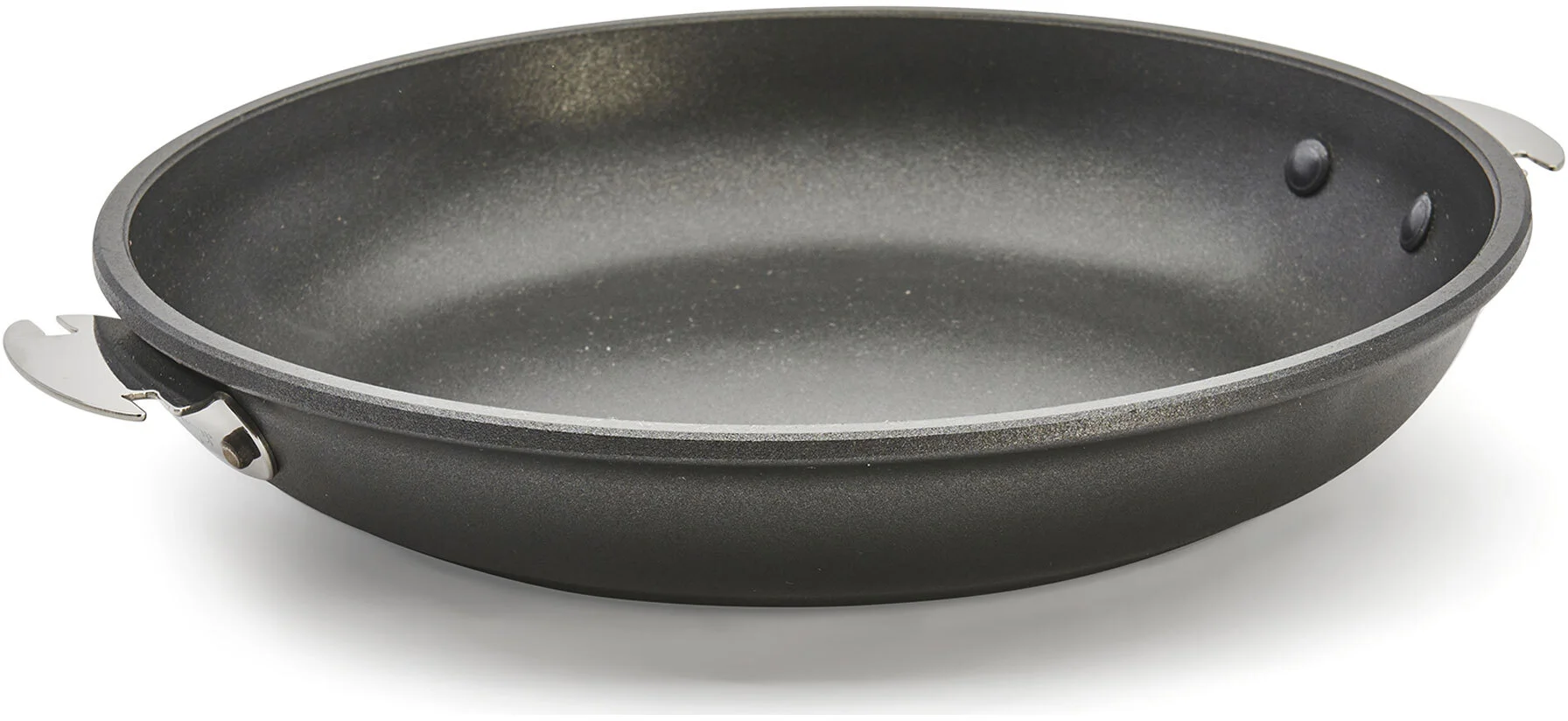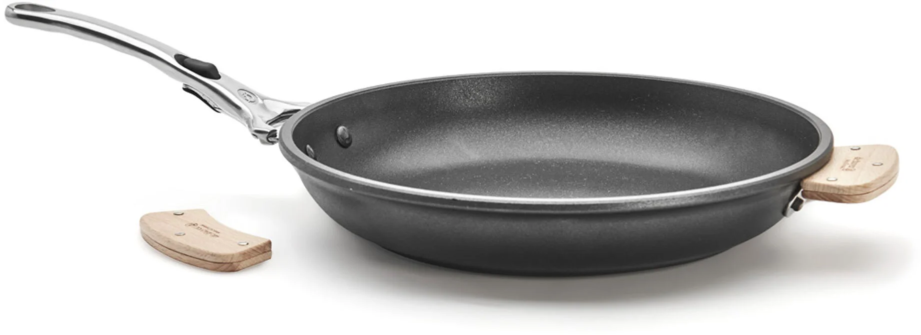 - Podwójnie nitowane uchwyty ze stali nierdzewnej gwarantują długoletnią użyteczność, stabilność naczynia oraz możliwość stosowania dwóch rodzajów uchwytów tj. stalowej rączki oraz drewnianych uchwytów (do kupienia osobno).