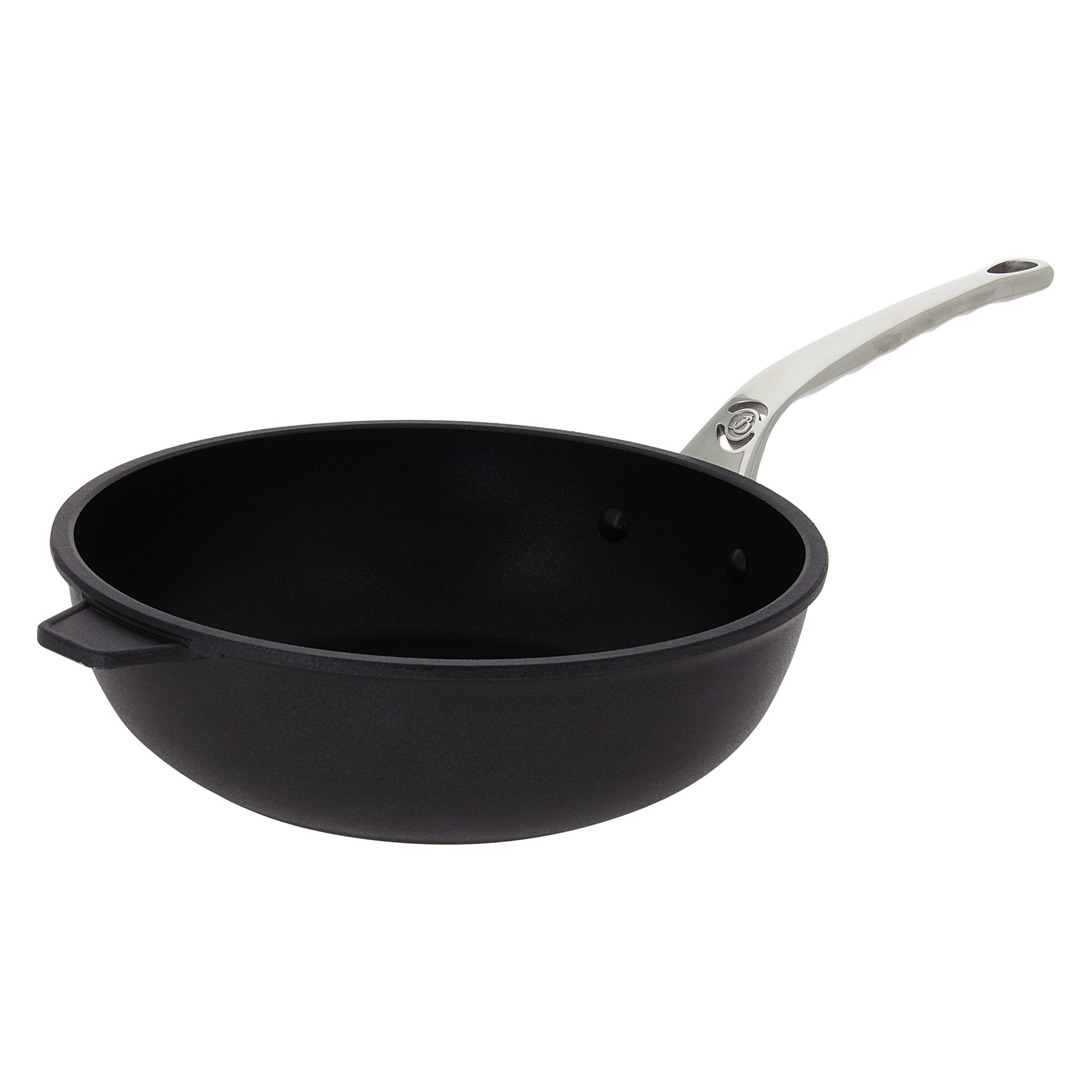 Ergonomiczna, nienagrzewająca się rękojeść rondla wykonana jest ze stali nierdzewnej. Dobrze chroni przed gorącem i nadaje patelni wyjątkowy wygląd. Uchwyt jest trwale nitowany, co producent potwierdza dożywotnią gwarancją. Trwałe nitowanie uchwytów to gwarancja wygody i długotrwałości rondla. Polerowany na wysoki połysk stalowy uchwyt doskonale prezentuje się w połączeniu z głęboką czernią powłoki non-stick.